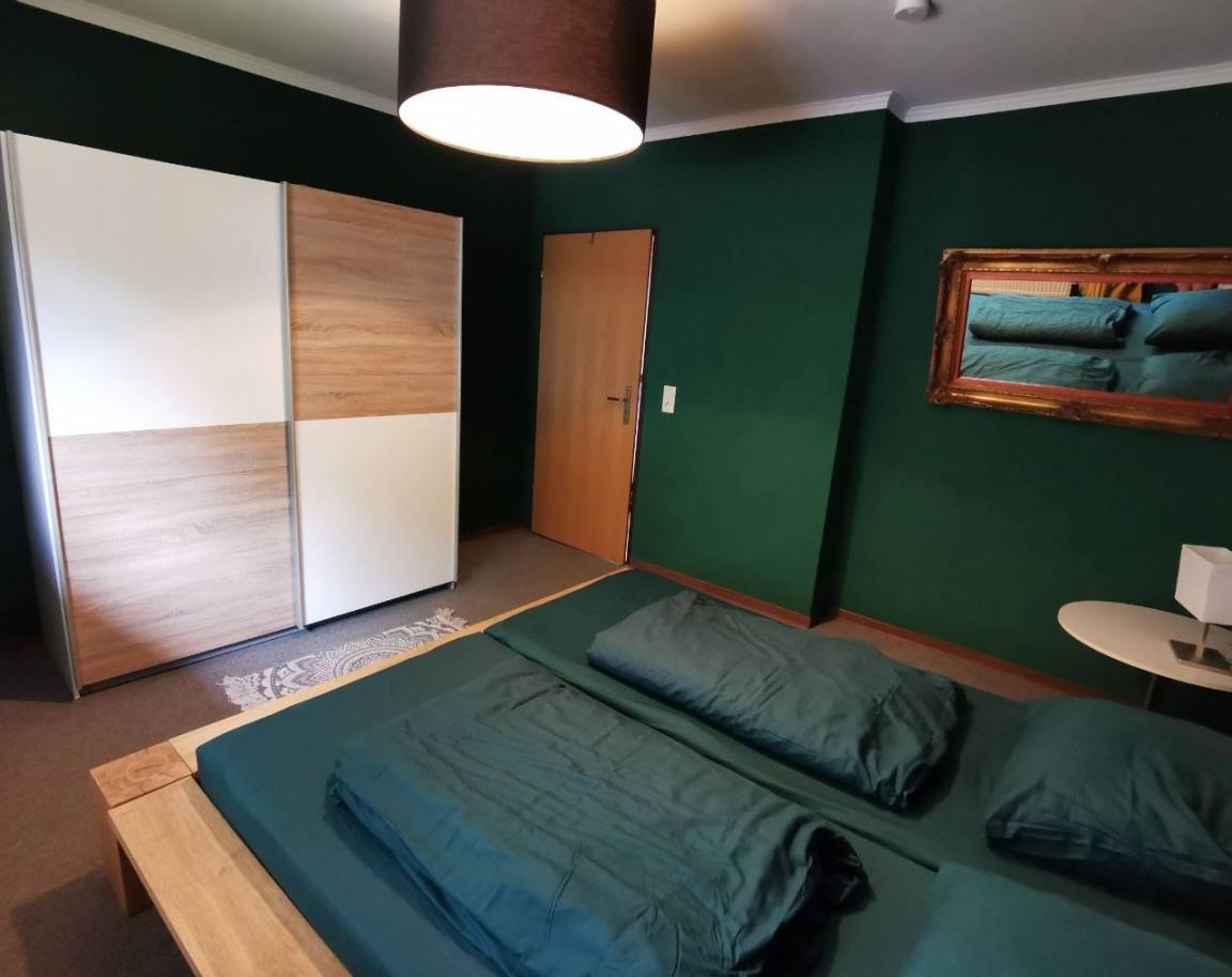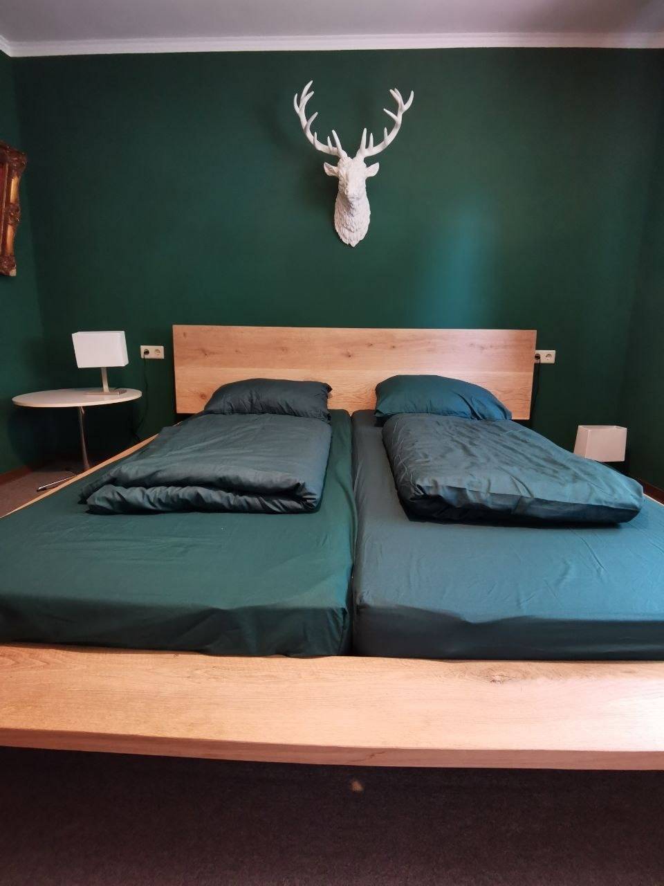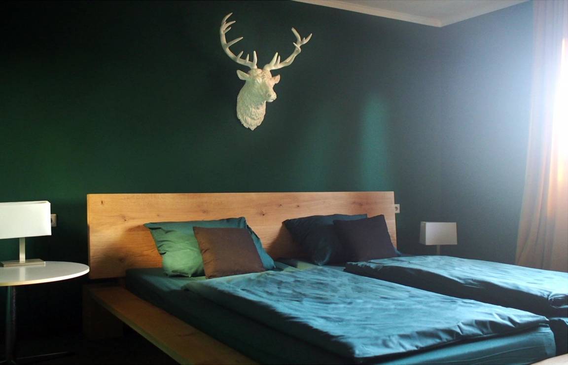 Das grüne Schlafzimmer im Untergeschoss ist mit einem großen Holzbett aus Wildeiche incl. Doppelmatratze eingerichtet. Ein majestätischer Hirschkopf wacht an der Wand über den Schlaf der Gäste, Samtvorhänge und Plissees dämpfen das Licht und tragen zur Wohlfühlatmosphäre bei.