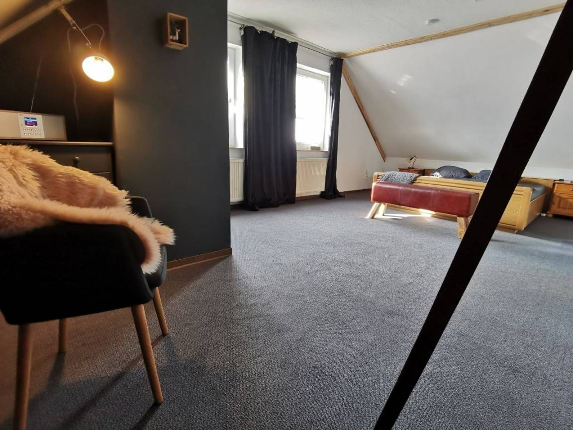 Im großen Schlafzimmer gibt es gemütliche Holzbalken und ein geräumiges Doppelbett aus massiver Akazie in Balken-Optik, ein bequemer Ohrensessel bietet eine zusätzlichen Rückzugsmöglichkeit. Die klare Raumstruktur sorgt für angenehme Atmosphäre. Samtvorhänge und Plissees an den Scheiben sorgen für erholsamen Schlaf.