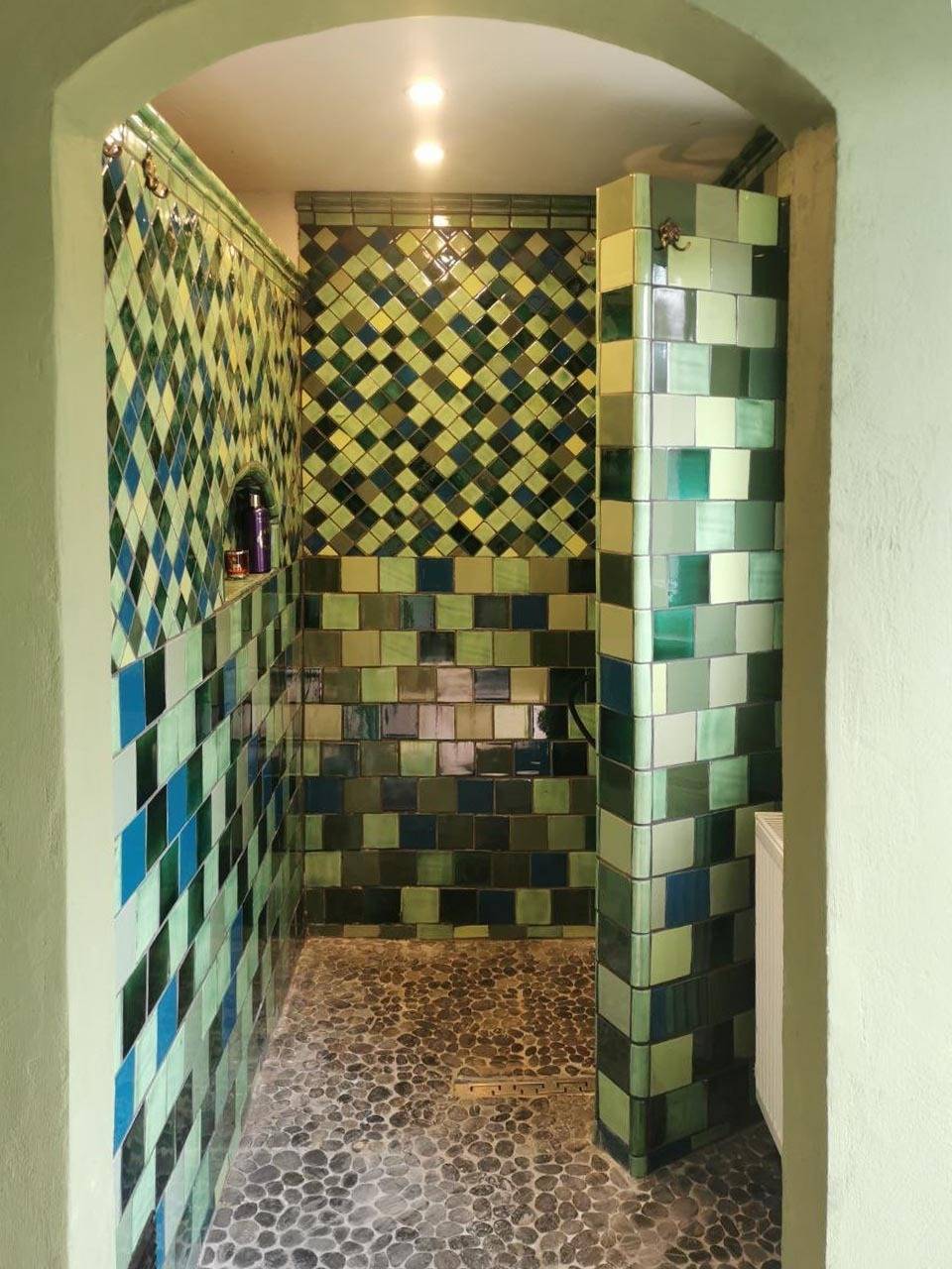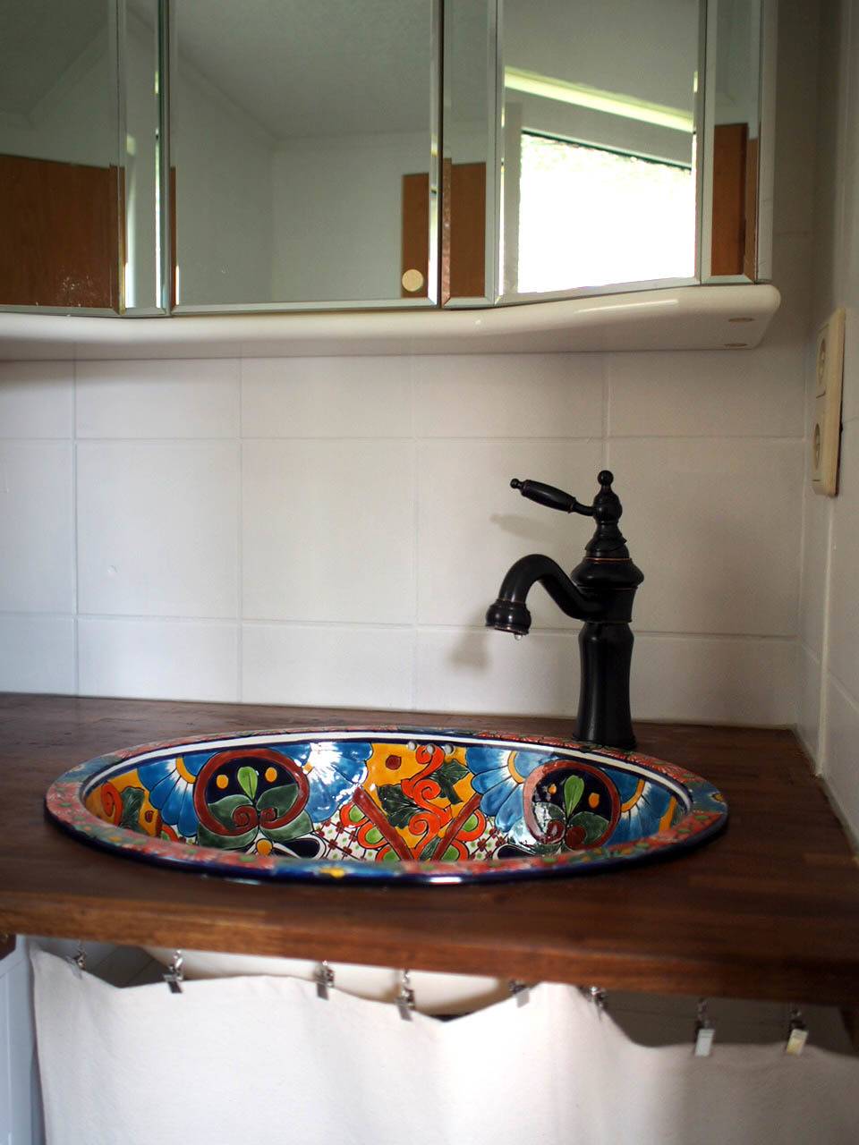 Auch die Küche wurde liebevoll umgestaltet. Holzregale aus alten Eichenbrettern beherbergen Geschirr und Töpfe. Bunte, handgemachte Küchenfliesen und eine Akazienholz-Arbeitsplatte laden zu kreativen Koch-Events ein.