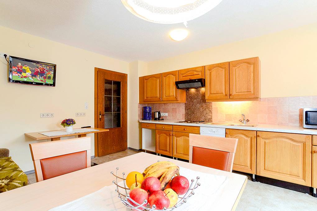 Haus: Komfortables Ferienhaus mit 3 freundlich eingerichteten Apartments, die nur zusammen vermietet werden. Es ergibt sich ein 10-Zimmerhaus mit ca. 215 qm Wohnfläche über 2 Etagen. Gemeinschaftliches Kochen und Essen im großen Apartment in der 1. Etage. Nichtraucherhaus. Alle Apartments mit komfortabler Einrichtung, Sat-TV, Balkon mit schönem Panoramablick ins Tal. Zentralheizung. Ski-/Schuhraum mit Schuhtrockner. Kostenloser Internetzugang über W-Lan. Separate Einliegerwohnung im Parterre. 5 Pkw-Stellplätze am Haus.