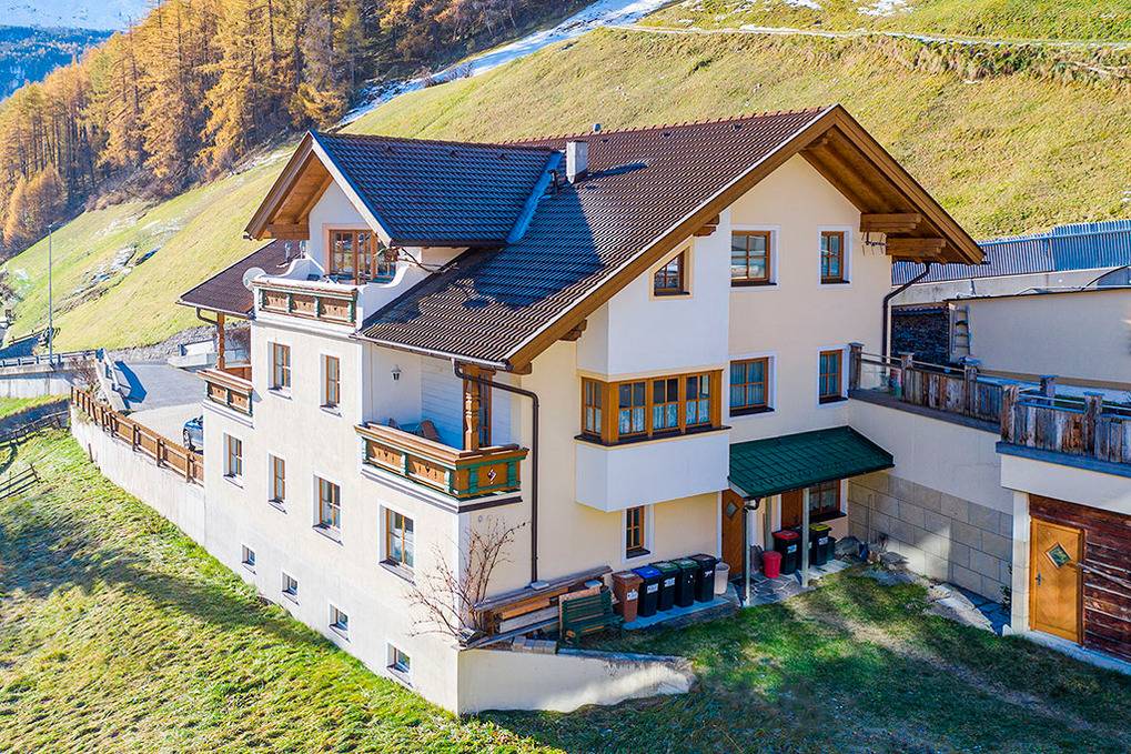 Ort: Sölden. Ruhige, dennoch zentrale Lage im Ort. Geschäfte, Restaurants 200 m. Gondel ins Wandergebiet Gaislachkogel 400 m.