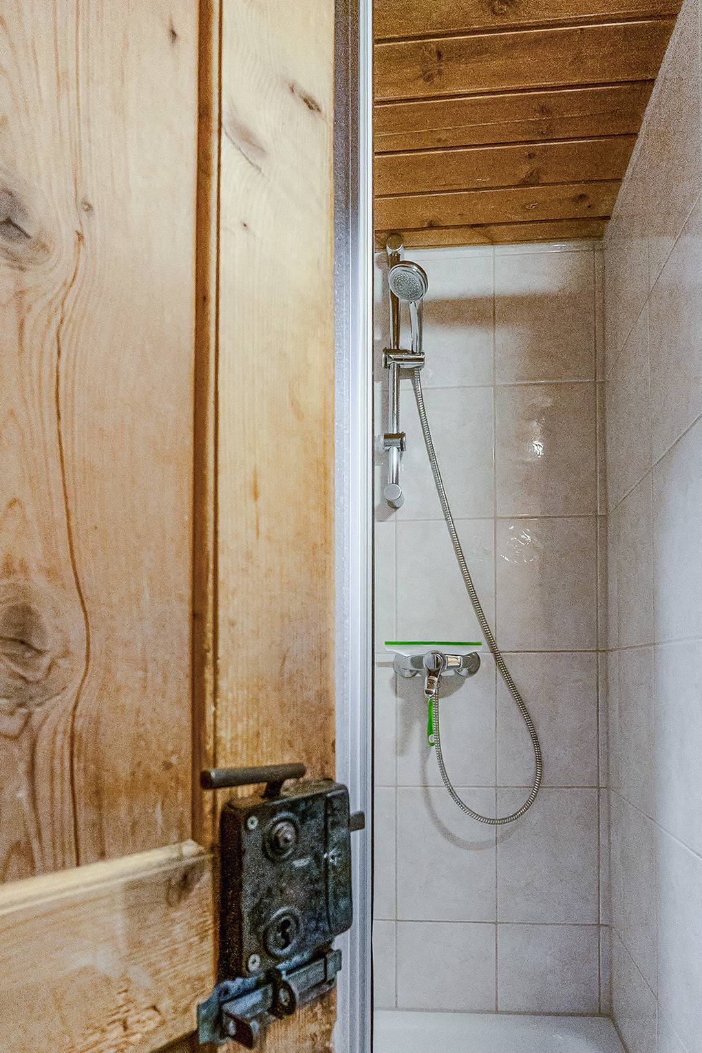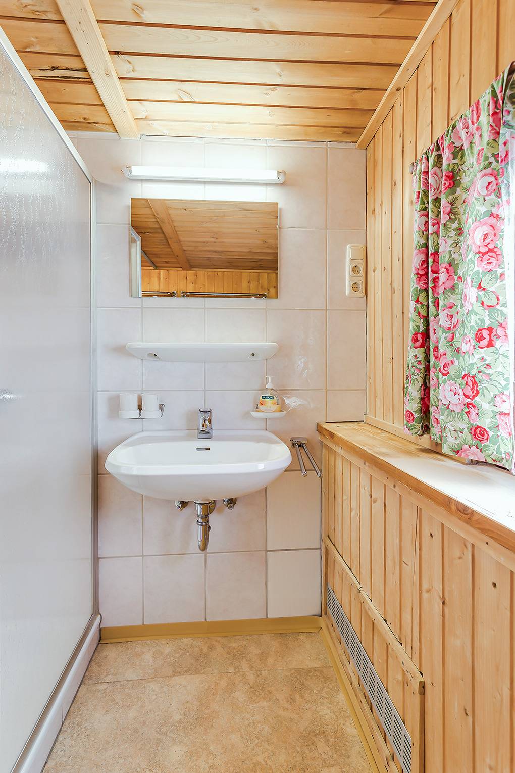 Parterre: Schöner Wohn-/Essraum mit Kaminofen, Sat-TV, Esstisch. Separate Küche mit gut ausgestatteter Küchenzeile (Backofen, Spülmaschine). Bad mit 2 Duschen, 1 Waschbecken. 2 separate WC.
