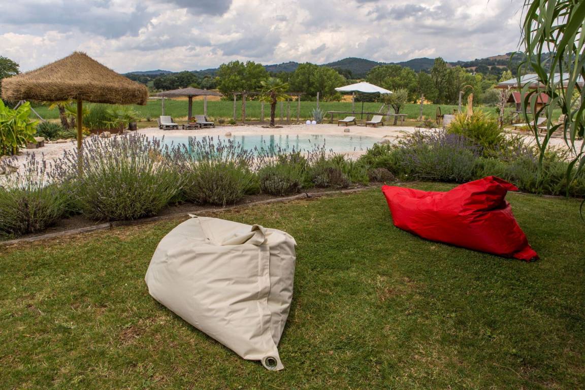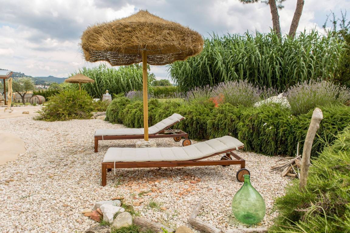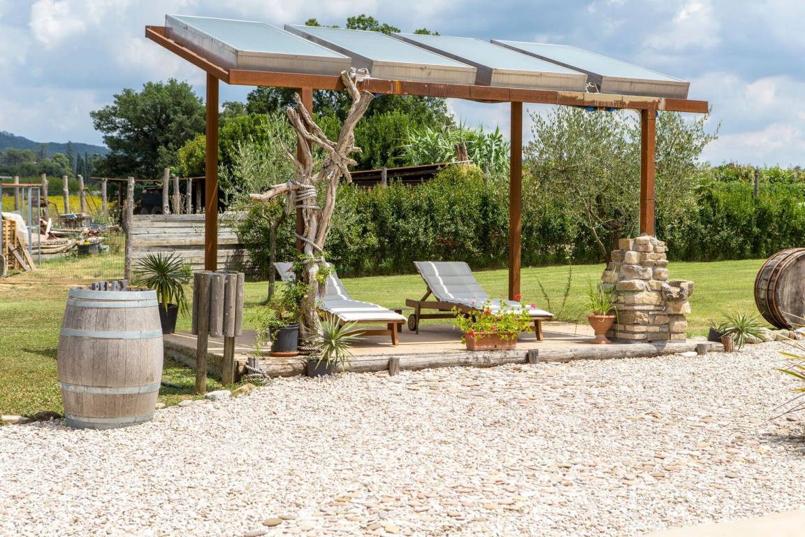 Garten: Schwimmbad (privat, Breite: 14m, Länge: 9m, Tiefe: 1.4m, Außen), Dusche, Grill, Außenbereich für das Essen im Freien, Esstisch (Personen: 14), Pavillon, Gartenmöbel, Sonnenliege, eingezäunt.