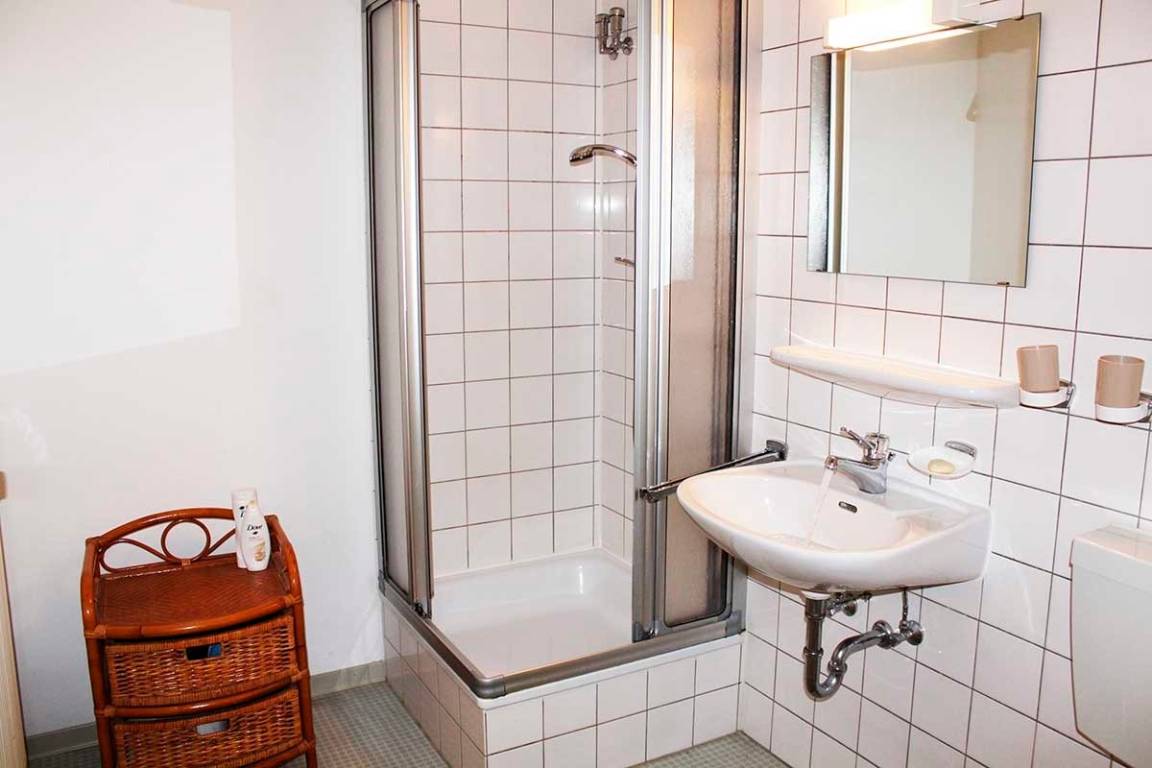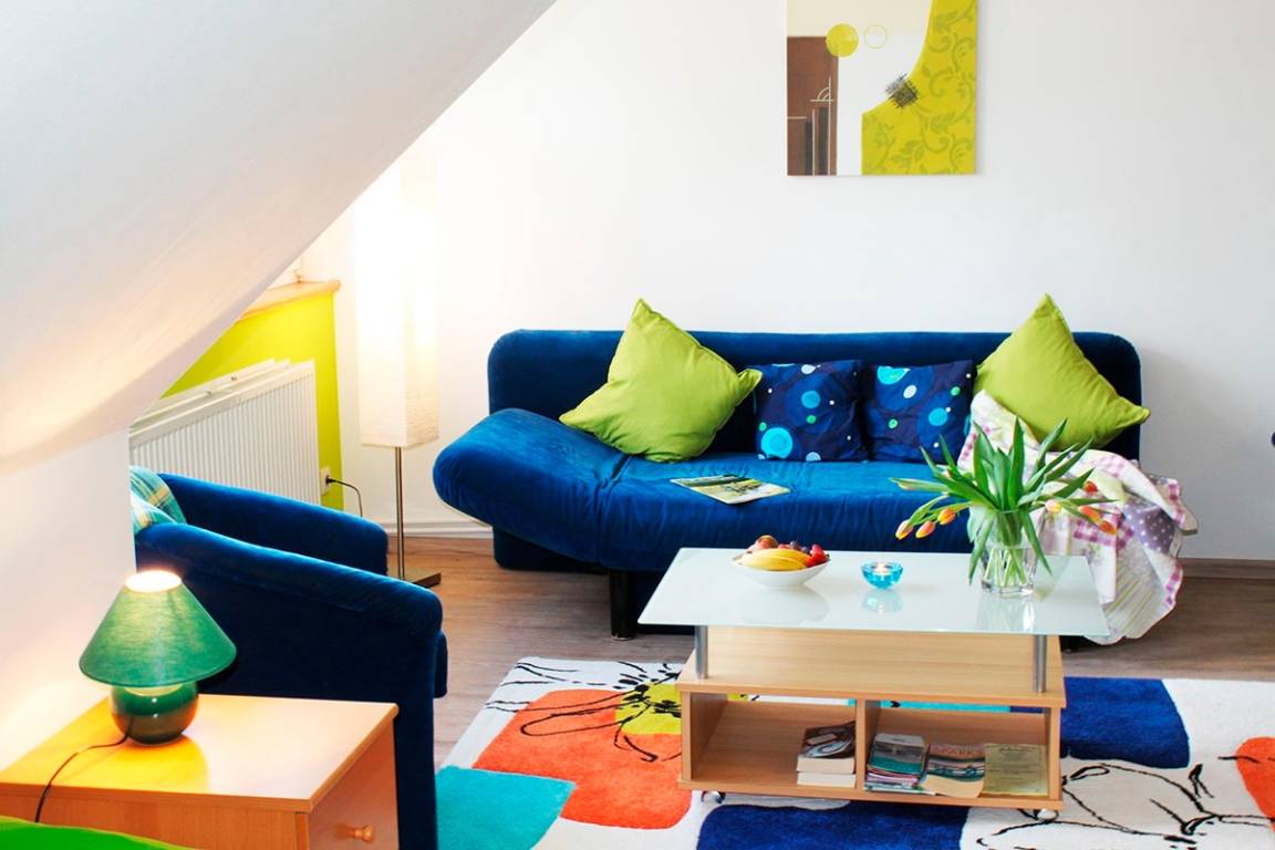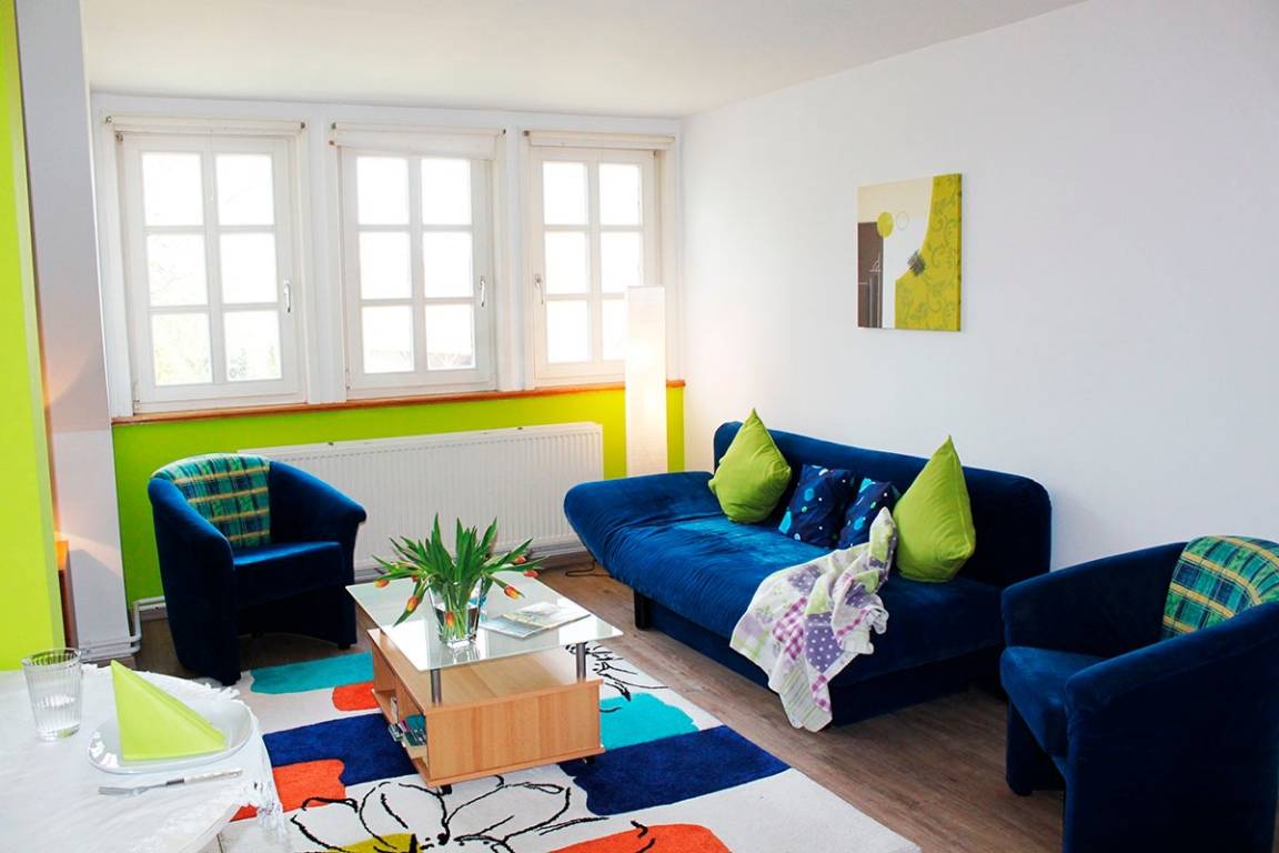 Das Appartement "blau" liegt im 1. Obergeschoss und bietet Platz für 2-3 Personen. Es ist modern eingerichtet und ausgestattet. Im kombinierten Wohn-Schlafraum finden Sie ein Doppelbett, eine großzügige Sitzecke mit Schlafsofa, Esstisch und Küchenzeile. Der Flur bietet ausreichend Abstellmöglichkeit. Ein Bad mit Dusche/WC steht Ihnen zur Verfügung.