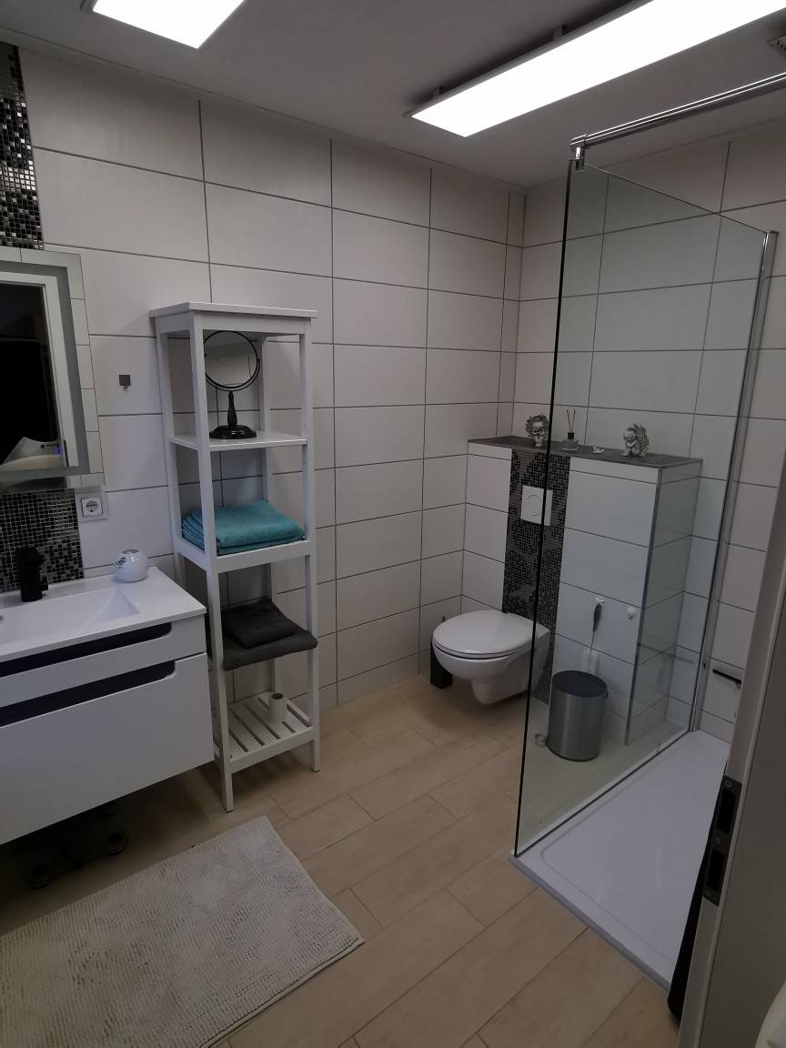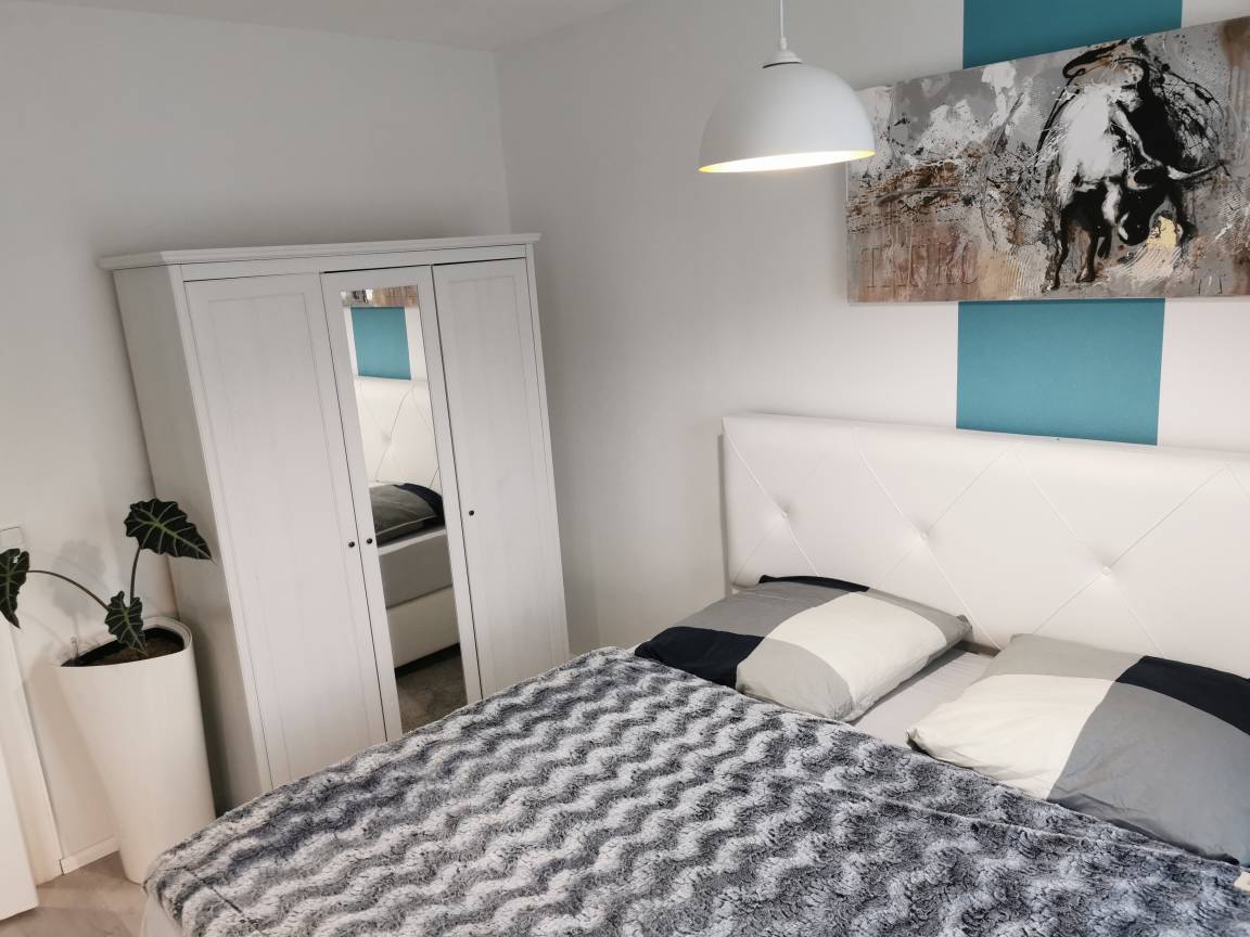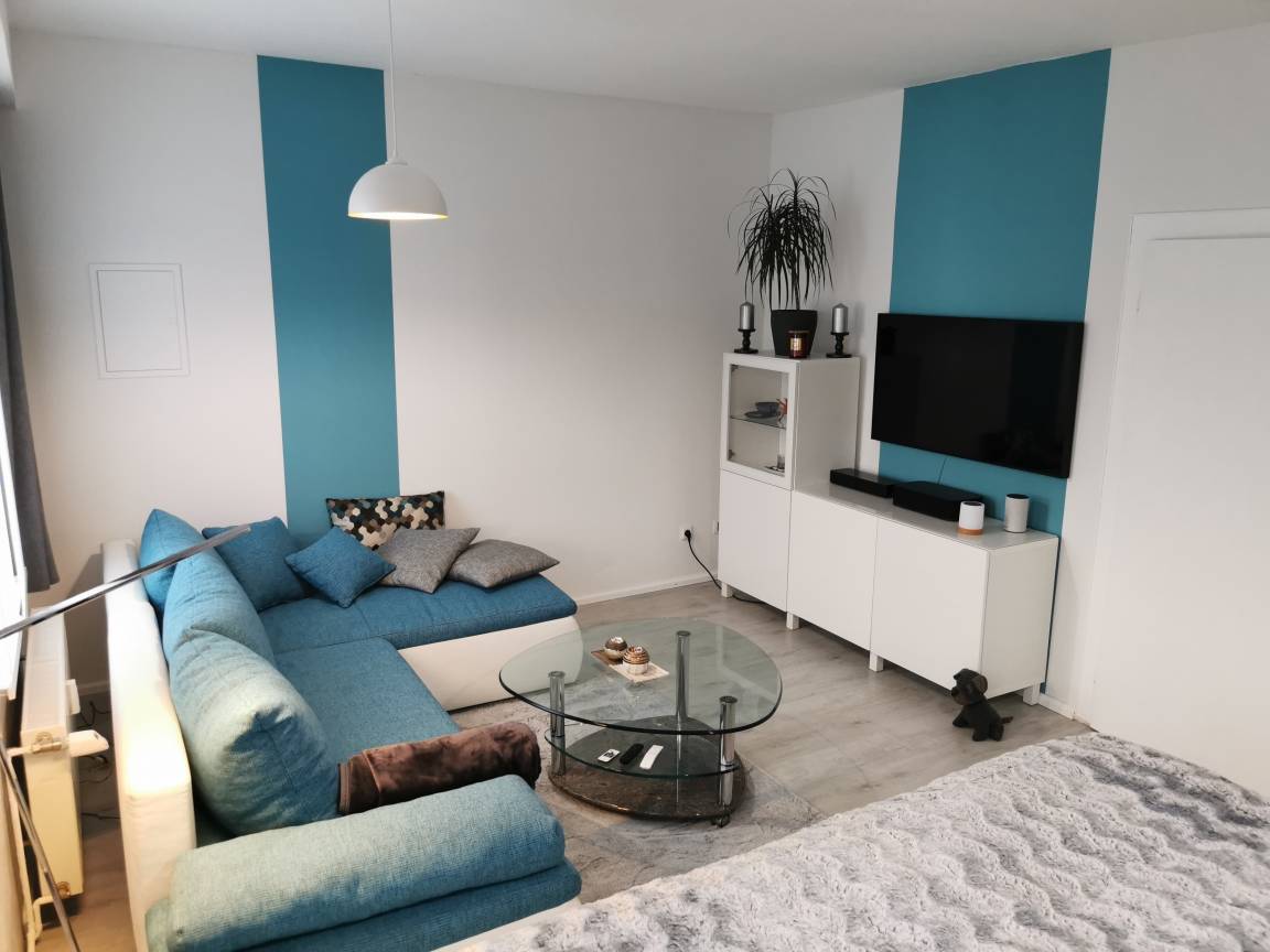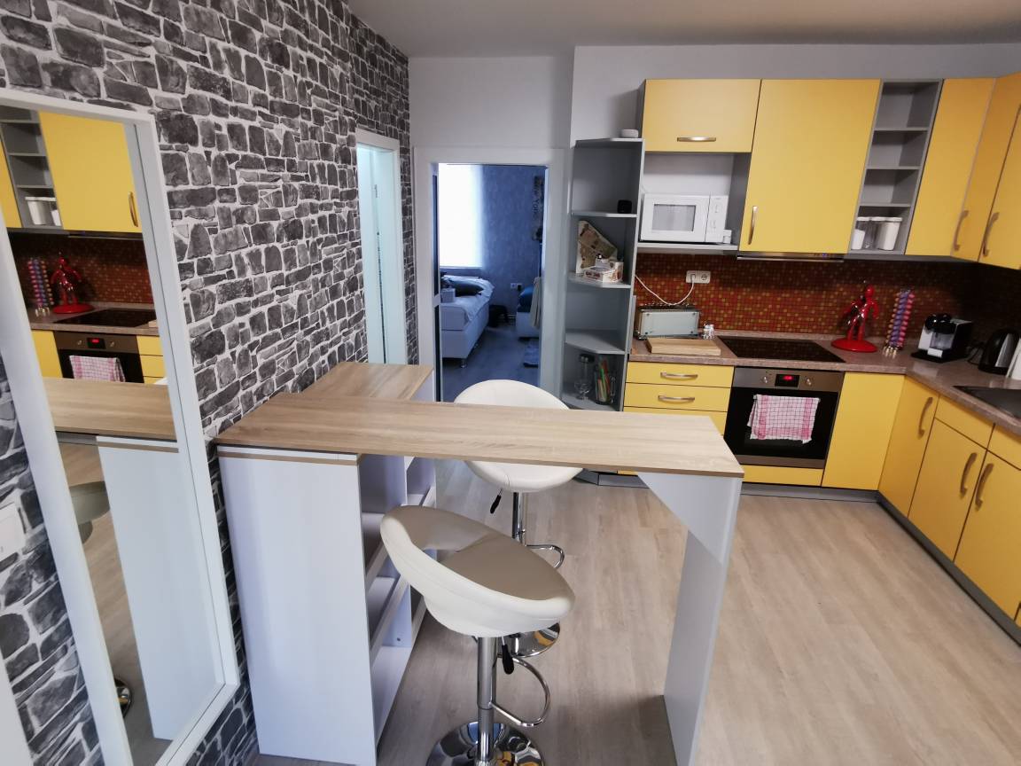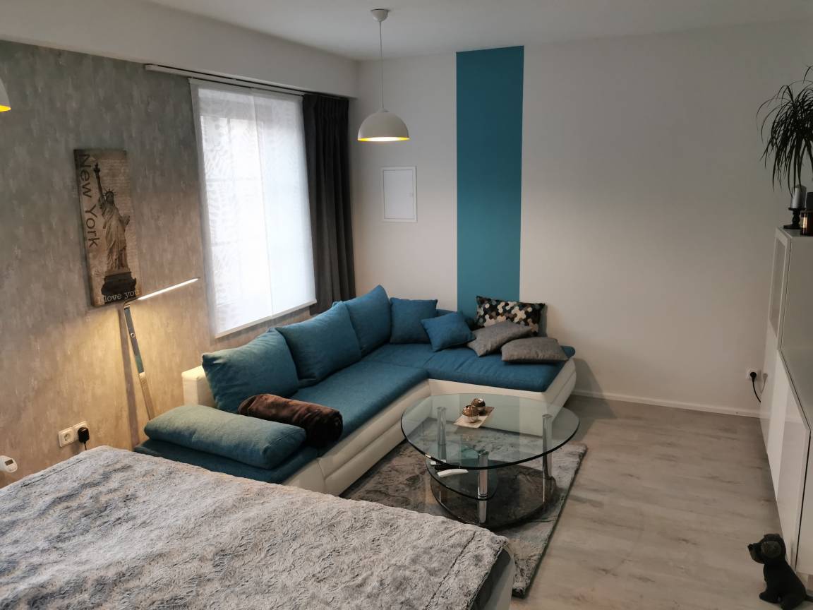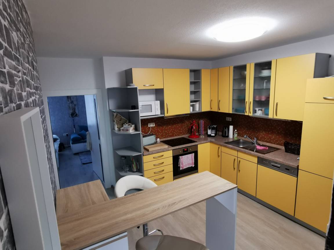 Die Wohnung selbst ist ausgestattet mit einer vollwertigen Eck Küche zeile mit Backofen Mikrowelle Geschirrspüler, Espressoautomat, Toaster usw.. Der Essplatz besteht aus einer ausklappbaren Bar Theke mit 2 Barhockern. Das Bad hat eine begehbare Dusche für 2 Personen mit Regendusche. Ebenso ist in einem Abstellraum eine Waschmaschine vorhanden und einen Wäschetrockner. Das Wohnzimmer verfügt über eine Eck Couch die 2 Schflafplätze bereitstellt. Darüberhinaus befindet sich in den Wohn/Schlafraum ein 180x200cm grosses Boxspringbett mit einem Kleiderschrank, ein Wohnzimmerschrank und einem Couchtisch und einem Flach TV mit DVD Spieler und verschiedene Beleuchtungsmöglivhkeiten die auch über Sprachbefehle mit Alexa gesteuert werden können.