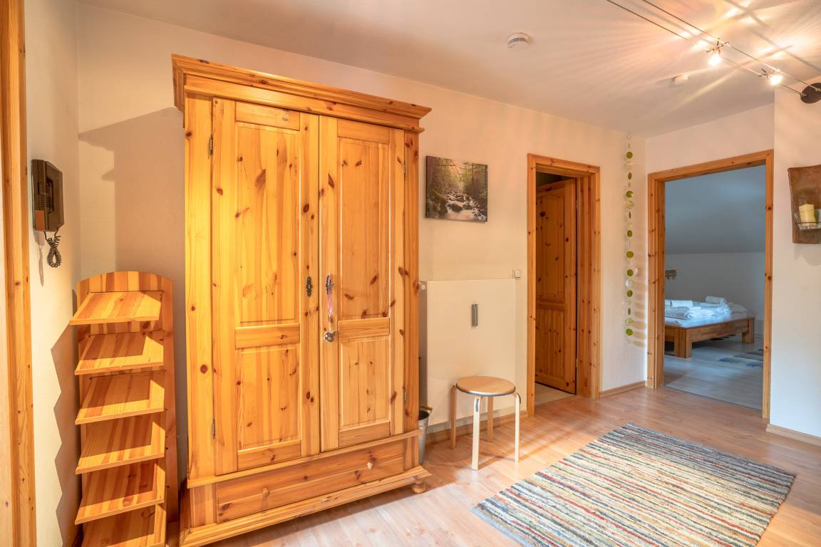 Die Wohnung verfügt über einen Wohnraum mit gemütlicher Essecke. Das Badezimmer mit Dusche und Waschbecken sowie ein WC. Ein großzügige Schlafzimmer bietet ein Doppelbett, sowie einen großen Kleiderschrank. Im 2. Schlafzimmer finden Sie ein französisches Bett und einen Kleiderschrank. Vervollständigt wird die Ferienwohnung durch eine gut ausgestattete Küche. Genießen Sie schöne Stunden auf dem Balkon, welcher über den Flur betreten werden kann.