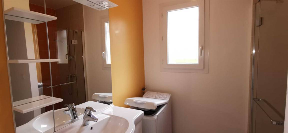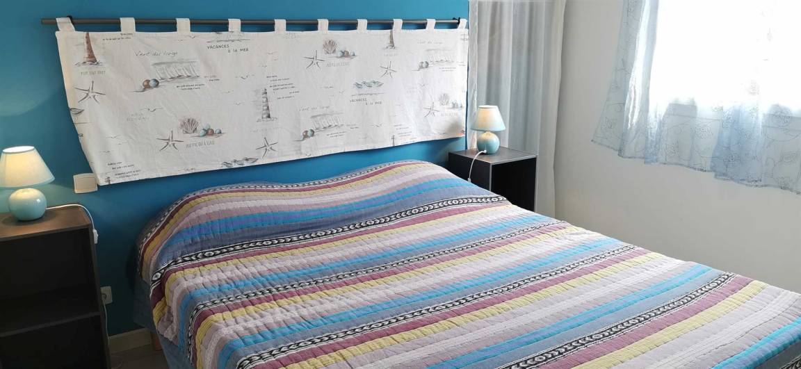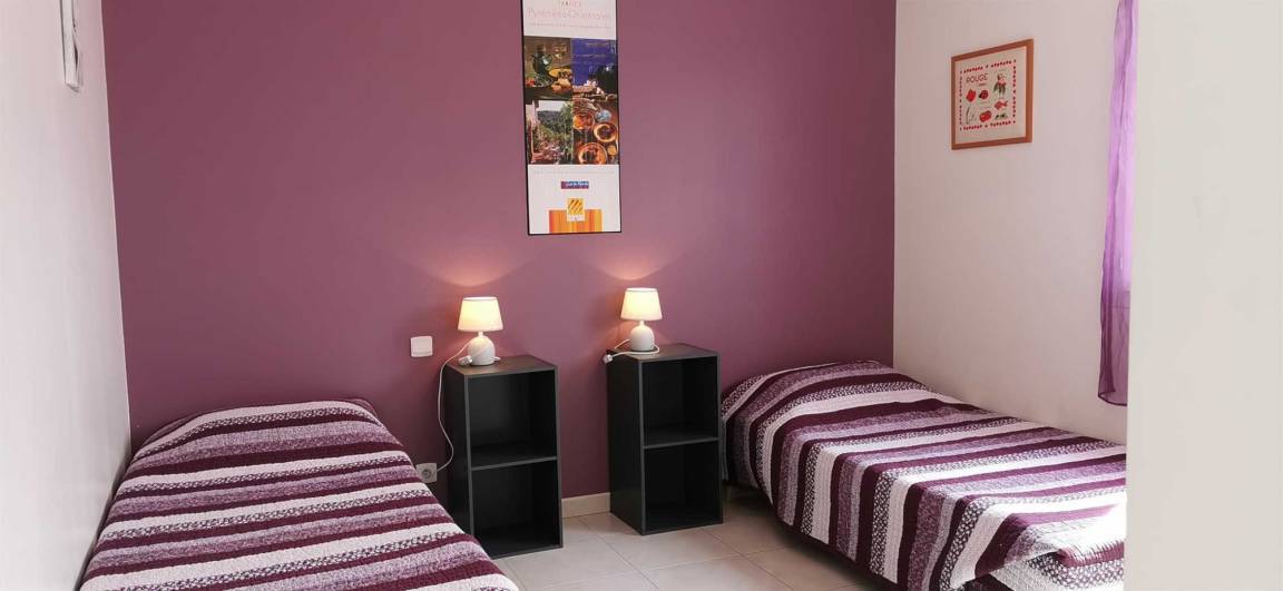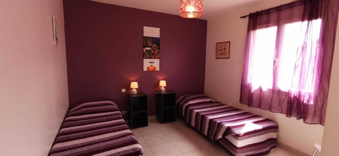 Ein klimatisiertes Schlafzimmer mit drei Einzelbetten (90 cm). Ein klimatisiertes Schlafzimmer mit einem Doppelbett (160 cm). Duschbad mit WC.