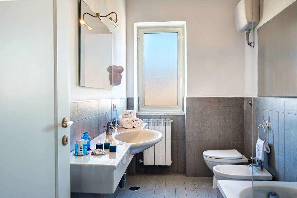 Badezimmer 1: Waschbecken, WC, Bidet, Dusche.
