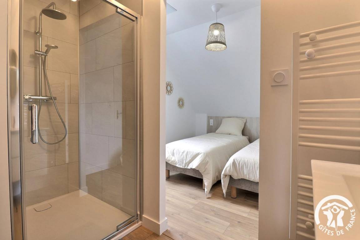 - Schlafzimmer mit zwei 80x200 cm großen Betten, die zu einem Doppelbett zusammengestellt werden können, und eigenem Duschbad