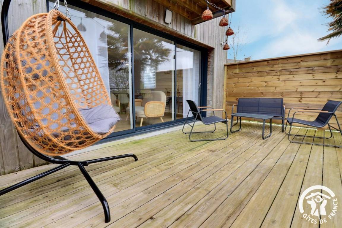 - private Terrasse mit Gartenmöbeln, Schaukel und Grill