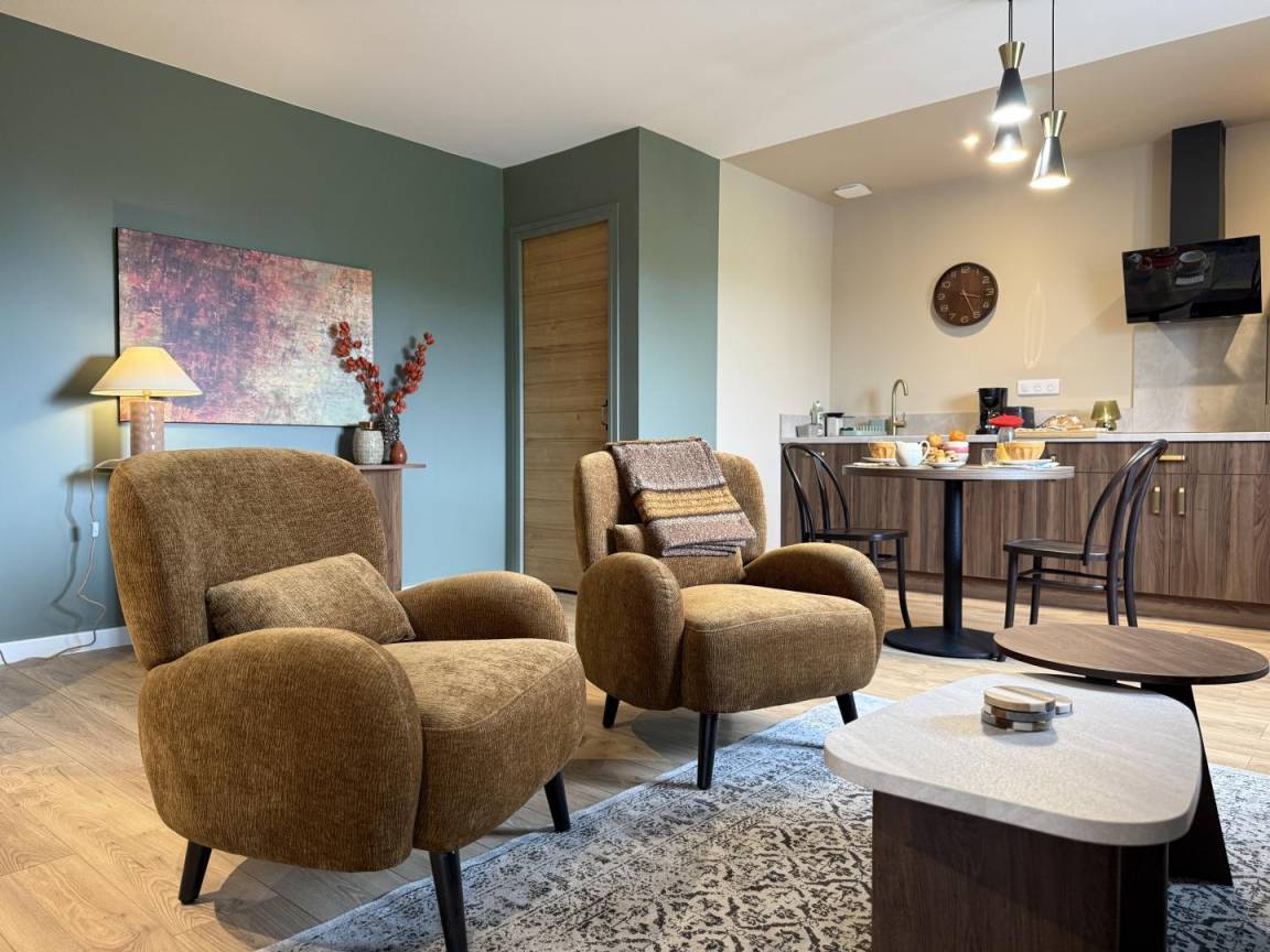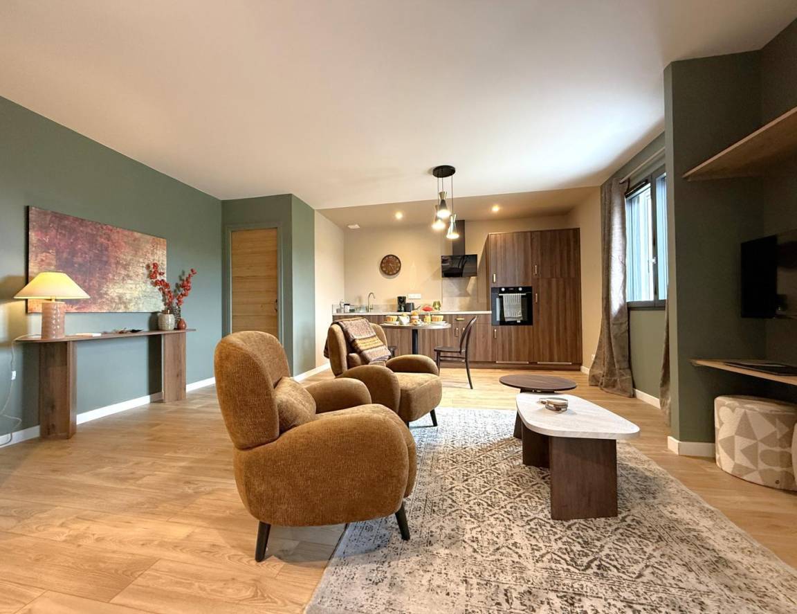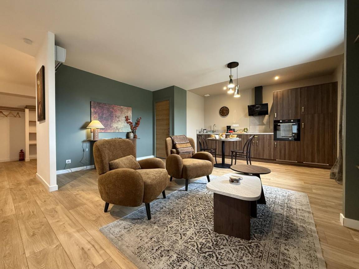 - ein Wohnzimmer mit voll ausgestatteter Küche (Induktionskochfeld, Kühlschrank, Backofen, Geschirrspüler, Mikrowelle, Waschmaschine), ein Wohnbereich und eine Sitzecke