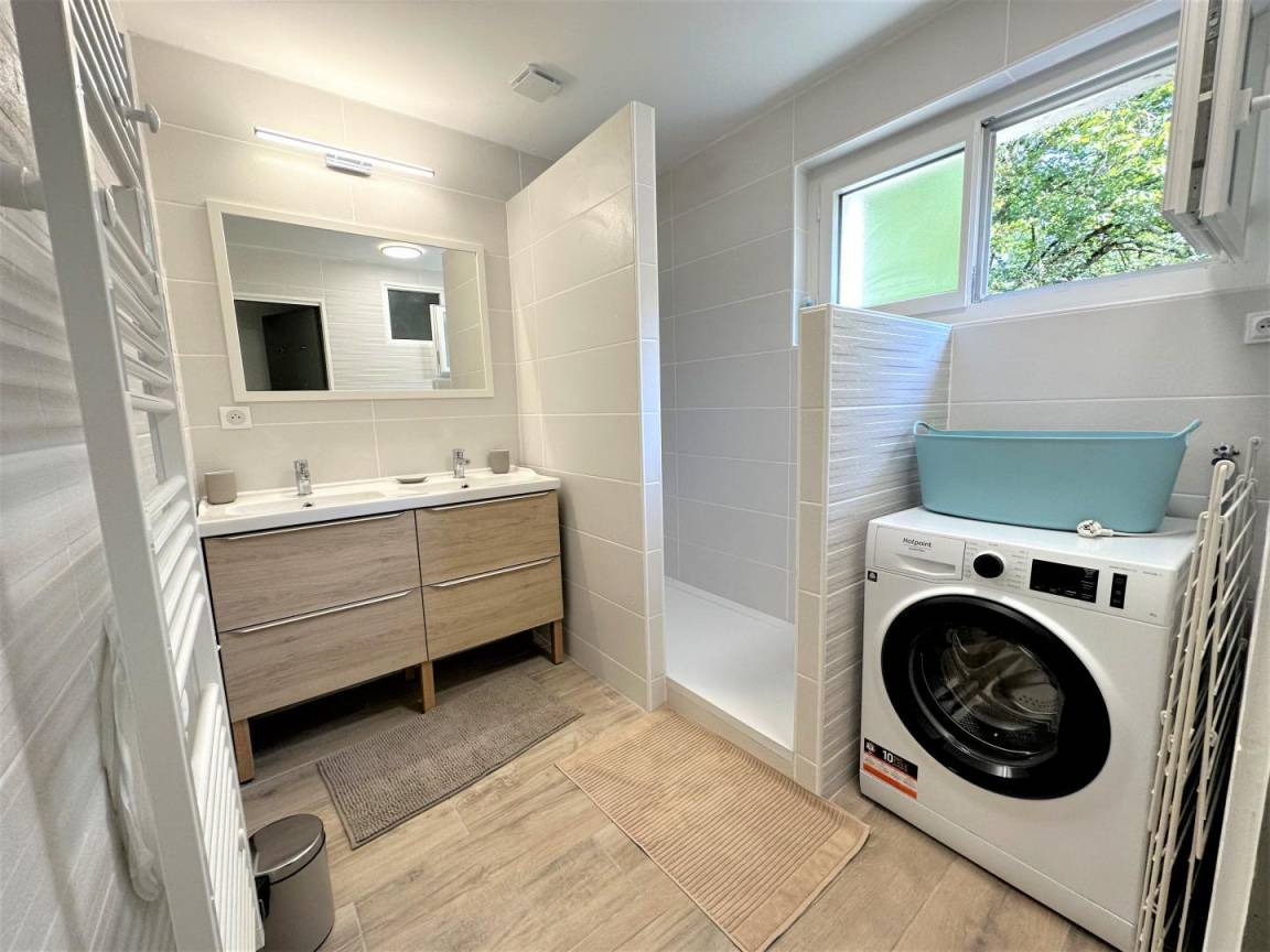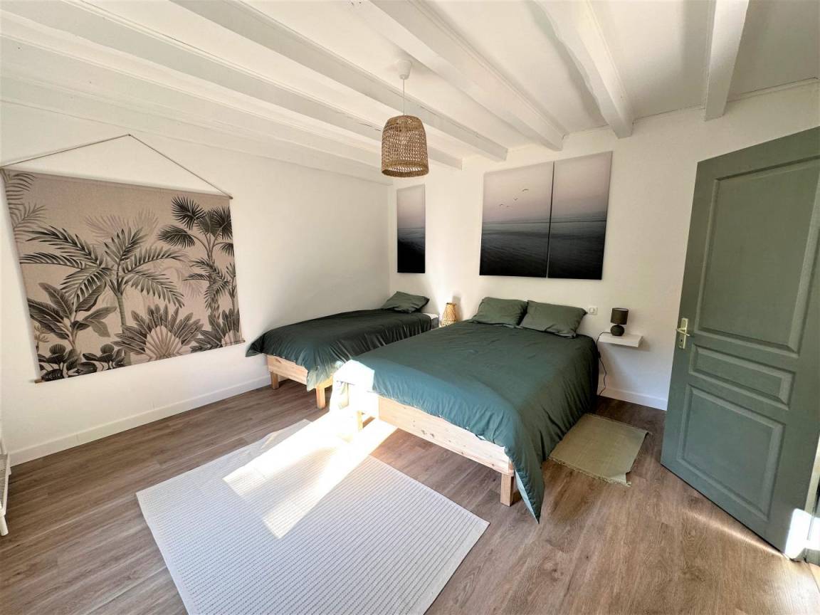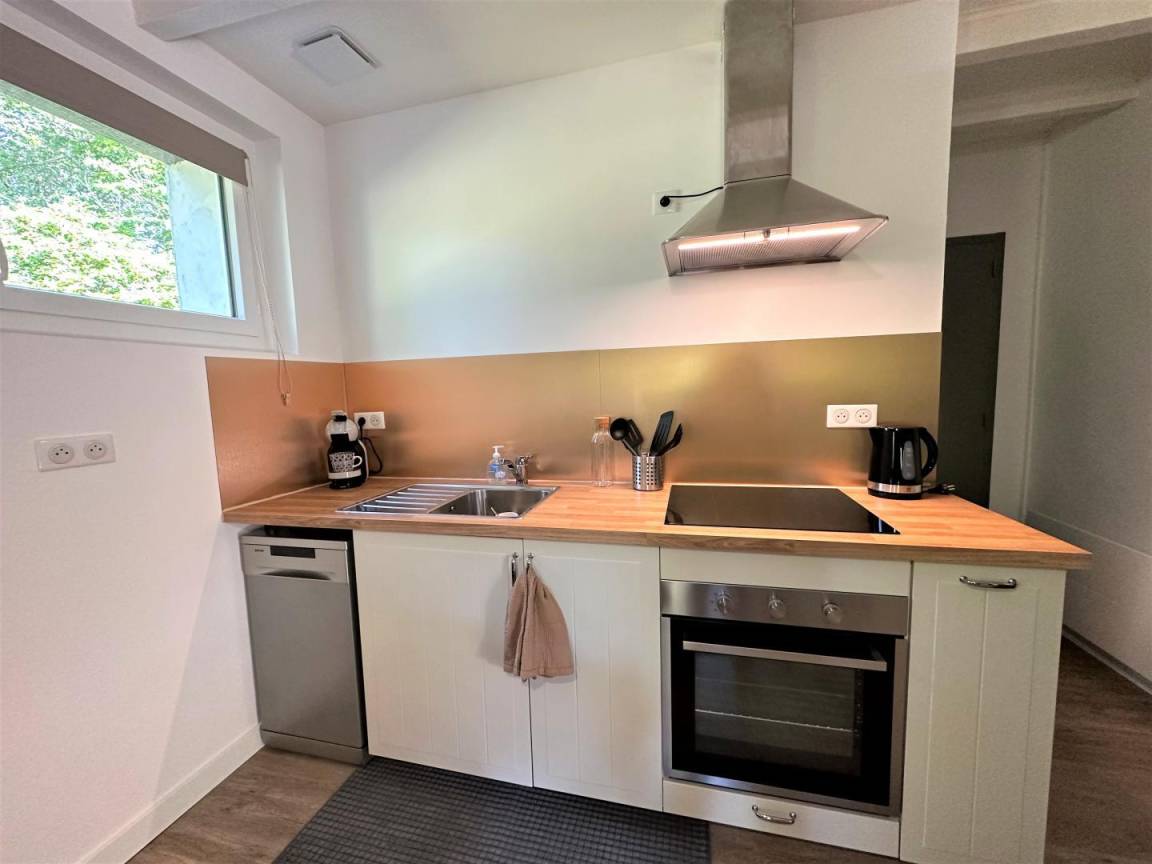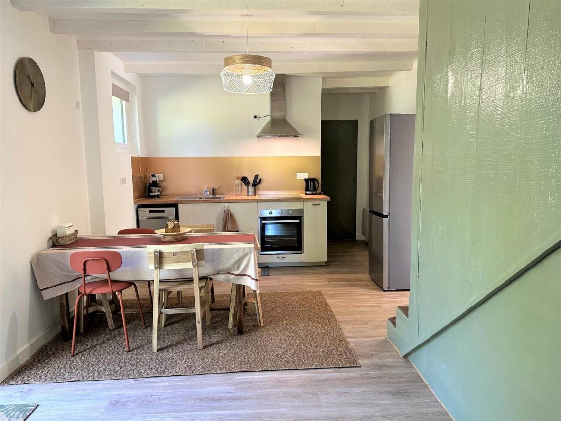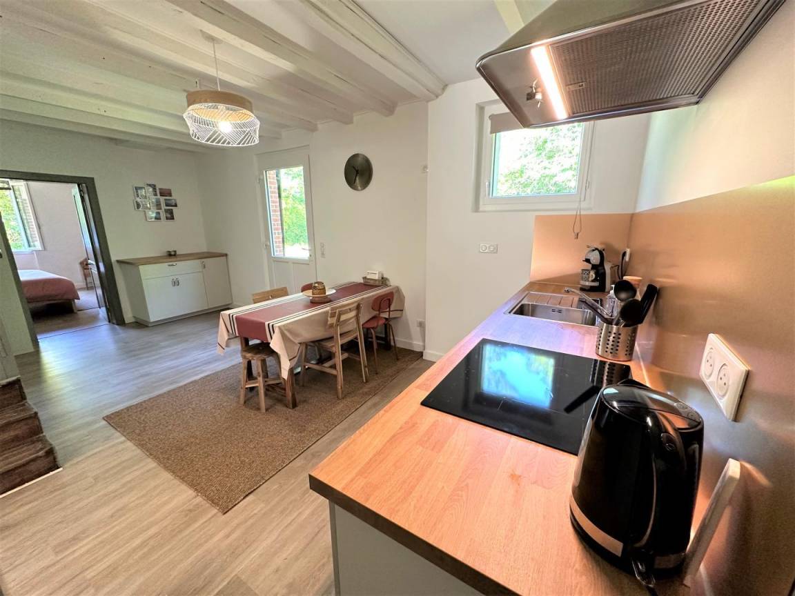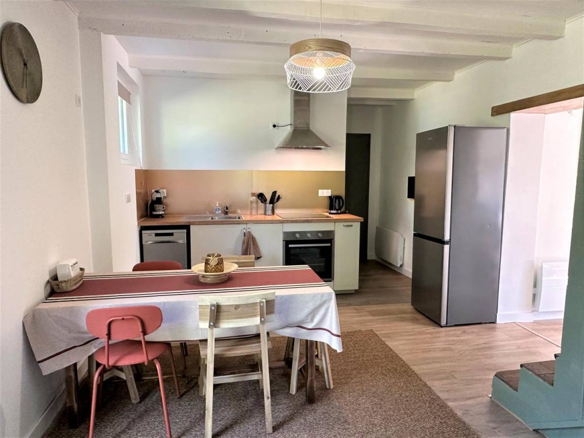 Dieses unabhängige Haus besteht aus einem Wohnzimmer mit Esszimmer und Lounge (TV, WIFI), einer ausgestatteten Küche (Induktionskochfeld, Dunstabzugshaube, Geschirrspü