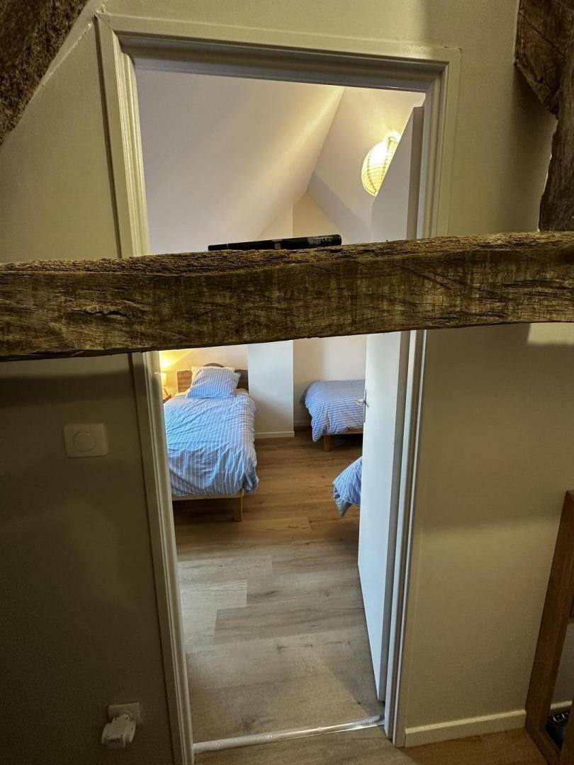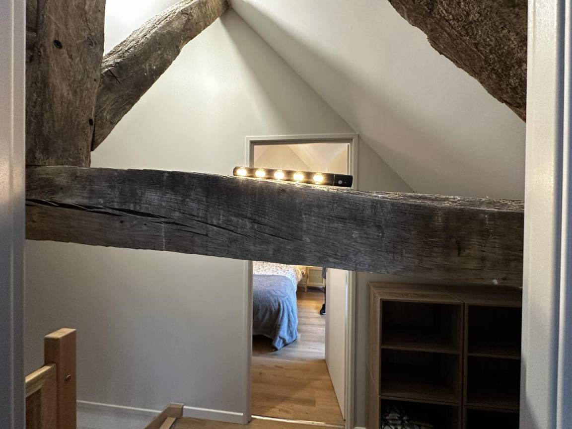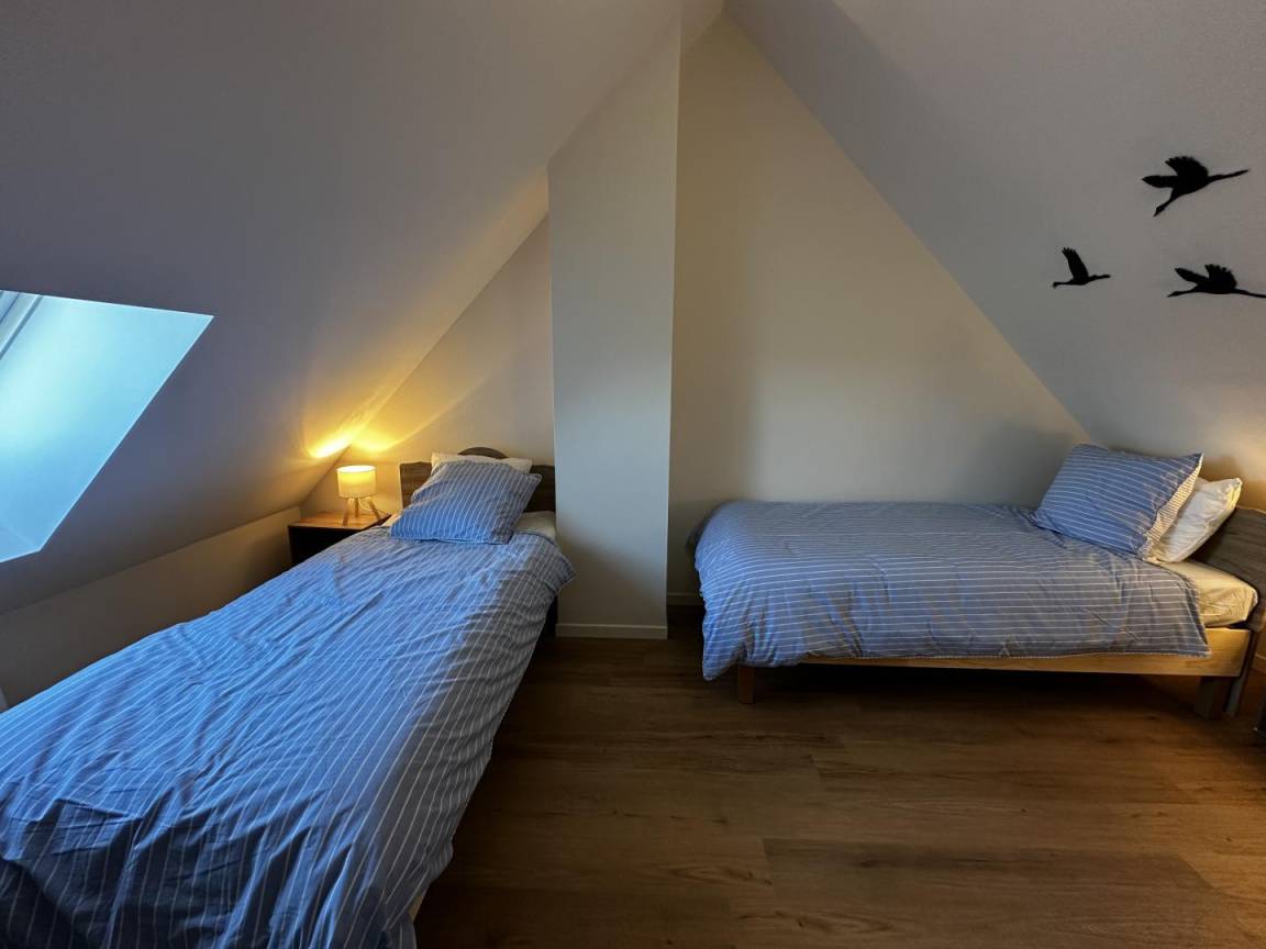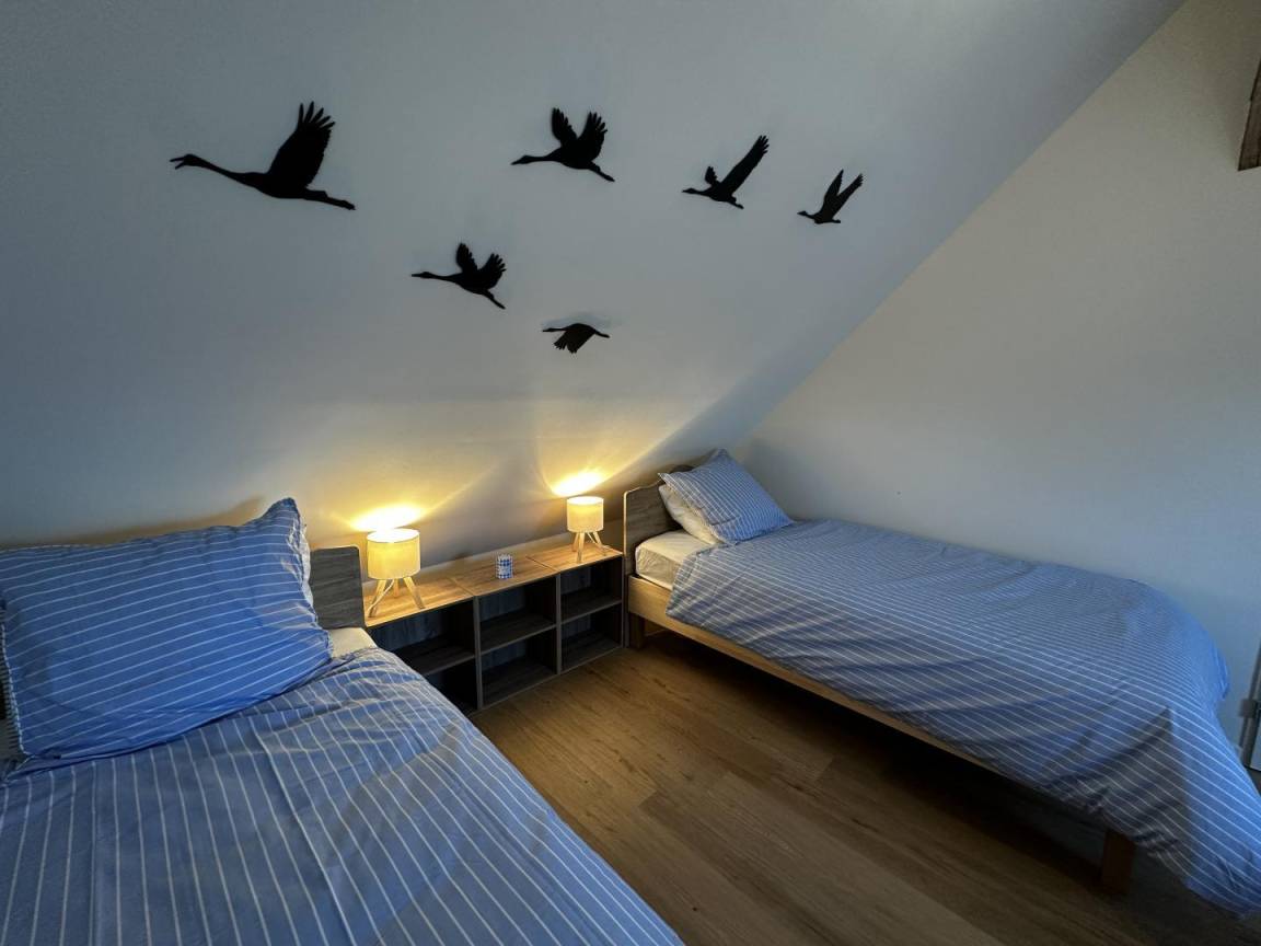 Obergeschoss: Über eine Innentreppe gelangt man in das Obergeschoss mit zwei Schlafzimmern, die jeweils Platz für zwei Personen bieten. Das erste Schlafzimmer verfügt über ein Doppelbett (160 x 200 cm). Das zweite Schlafzimmer mit drei Einzelbetten (90 x 200 cm) ist über einen Durchgang unter einem freiliegenden Balken mit einer Höhe von 1,45 m erreichbar. Hier ist besondere Vorsicht geboten. Kopf einziehen!