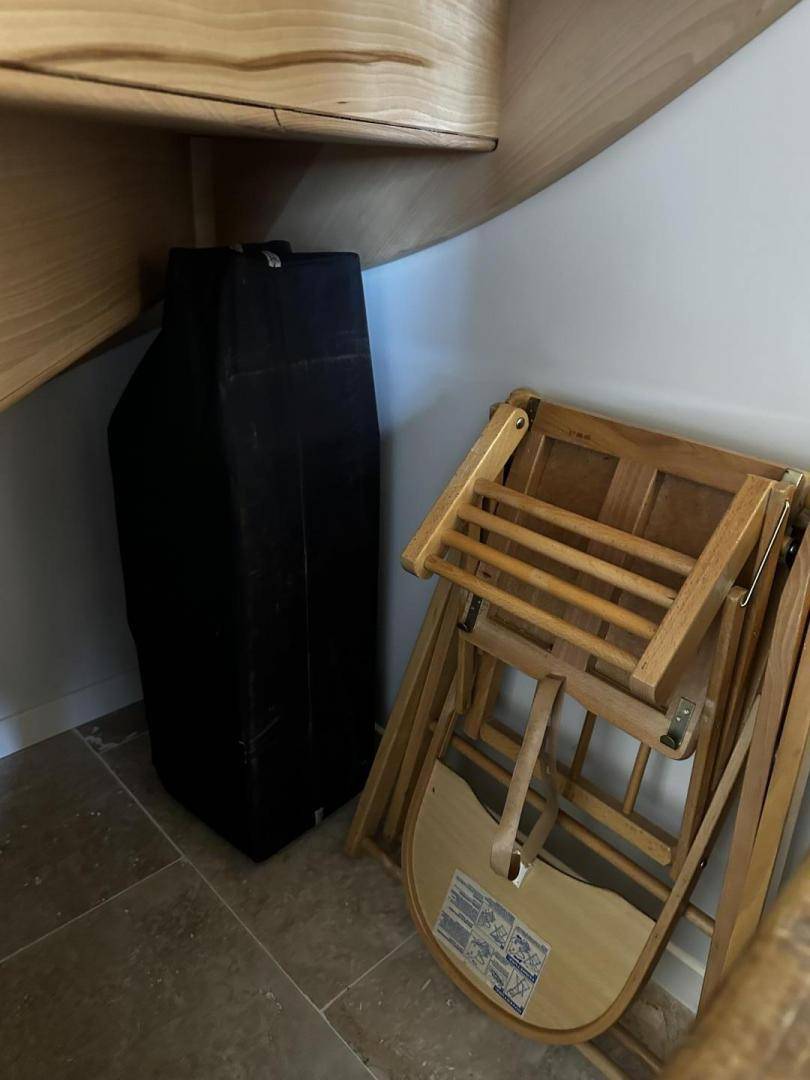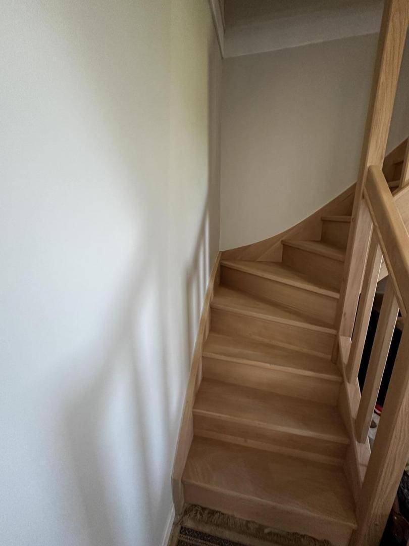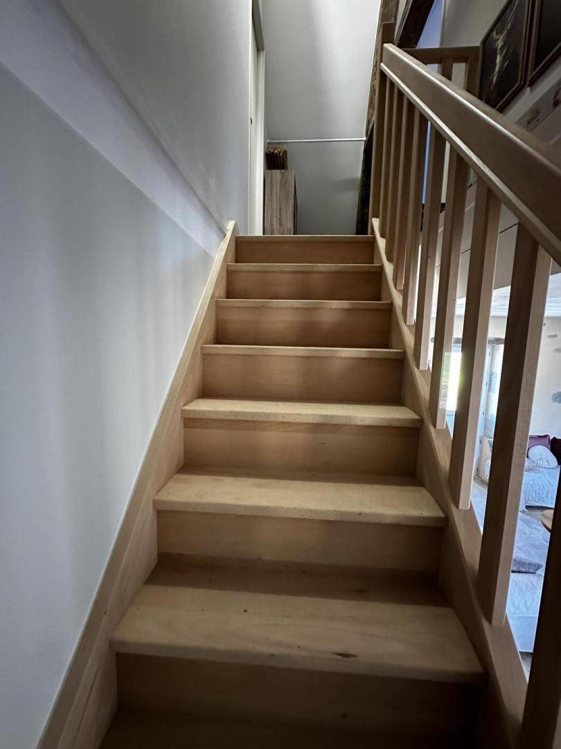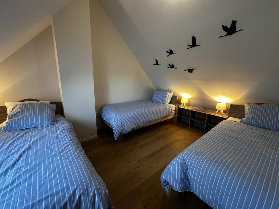 Obergeschoss: Über eine Innentreppe gelangt man in das Obergeschoss mit zwei Schlafzimmern, die jeweils Platz für zwei Personen bieten. Das erste Schlafzimmer verfügt über ein Doppelbett (160 x 200 cm). Das zweite Schlafzimmer mit drei Einzelbetten (90 x 200 cm) ist über einen Durchgang unter einem freiliegenden Balken mit einer Höhe von 1,45 m erreichbar. Hier ist besondere Vorsicht geboten. Kopf einziehen!