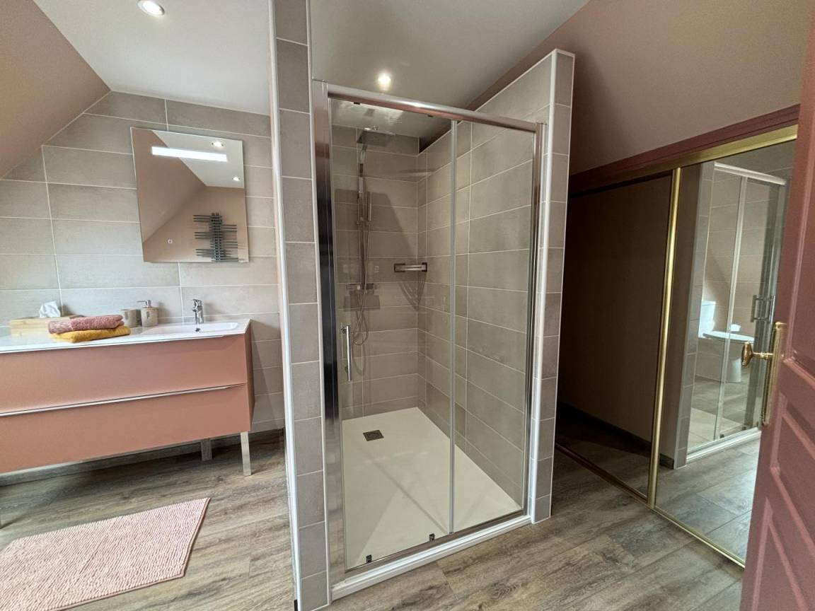 Etage: 1 Schlafzimmer für 2 Personen, 2 angrenzende Schlafzimmer für 3 bzw. 2 Personen mit Zugang zu einem Badezimmer im Erdgeschoss (Dusche und Toilette).