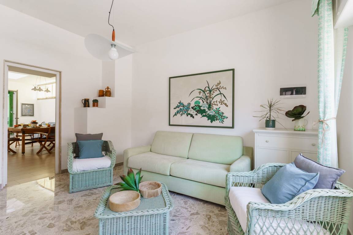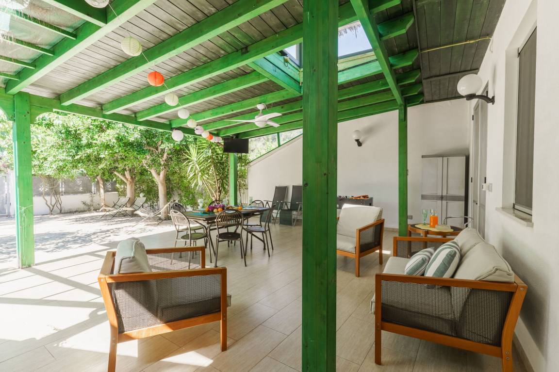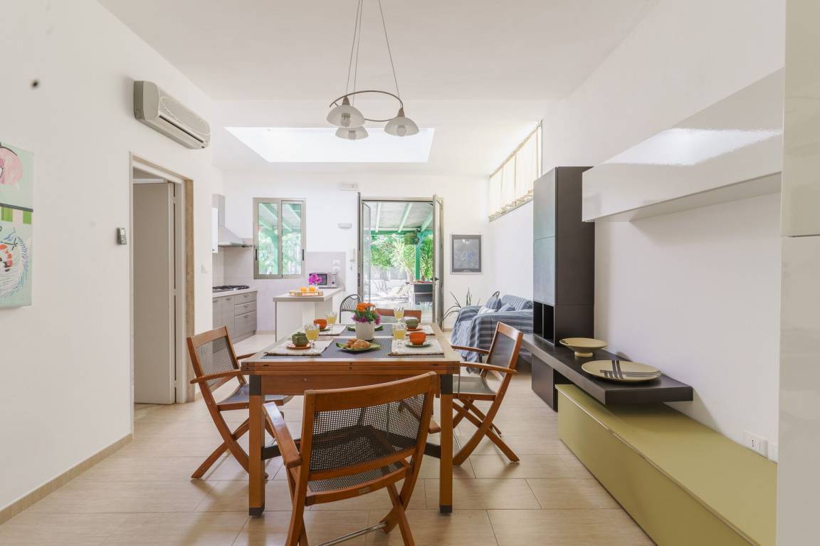 Wohnküche: Esstisch, Spülmaschine, Kühlschrank, Mikrowelle, Herd, Italienische Kaffeemaschine, Sofa, Sofa bed, WiFi Internet, Klimaanlage, Fliegengitter, TV, Ausgang auf den Garten, Ausgang auf den Patio, Ausgang auf die Veranda.