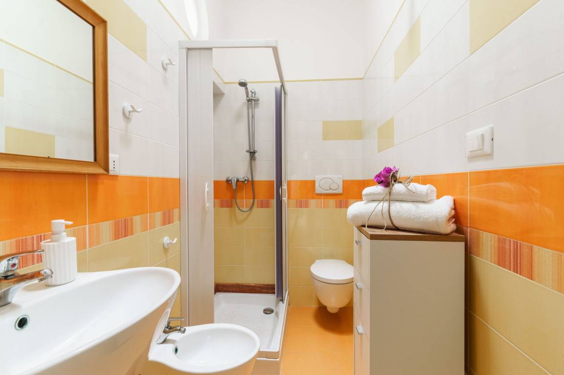 Badezimmer 1: Waschbecken, WC, Bidet, Dusche, Fön.