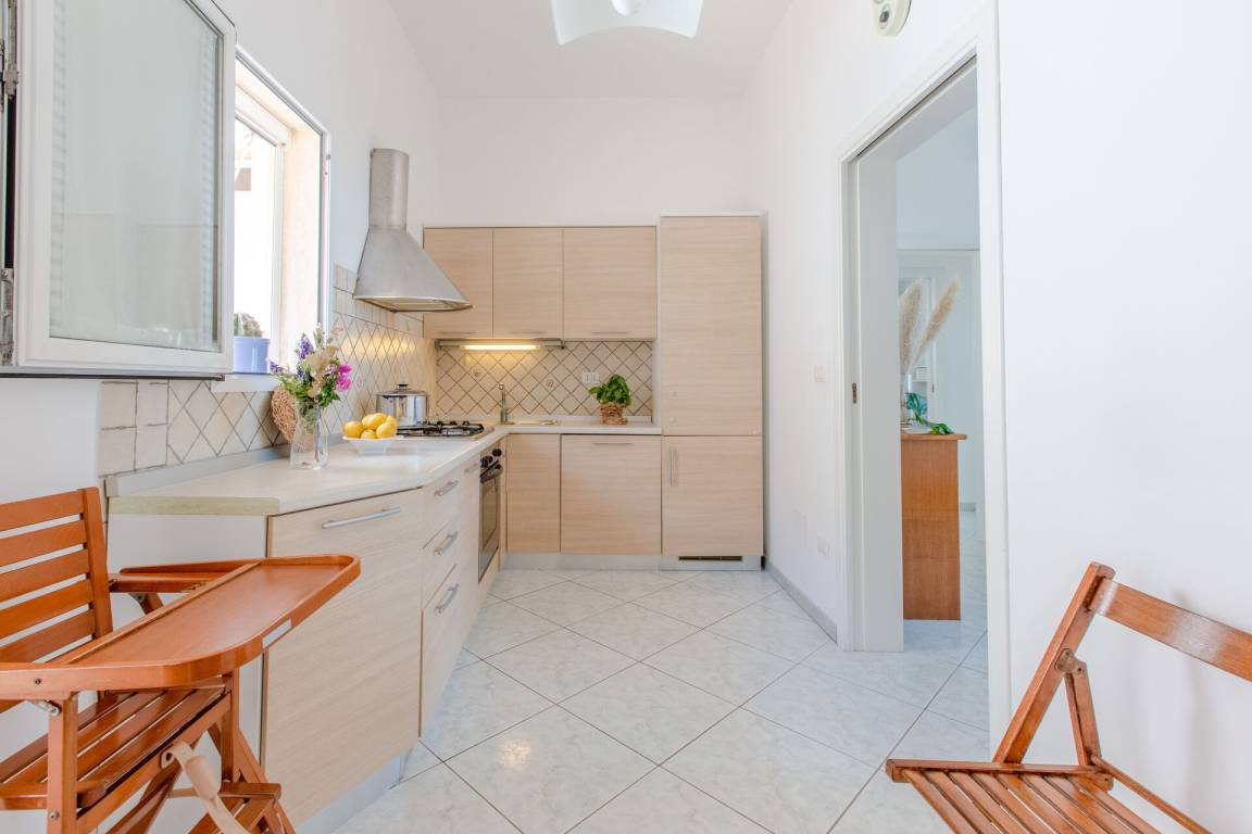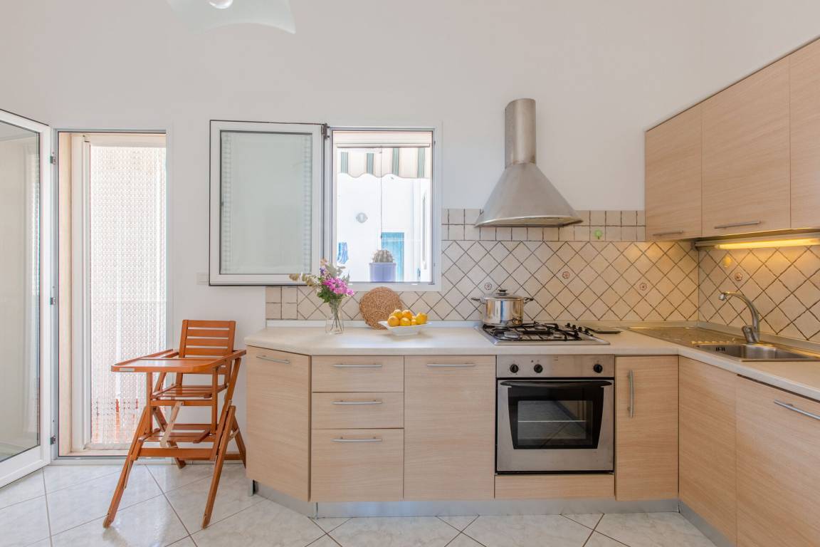 Küche: gut ausgestattete Küche, Spülmaschine, Kühlschrank, Tiefkühler, Herd, Ofen, Italienische Kaffeemaschine, WiFi Internet, Kinderhochstuhl, Ausgang auf den Balkon.