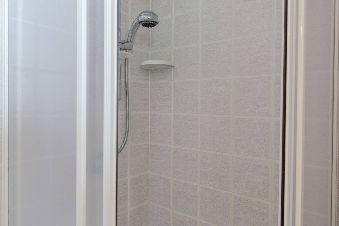 Schlafzimmer mit Bad: Doppelbett, Fliegengitter, Waschbecken, WC, Dusche, Fön.