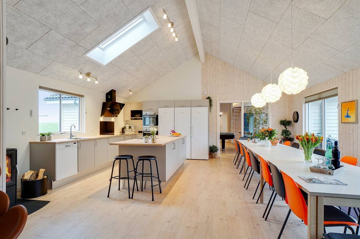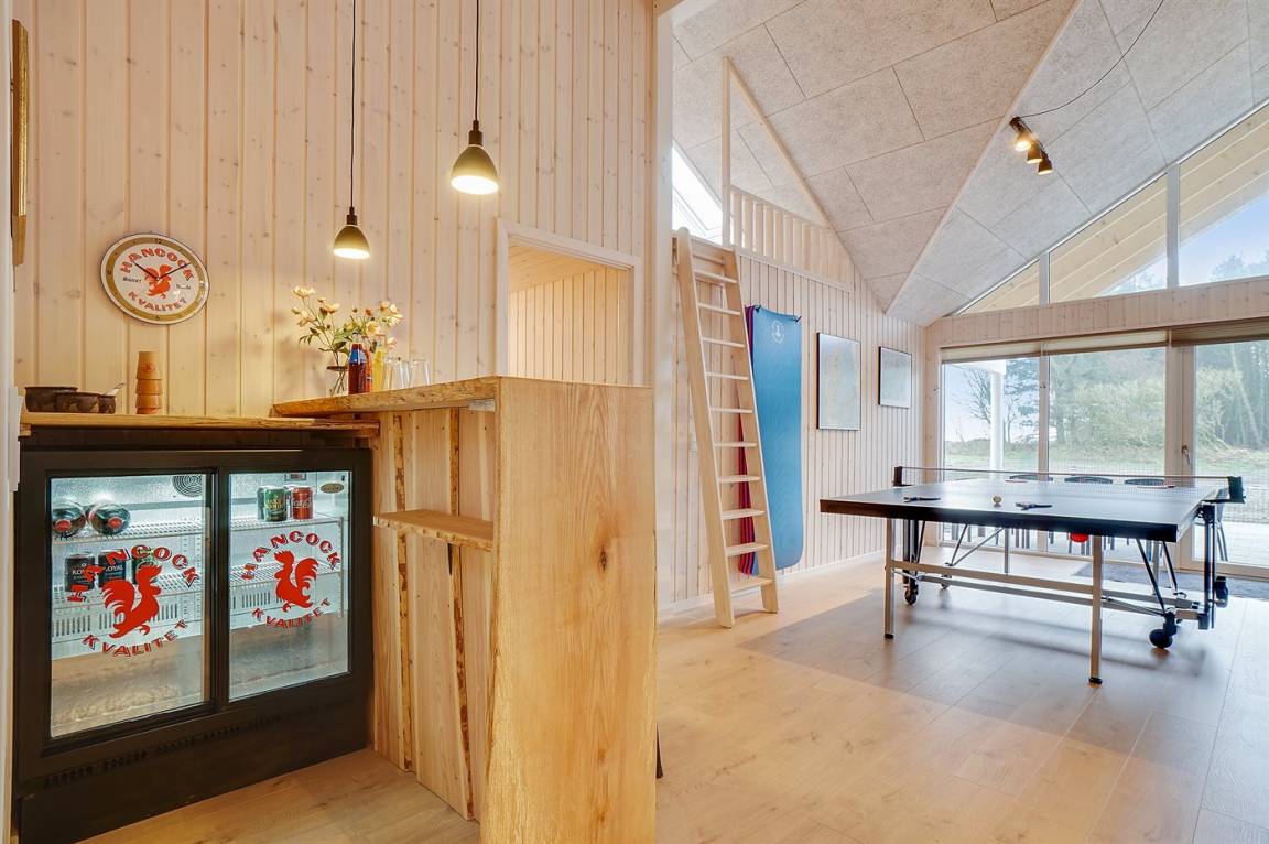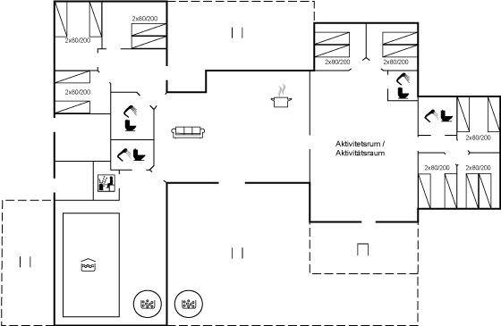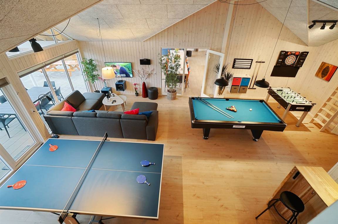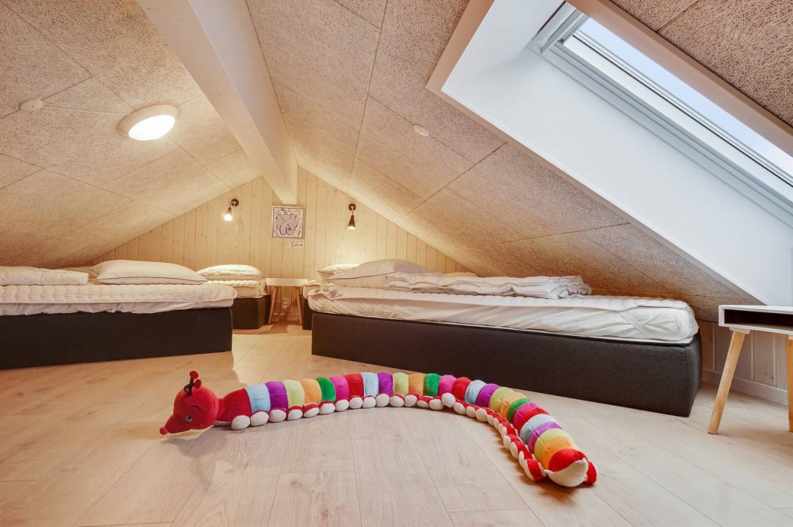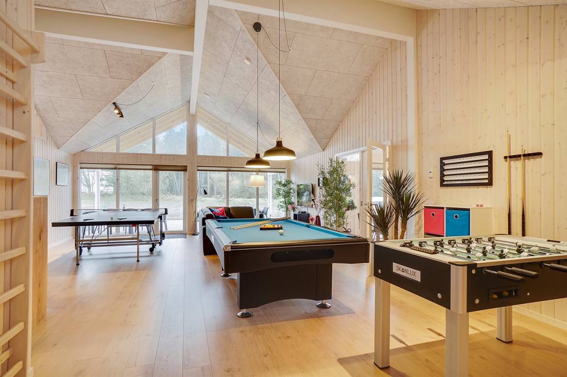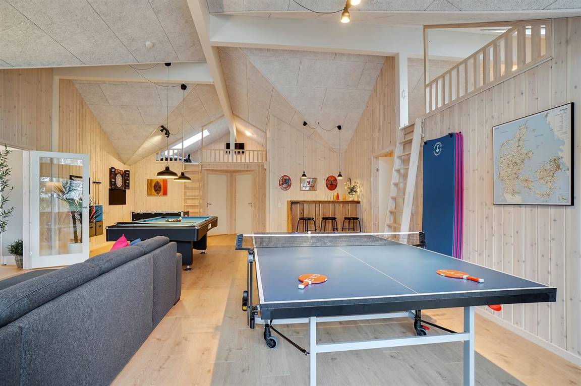 Wenn Sie auf der Suche nach einem großartigen Haus mit Swimmingpool für nicht weniger als 22–24 Personen mit einem großen Angebot für Indoor- und Outdoor-Aktivitäten in der Nähe der Badestrände des Limfjords sind, ist dieses Haus ganz bestimmt das Richtige für Sie. Das Haus verfügt über acht Schlafzimmer, die sich auf drei Bereiche mit eigenem Bad/Toilette verteilen, was für mehr Privatsphäre sorgt. Jedes Zimmer ist mit zwei Qualitätseinzelbetten ausgestattet, die zu einem Doppelbett zusammengesetzt werden können. Zudem befinden sich im großen offenen Obergeschoss sechs Betten und im kleinen offenen Obergeschoss zwei Matratzen. Die Schlafplätze in den offenen Obergeschossen eignen sich bestens für Kinder und Jugendliche. Außerdem gibt es im Unterschlupf eine Federkernmatratze für zwei Erwachsene oder drei Kinder. Alle Zimmer sind mit Verdunkelungsvorhängen ausgestattet. Auch an die Zugänglichkeit für Menschen mit Gehbehinderung und Rollstuhlfahrer ist gedacht: Die Eingangstür ist mit Rampen ausgestattet, es gibt keine Türschwellen und zwei der Schlafzimmer mit zugehörigem Badezimmer sind besonders groß. Das große Badezimmer verfügt über eine behindertengerechte Toilette, einen offenen Duschbereich, einen Wickeltisch, eine Babybadewanne, eine Waschmaschine und einen Trockner.