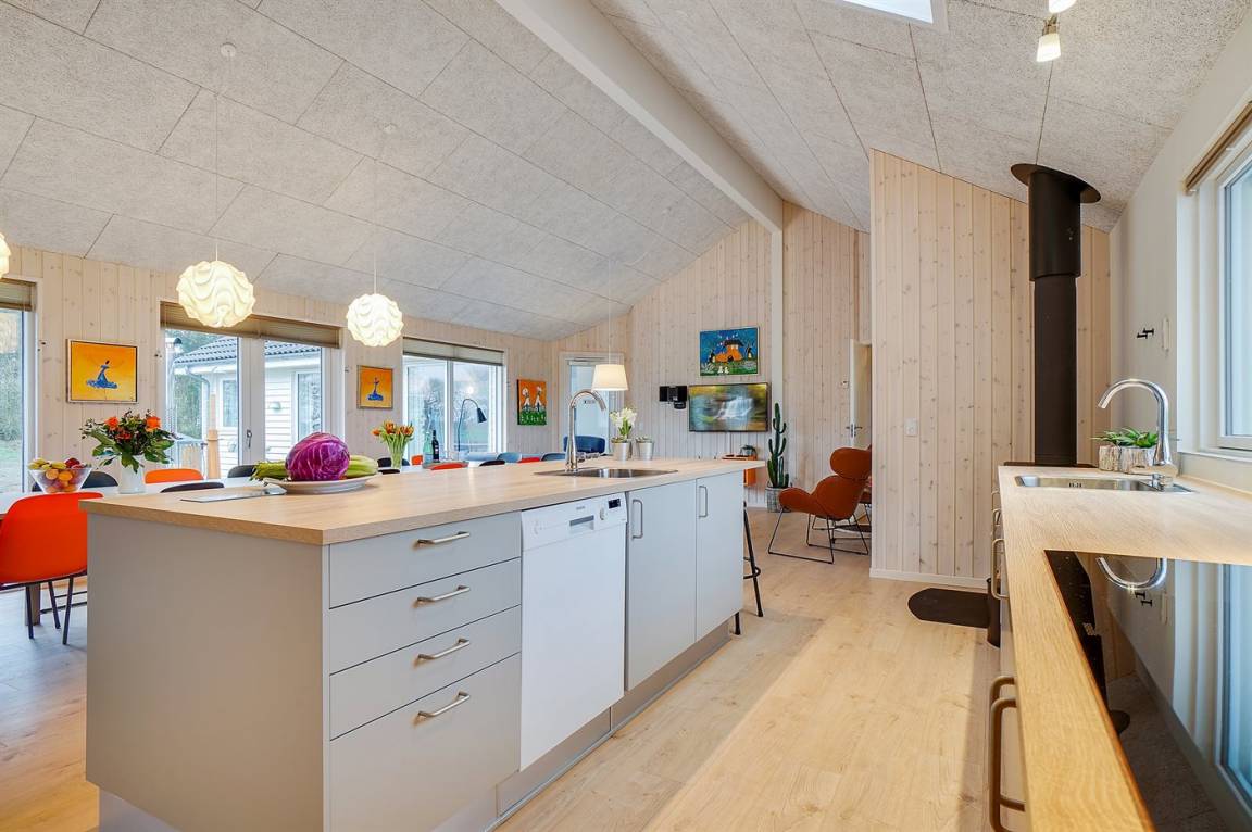 Der Aufenthaltsbereich ist mit Sofagruppe, Küche und dem langen Tisch der natürliche Mittelpunkt des Hauses und lädt zum gemeinsamen Essen und zum Planen der täglichen Unternehmungen ein. Die geräumige Küche ist selbstverständlich mit zwei Geschirrspülmaschinen, zwei Backöfen, zwei Kühlschränken und zwei Waschbecken ausgestattet, sodass hier für alle gekocht werden kann. Die große und teilweise überdachte Terrasse mit Infrarotheizung kann zu allen Jahreszeiten genutzt werden und bietet mit einem Weber-Kugelgrill und einem Weber-Gasgrill optimale Möglichkeiten, das Abendessen zuzubereiten.