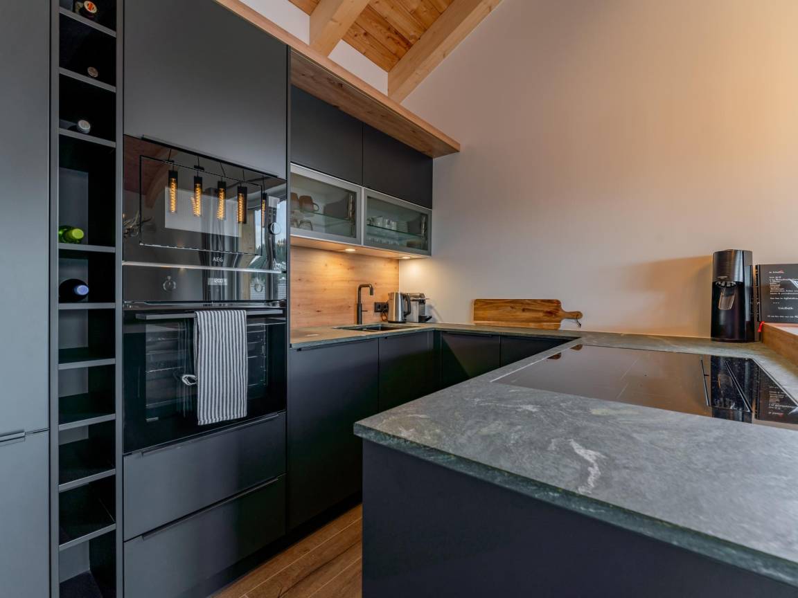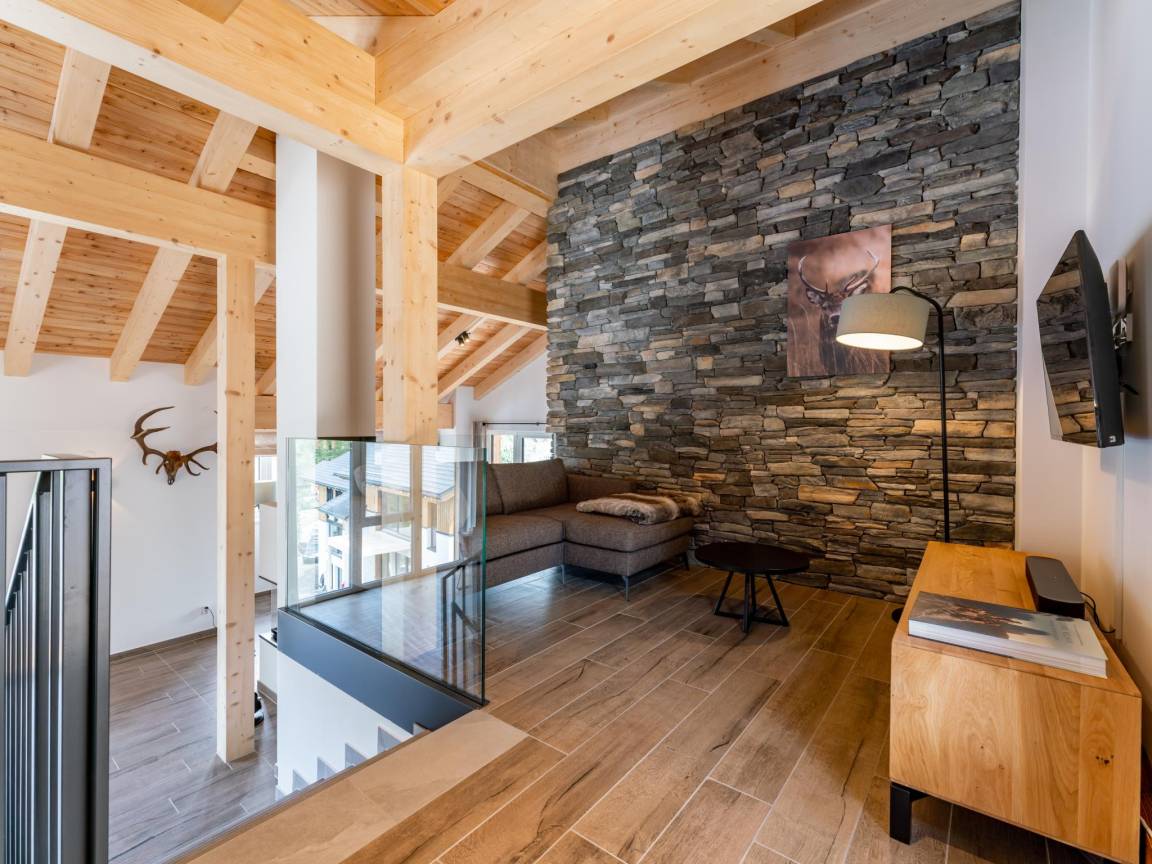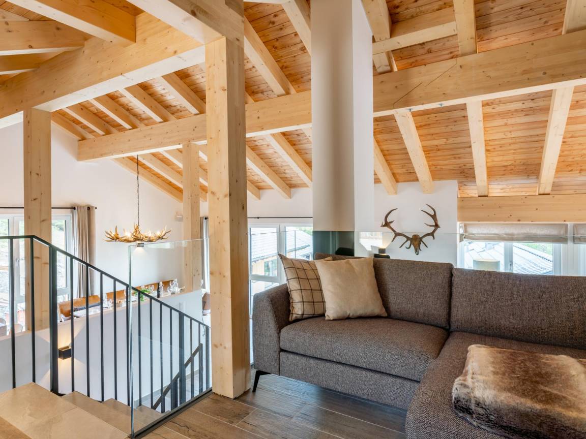 In der 1. Etage: Wohnzimmer mit TV(smart TV), Esstisch(8 Personen), Kamin, Sitzecke(8 Personen), Sitzecke(3 Personen) , offene Küche mit Kochplatte(4 Kochplatten, Ceranfeld), Wasserkocher, Kochendwasserhahn, Toaster, Kaffeemaschine(cups, Filter), Backofen, Mikrowelle, Geschirrspüler, Kühlschrank , Toilette, Skiabstellraum mit Skischuhheizung , kabelloses Musiksystem, Balkon, Terrasse