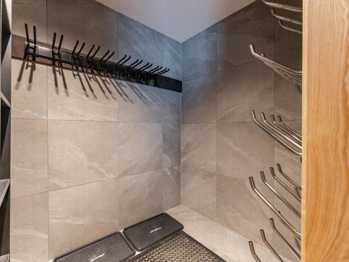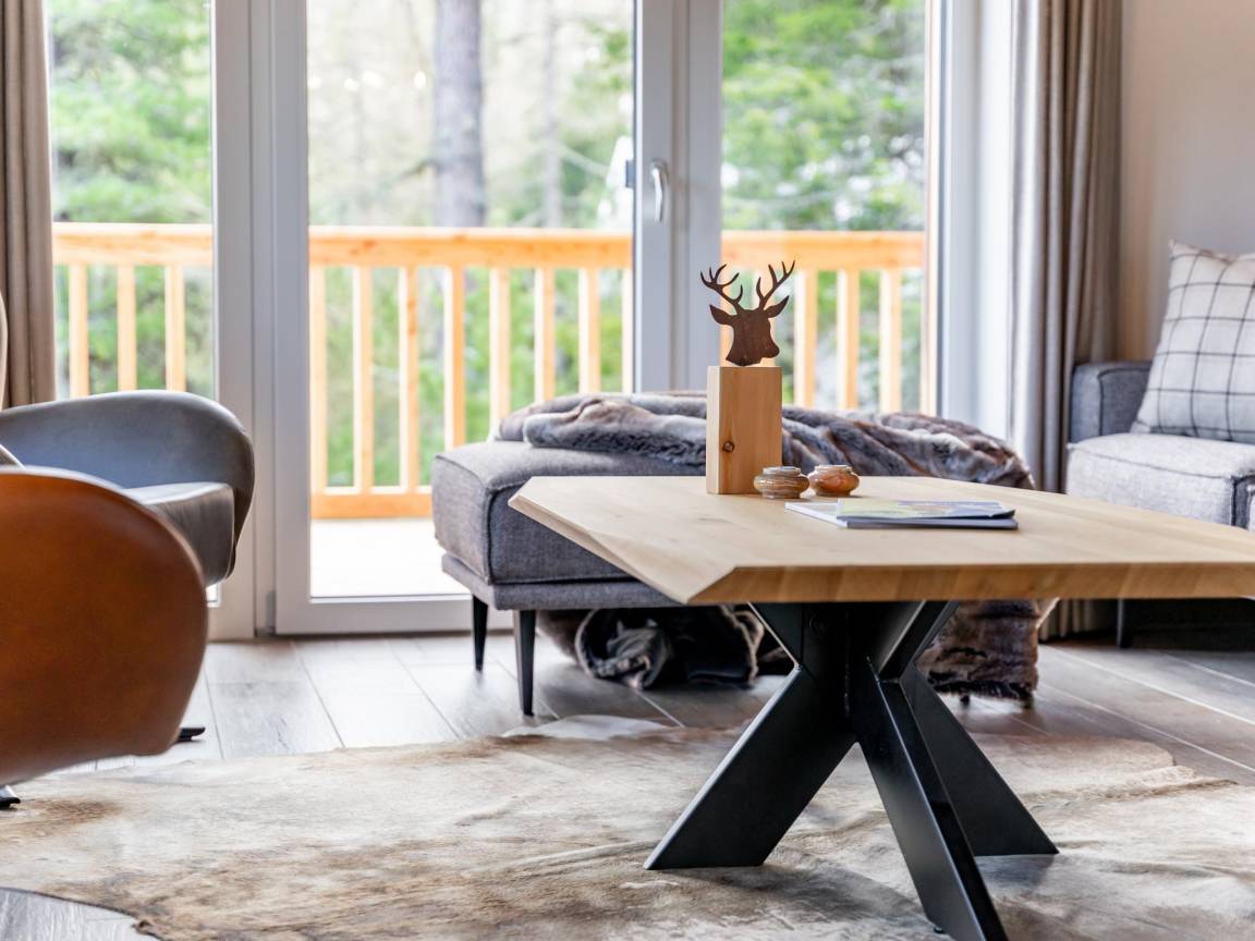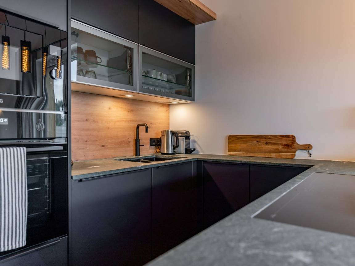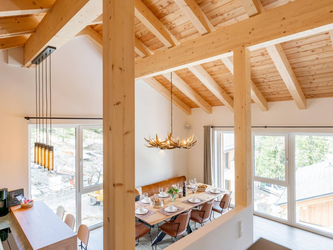 In der 1. Etage: Wohnzimmer mit TV(smart TV), Esstisch(8 Personen), Kamin, Sitzecke(8 Personen), Sitzecke(3 Personen) , offene Küche mit Kochplatte(4 Kochplatten, Ceranfeld), Wasserkocher, Kochendwasserhahn, Toaster, Kaffeemaschine(cups, Filter), Backofen, Mikrowelle, Geschirrspüler, Kühlschrank , Toilette, Skiabstellraum mit Skischuhheizung , kabelloses Musiksystem, Balkon, Terrasse