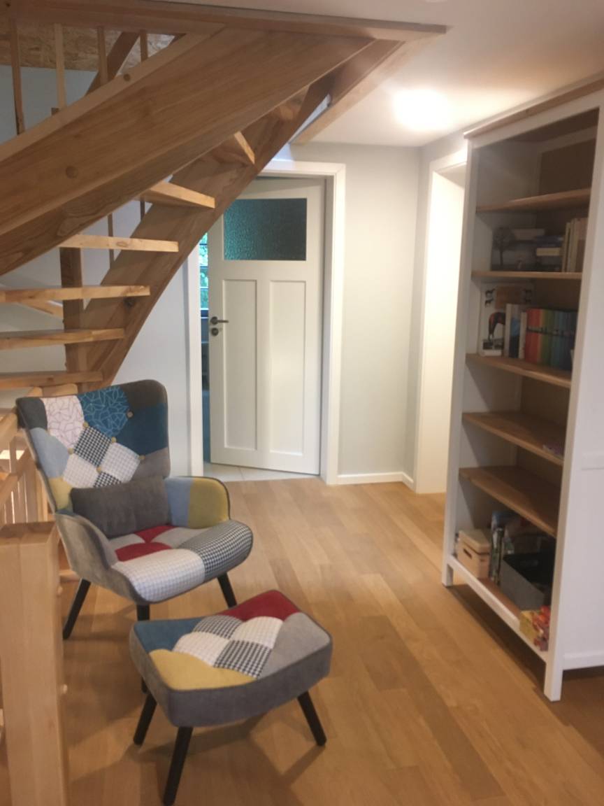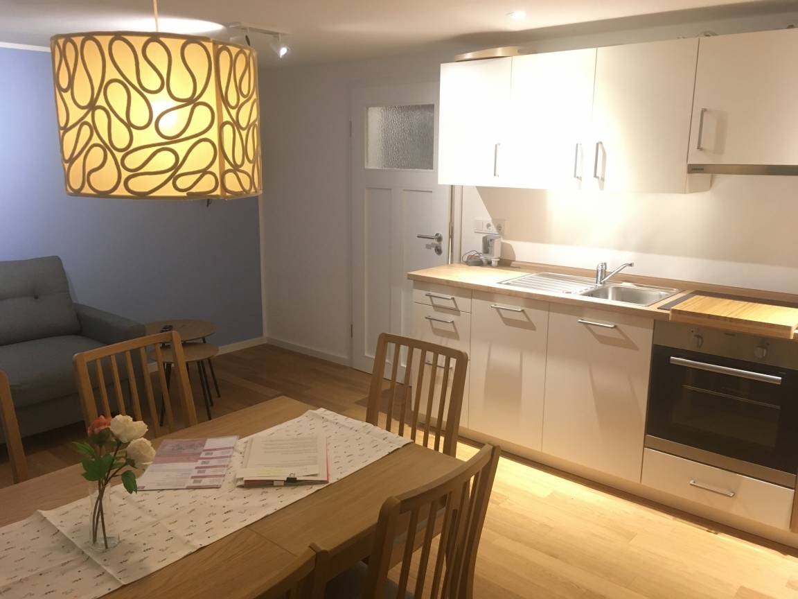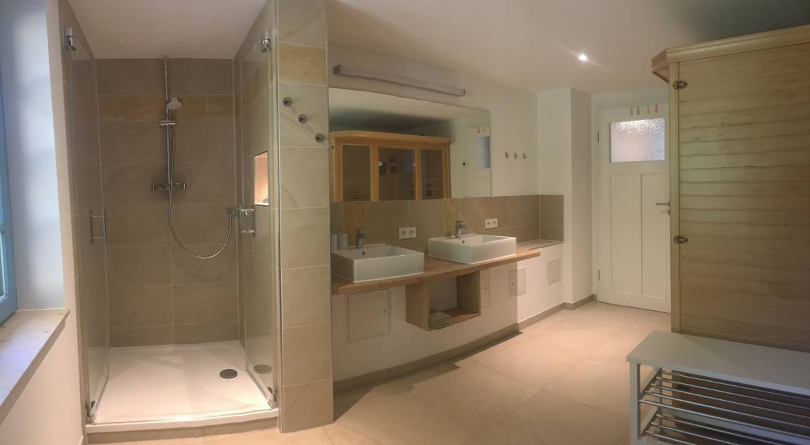 Der Eingang erfolgt auch hier separat von der Fewo im Erdgeschoss. In der vollausgestatteten Wohnküche können gemeinsam die Pläne für den Urlaub in der Region geschmiedet werden. Im großen Familienbad wartet zudem eine Infrarot-Kanine als stromsparende Saunaalternative auf die Gäste. Herzlich willkommen.