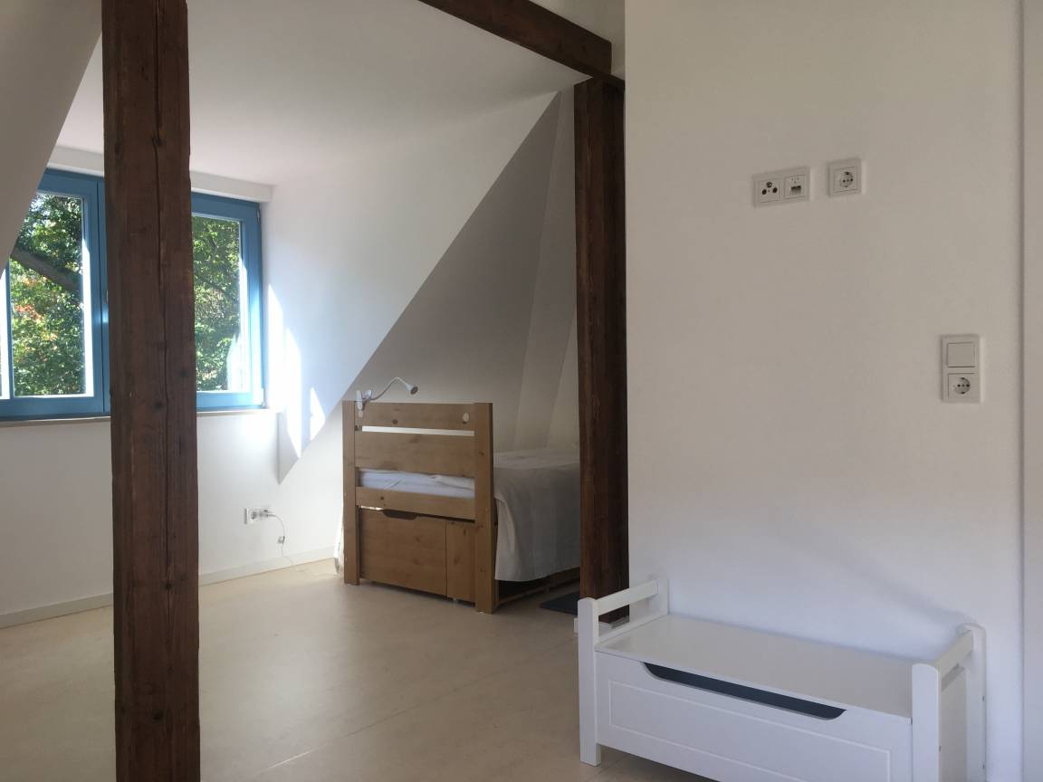 Auch diese Wohnung verfügt über getrennte Schlafzimmer. Neben dem klassischen Schlafzimmer mit Doppelbett ist das ganze Dachgeschoss für die Kinder- oder weitere Gästeschar zu einem geräumigen Schlafboden ausgebaut. Hier stehen ein Doppelbett, ein Einzelbett sowie ein Schlafsofa zur Verfügung.