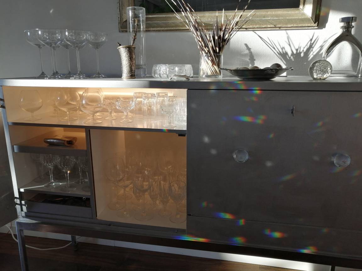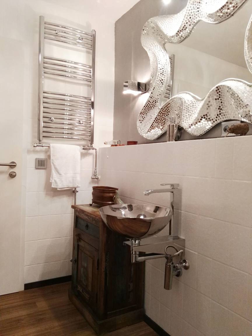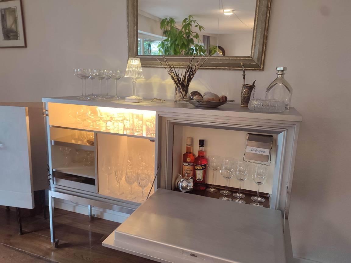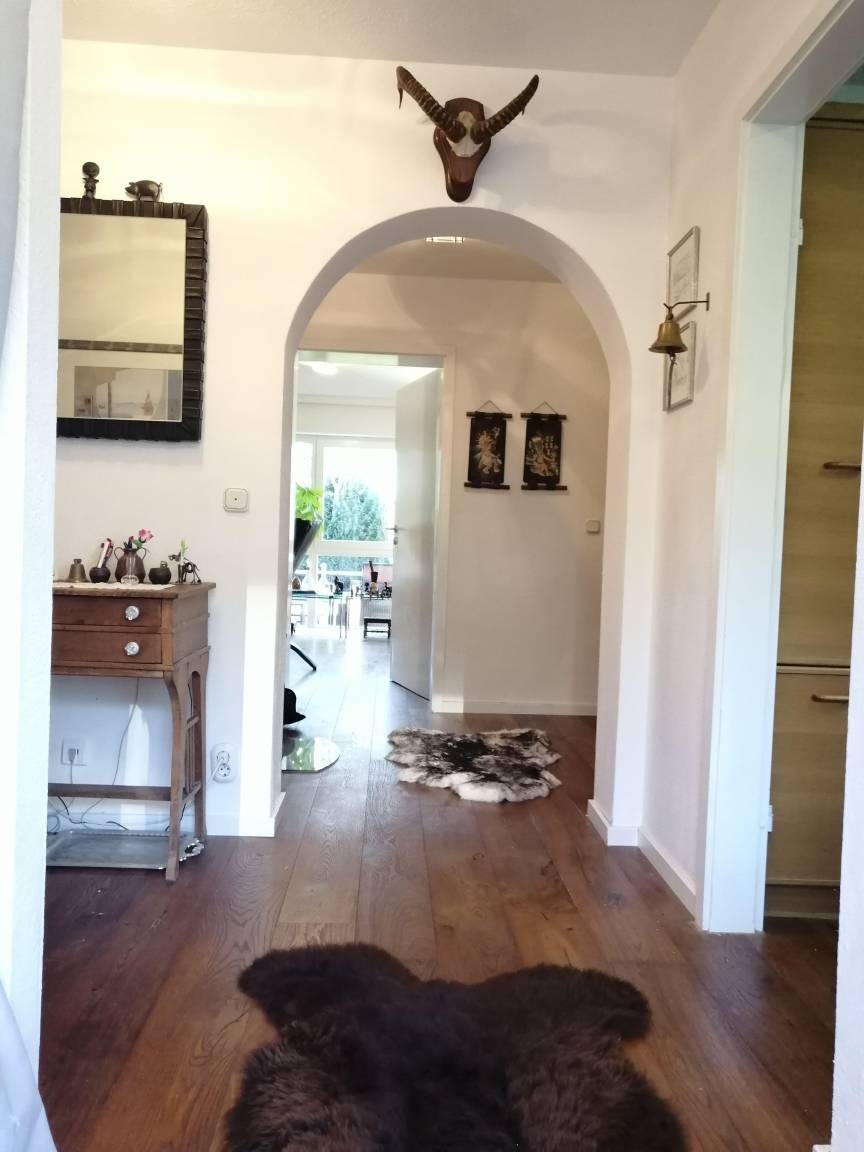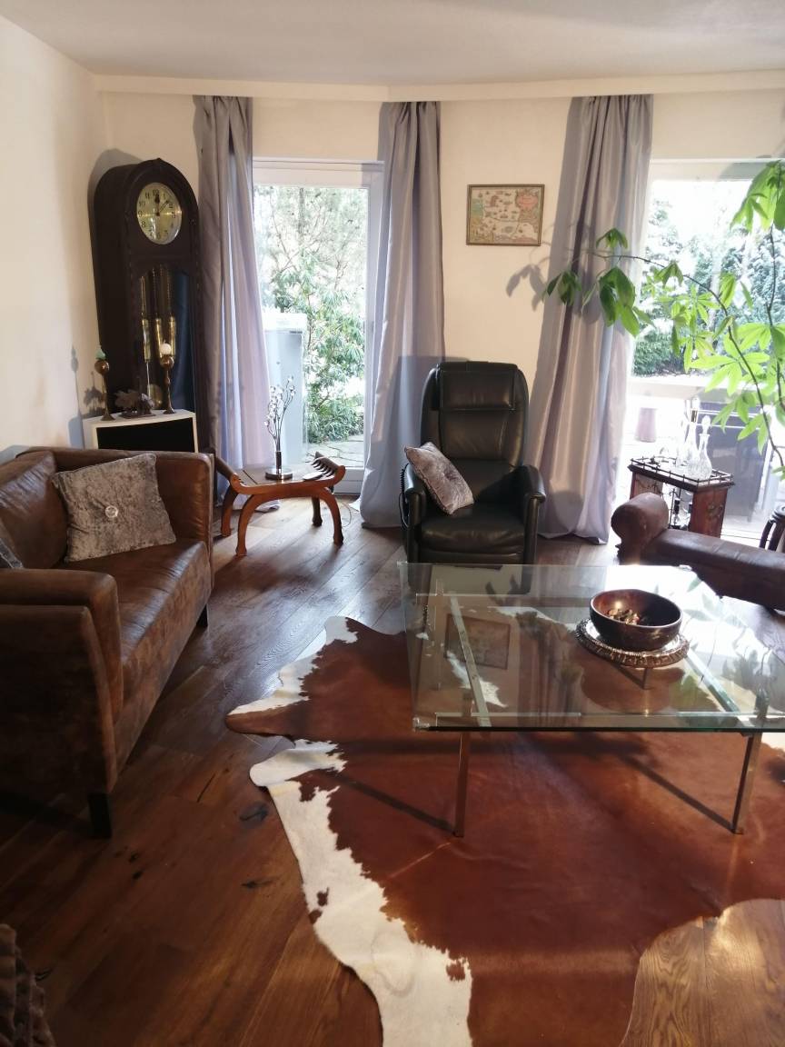 Ein Kachelofen mit Fenster zum Flur sorgt für eine romantische Stimmung. Edle Vintagemöbel und 100 a alte Ölgemälde vom Starnberger See wie auch 100 a alte Antiquitäten neben neuen Designermöbeln und echten und neuen Schaf- und Kuhfellen ermöglichen stilvolles Wohnen. Ein Massagesessel mit Liegefunktion und Heizung ermöglichst herrliche Entspannung. Die bluetoothfähige Stereoanlage kann mit dem Smartphone verbunden werden.