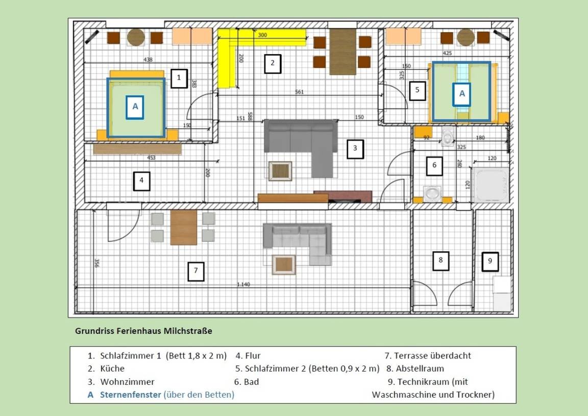Das einzigartige Highlight des Ferienhauses, sind die großen Sternenfenster, 2 x 2 Meter, jeweils über den Betten in den Schlafzimmern. Einschlafen unter den Sternen und einen großen Ausschnitt des Himmels genießen. Planeten, Mond und Milchstraße beobachten sowie Sternschnuppen fallen sehen.