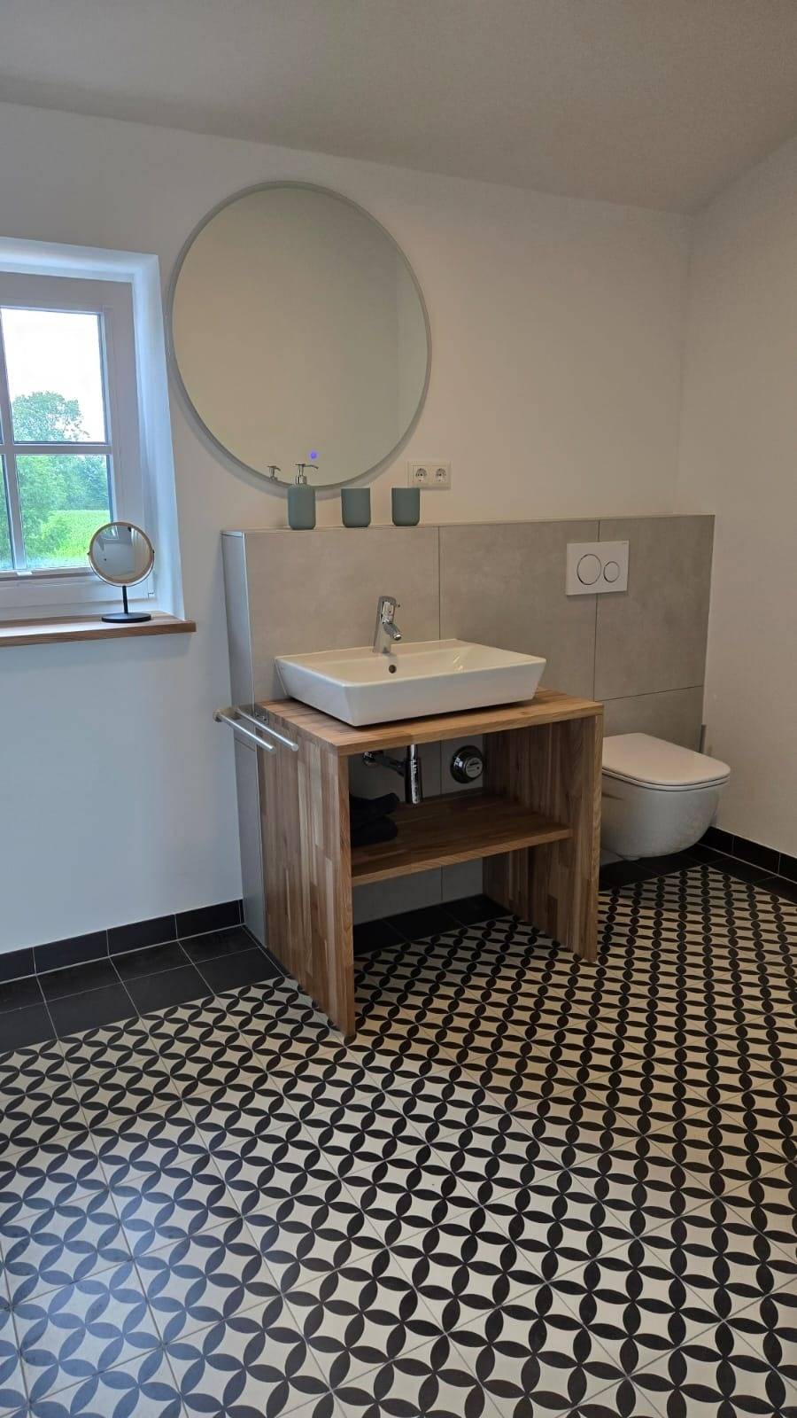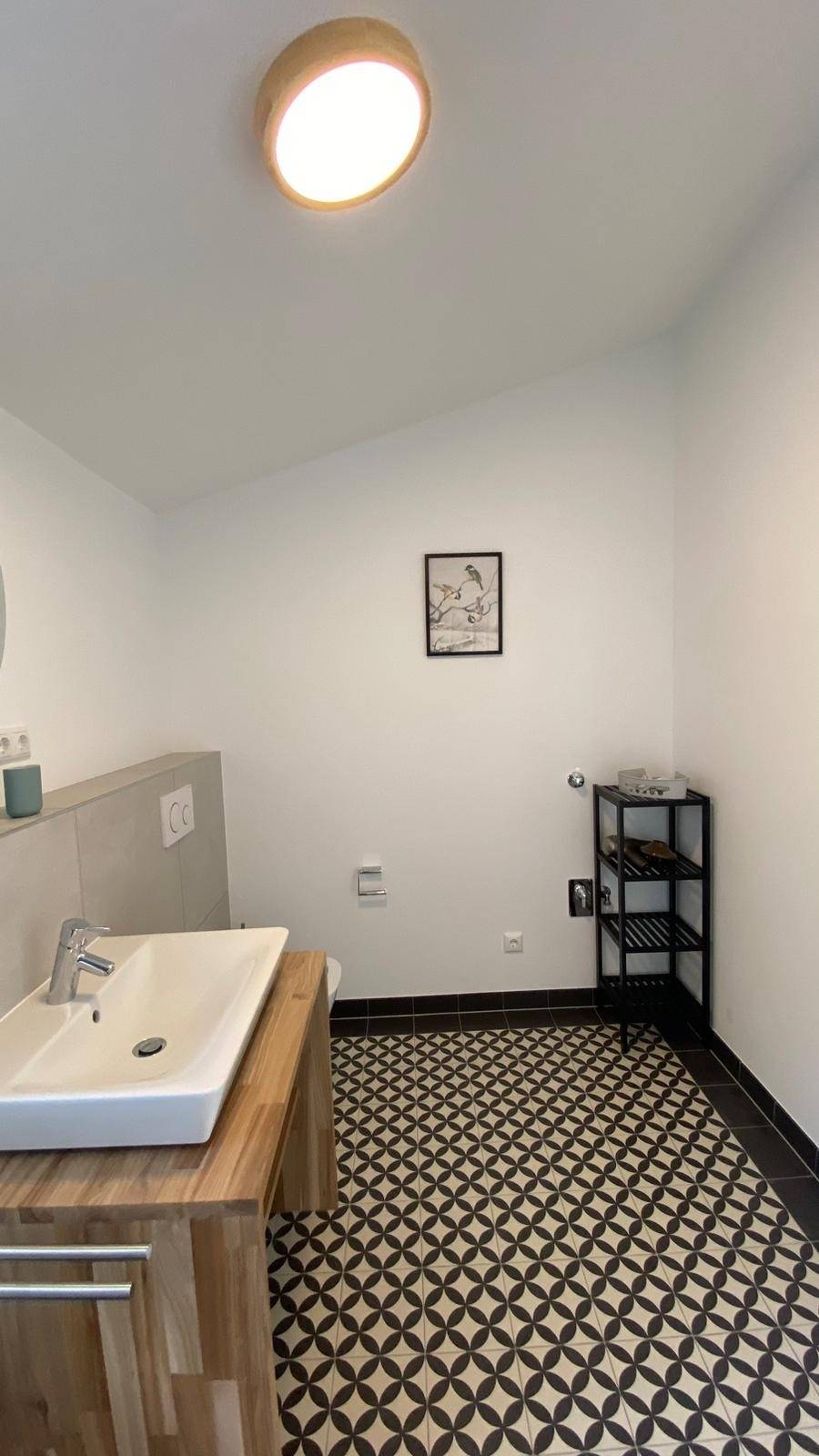 Im hochwertigen Badezimmer finden sie eine große Walk-in- Dusche, ein Waschbecken, eine Toilette und natürlich auch einen Fön. Handtücher können, auch große Saunahandtücher, zur Verfügung gestellt werden.