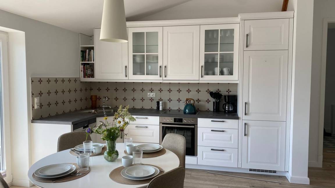 Die neue hochwertige Küche im Landhausstil, beherbergt alles, was ihr Herz begehrt, Backofen ,Induktionsherd, 2 große Gefrierfächer und alle nötigen Kochutensilien