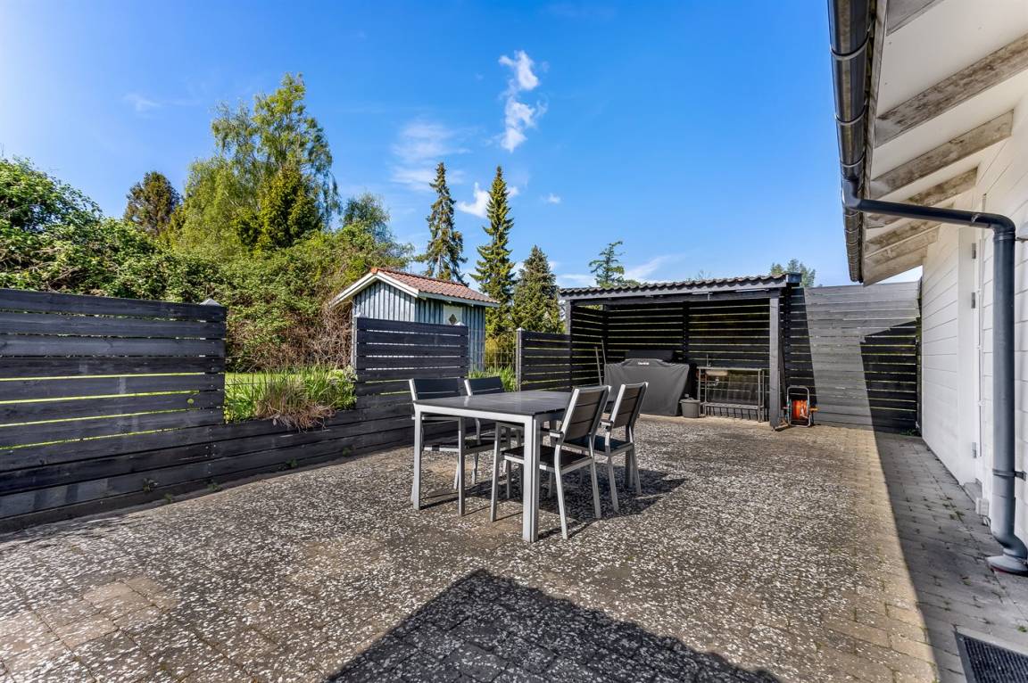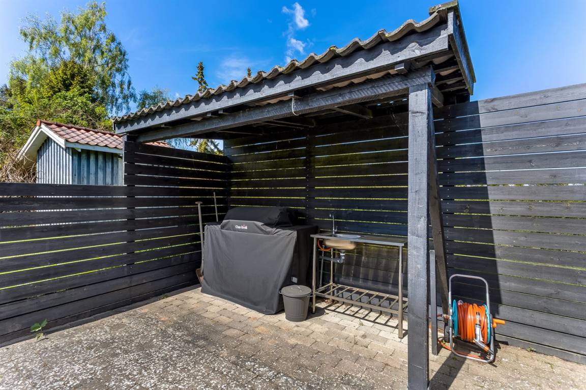Vom Esszimmer des Hauses hast du direkten Zugang zur großen Terrasse. Auf der einen Terrasse kann ein Bereich abgesperrt werden, sodass kleine Kinder dort sicher spielen können. Es gibt außerdem einen Gasgrill sowie eine Außenküche mit Tisch, Spüle und Wasserhahn.