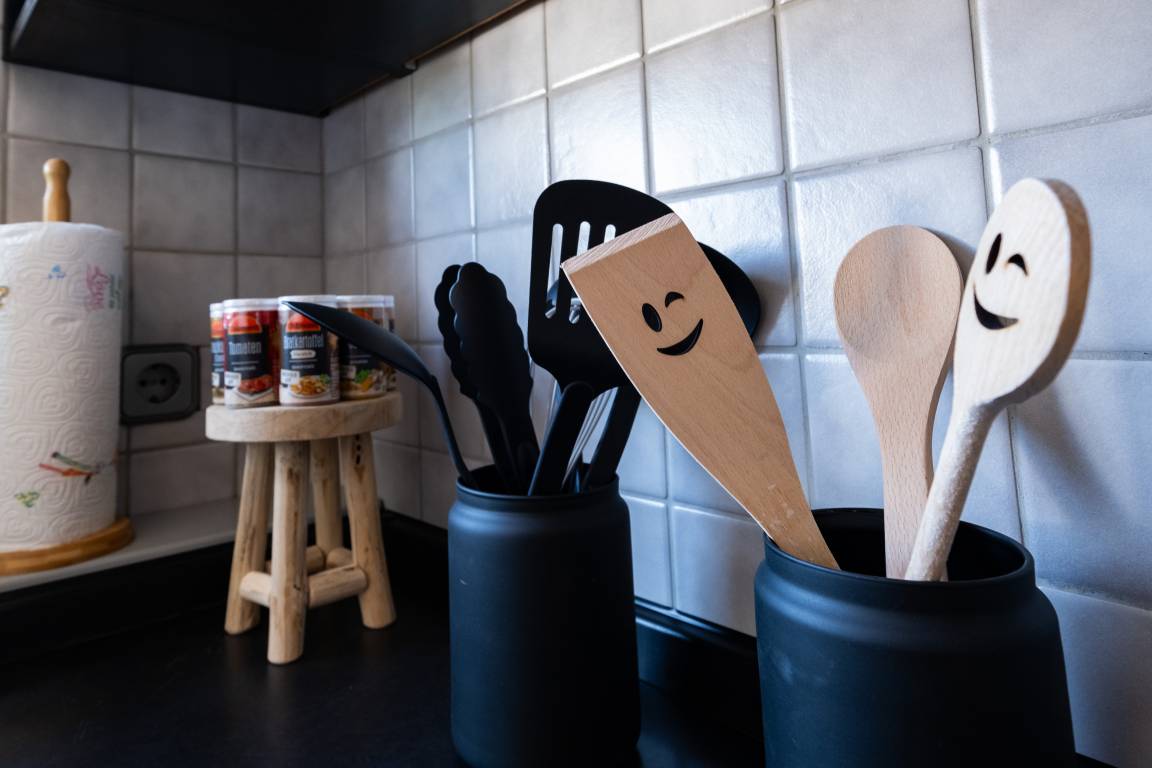 - Herd & Backofen + alle Utensilien zum Kochen (Pfannen, Töpfe, Salatschüssel, Messer etc)