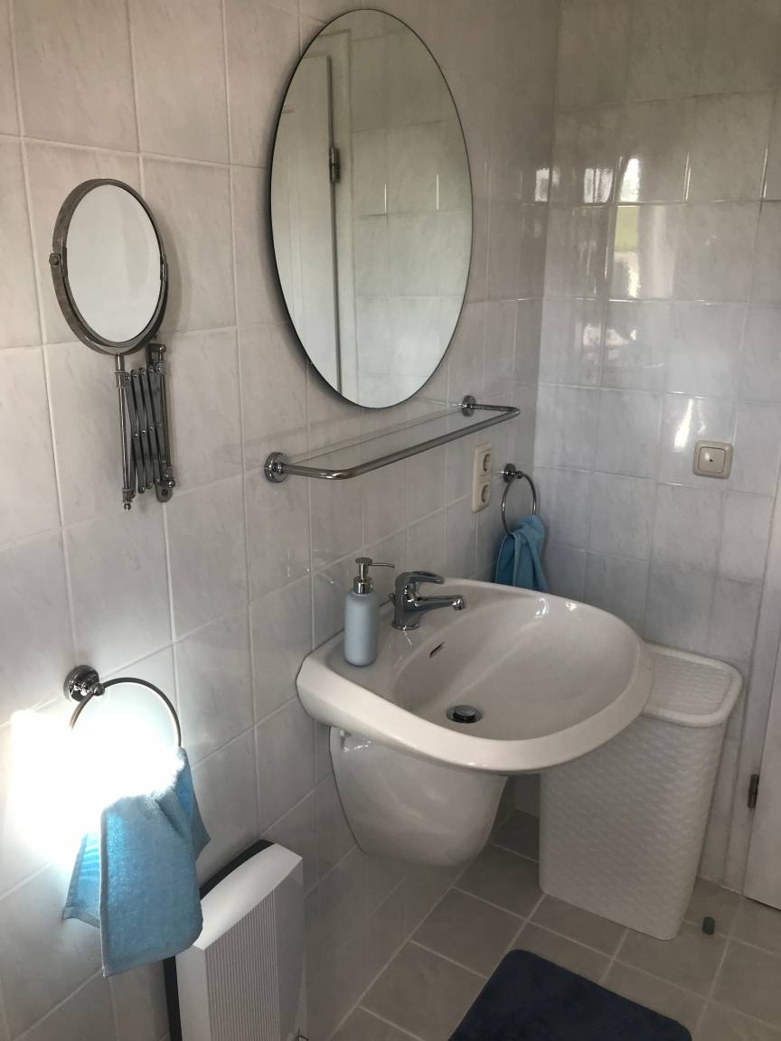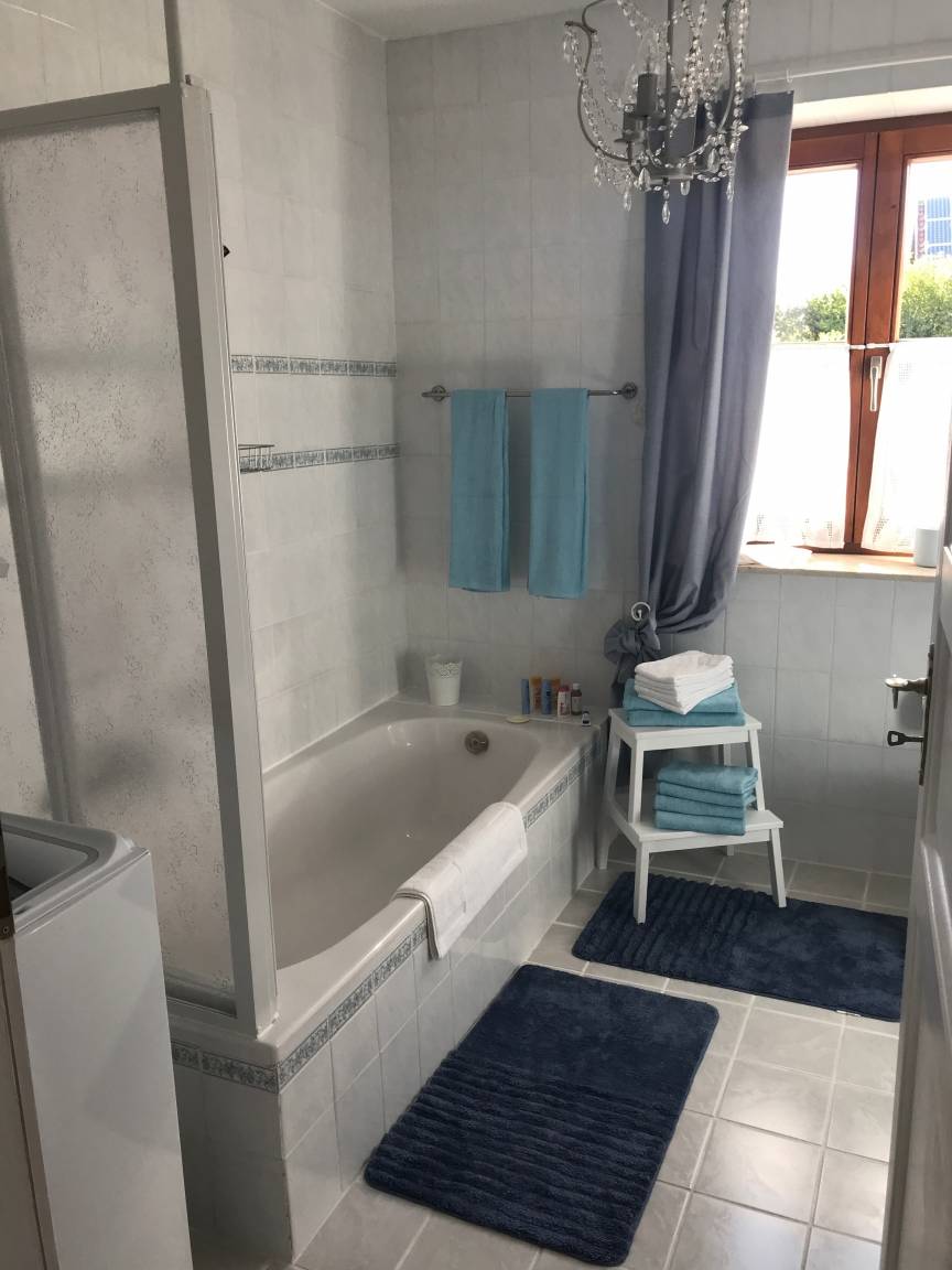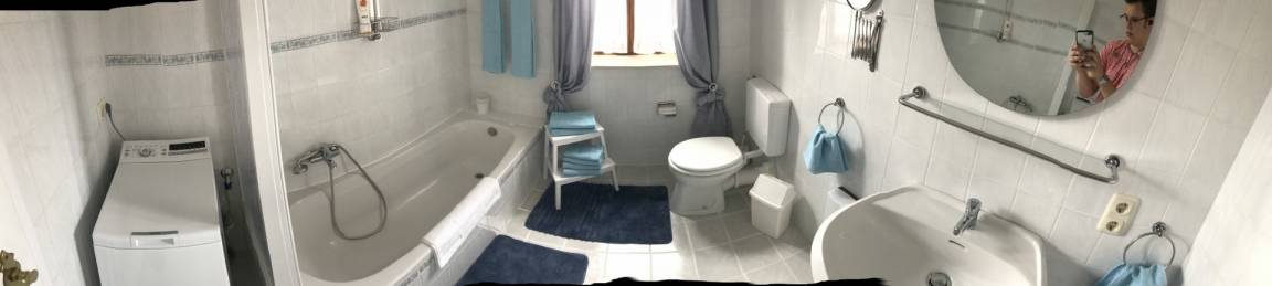 - Badezimmer mit Badewanne (Duschwand), WC und Waschbecken, Haarfön, sowie eine Waschmaschine.