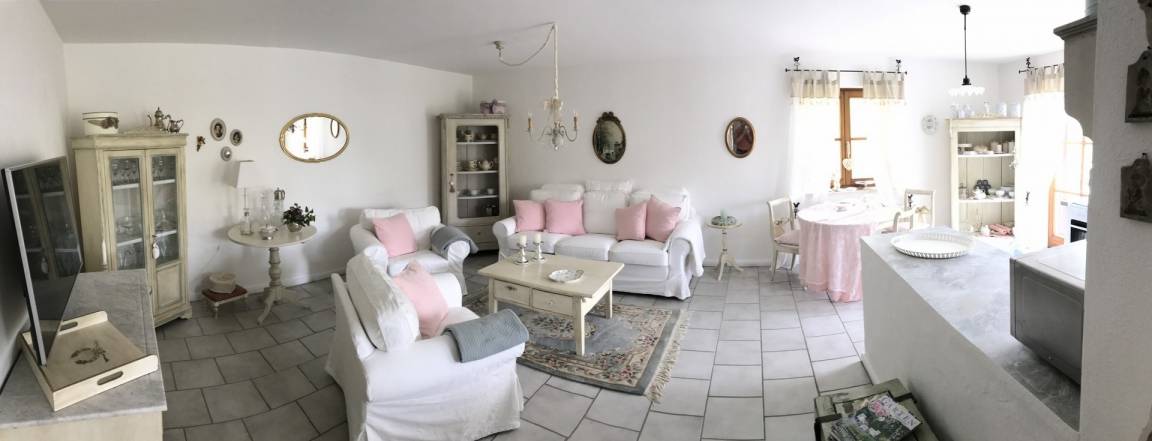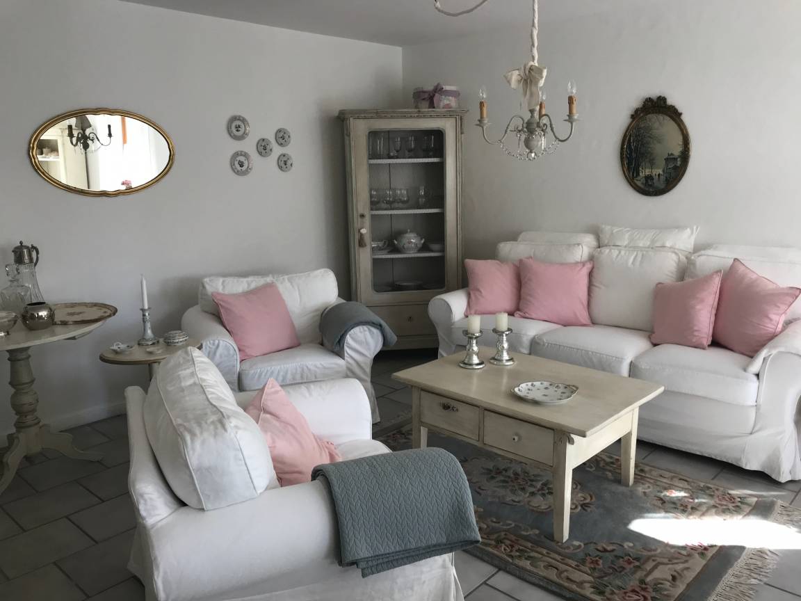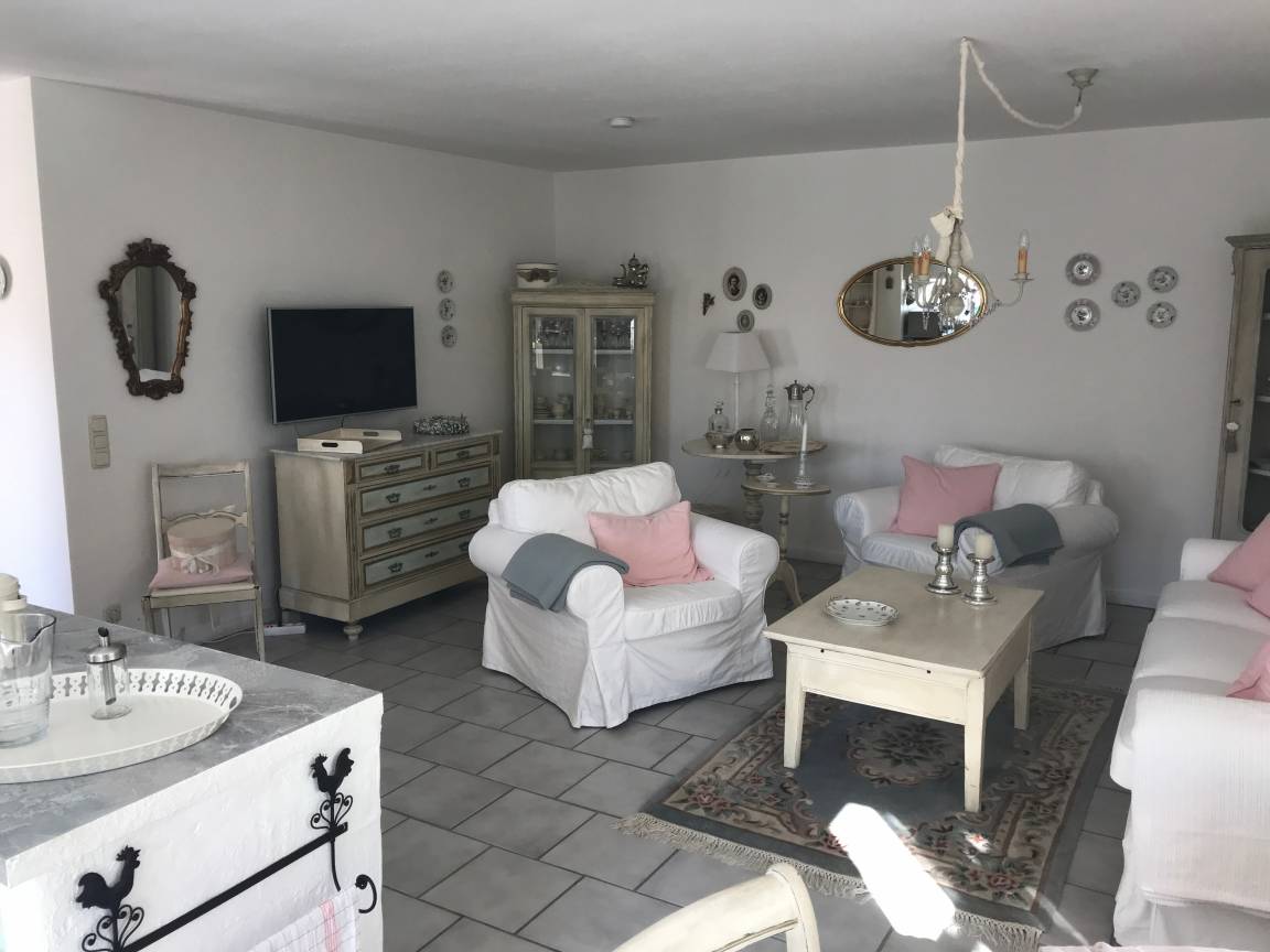 - Wohnraum mit Sofa und zwei Sesseln, SAT-Fernseher, Stereoanlage, WLAN-Internetanschluss. Zwei Vitrinen, ein offener Schrank, Kommode, Couchtisch und Beistelltischchen. Esstisch mit Stühlen