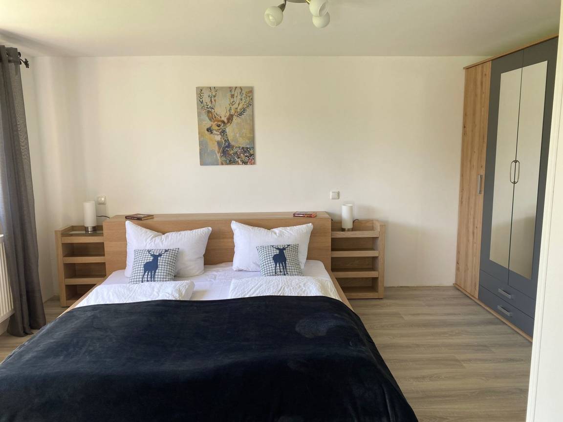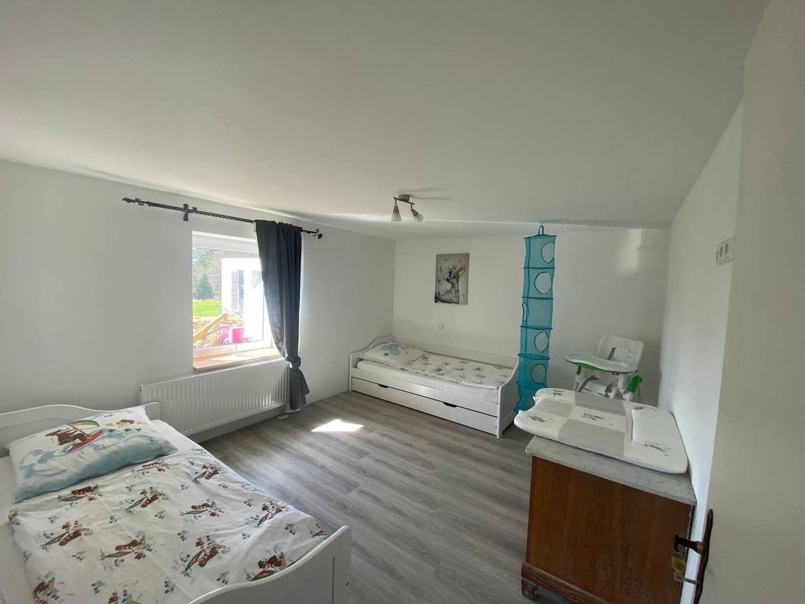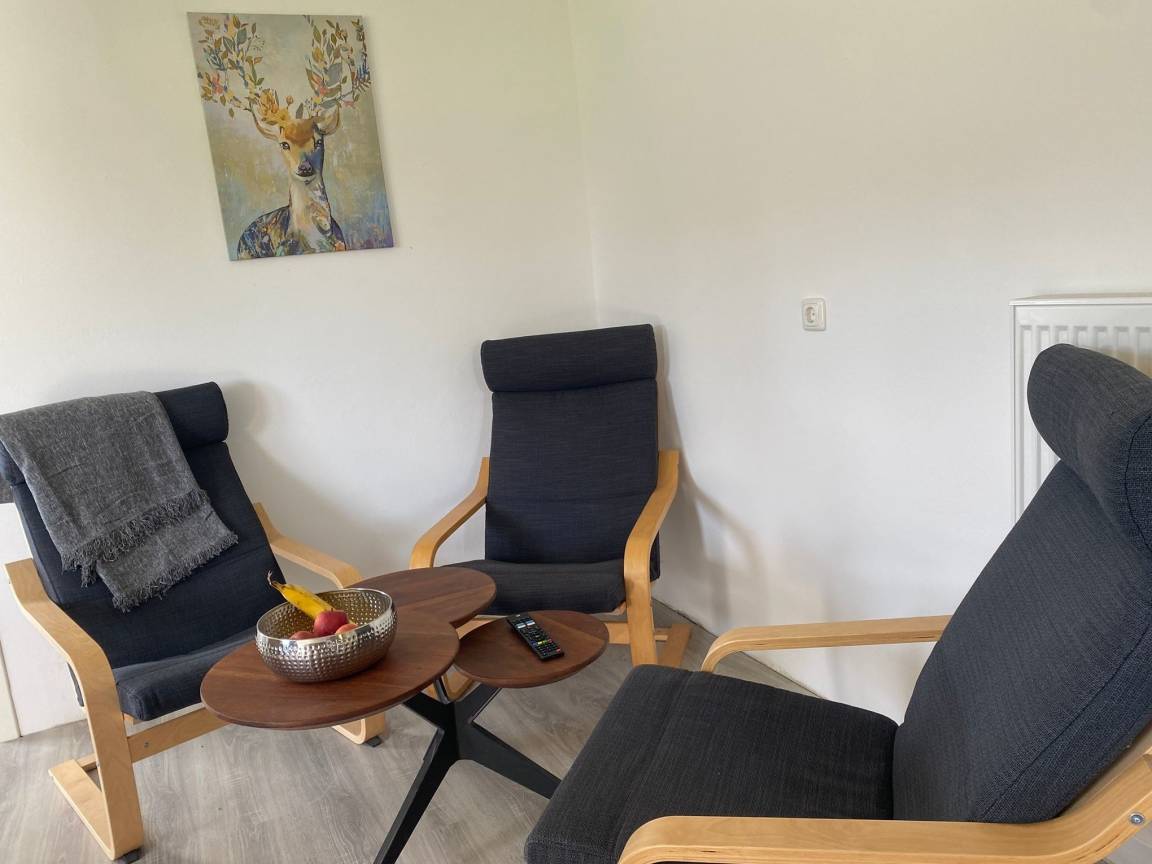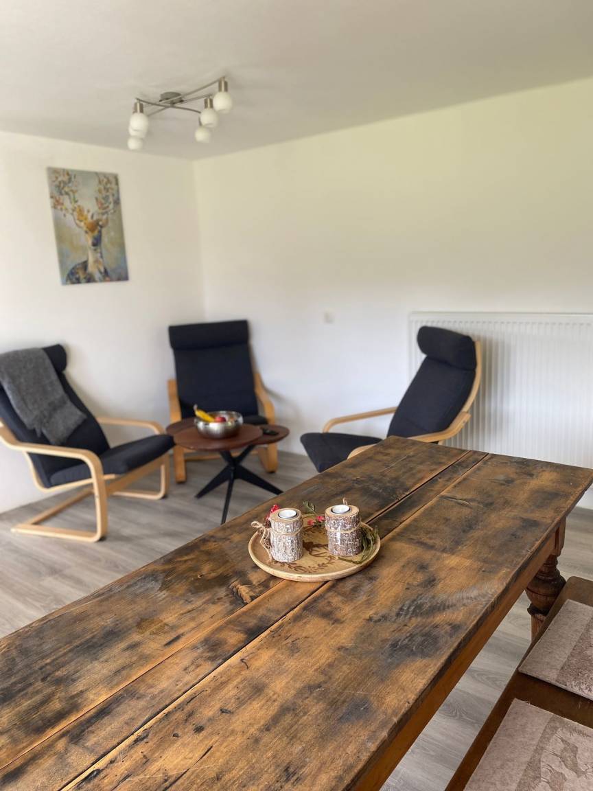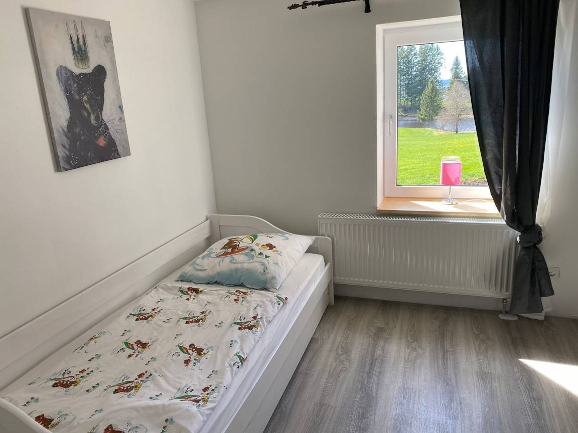 Wir bieten eine gemütliche Ferienwohnung mit Kinderzimmer (bis zu 4 Betten), Schlafzimmer (Doppelbett), Bad und Wohnzimmer. Ein schnuckeliger Balkon mit Blick auf See und Wiesen lädt zum Verweilen ein. Auf der kleinen Terrasse vor dem Haus können sie draußen sitzen und die lauen Sommerabende genießen.