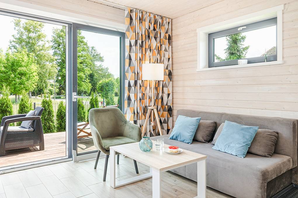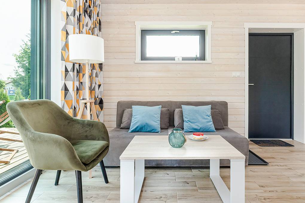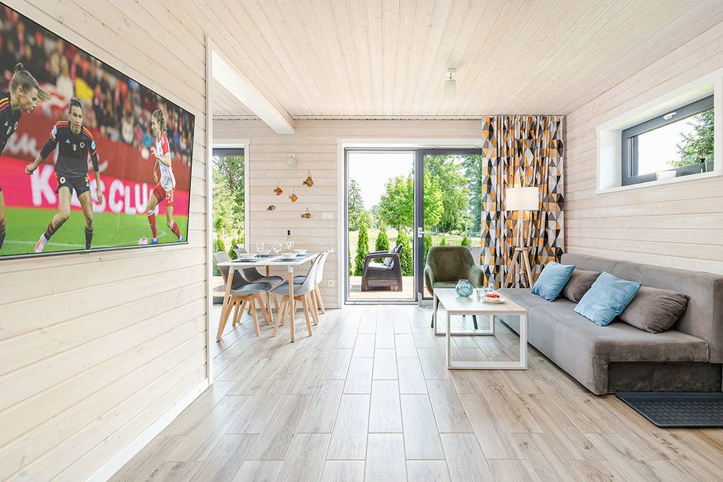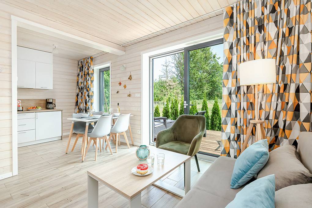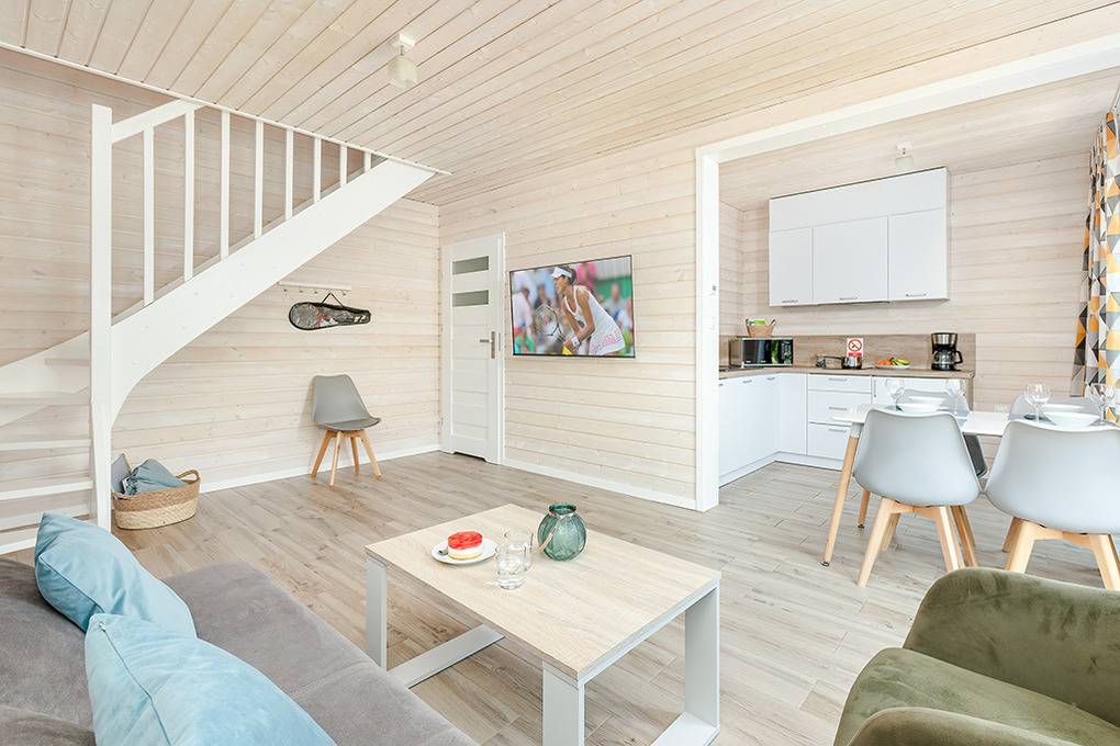 PL 20.60 Ferienhaus 1-6 Pers.: Helles 3-Zimmerhaus mit ca. 67 qm Wohnfläche über 2 Etagen. Parterre: Wohn-/Essraum mit Sofa (Ausziehcouch 2 Pers.), Flachbild SMART-TV mit deutschen Programmen (Sat-TV), großem Esstisch, gut ausgestatteter Küchenzeile (Induktionsherd 2-Platten, Abzugshaube, Mikrowelle, Spülmaschine). Modernes Bad mit ebenerdiger Dusche, Wb, WC. Von Wohnzimmer Treppe in die 1. Etage: Doppelzimmer, Zweibettzimmer. Terrasse mit Sitzmöbeln, Grill, Blick auf den davorliegenden Garten.