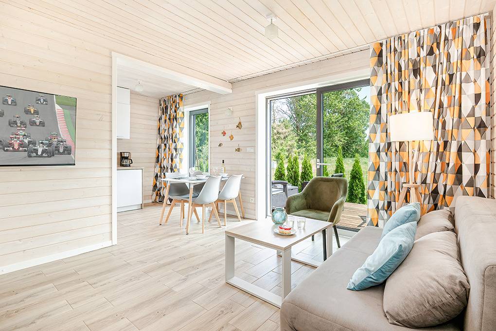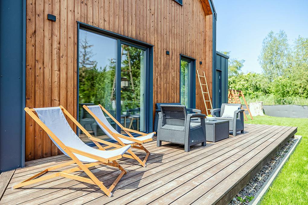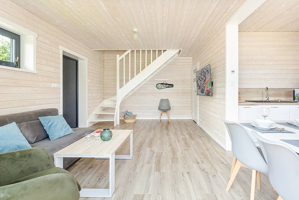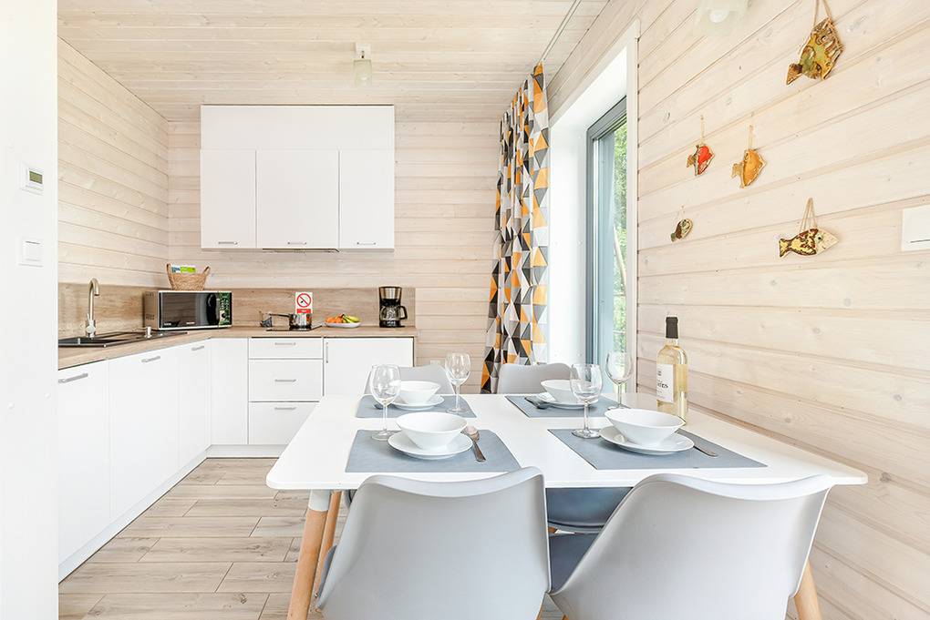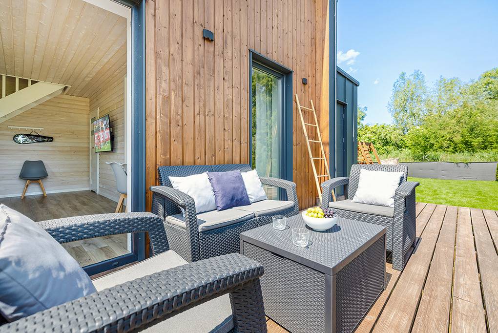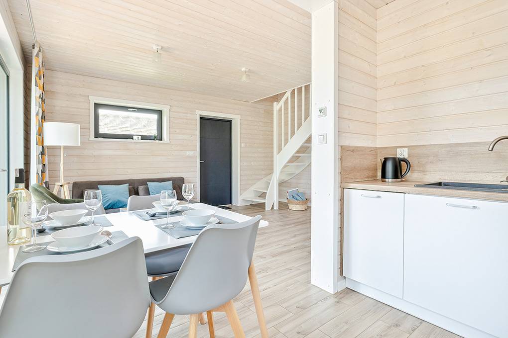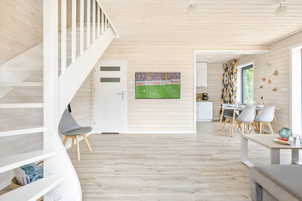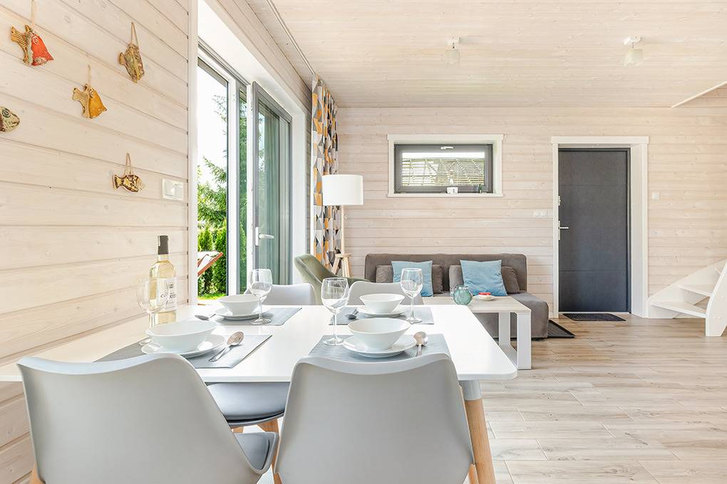 PL 20.60 Ferienhaus 1-6 Pers.: Helles 3-Zimmerhaus mit ca. 67 qm Wohnfläche über 2 Etagen. Parterre: Wohn-/Essraum mit Sofa (Ausziehcouch 2 Pers.), Flachbild SMART-TV mit deutschen Programmen (Sat-TV), großem Esstisch, gut ausgestatteter Küchenzeile (Induktionsherd 2-Platten, Abzugshaube, Mikrowelle, Spülmaschine). Modernes Bad mit ebenerdiger Dusche, Wb, WC. Von Wohnzimmer Treppe in die 1. Etage: Doppelzimmer, Zweibettzimmer. Terrasse mit Sitzmöbeln, Grill, Blick auf den davorliegenden Garten.