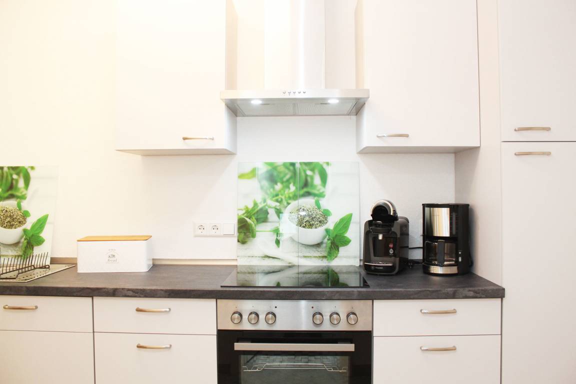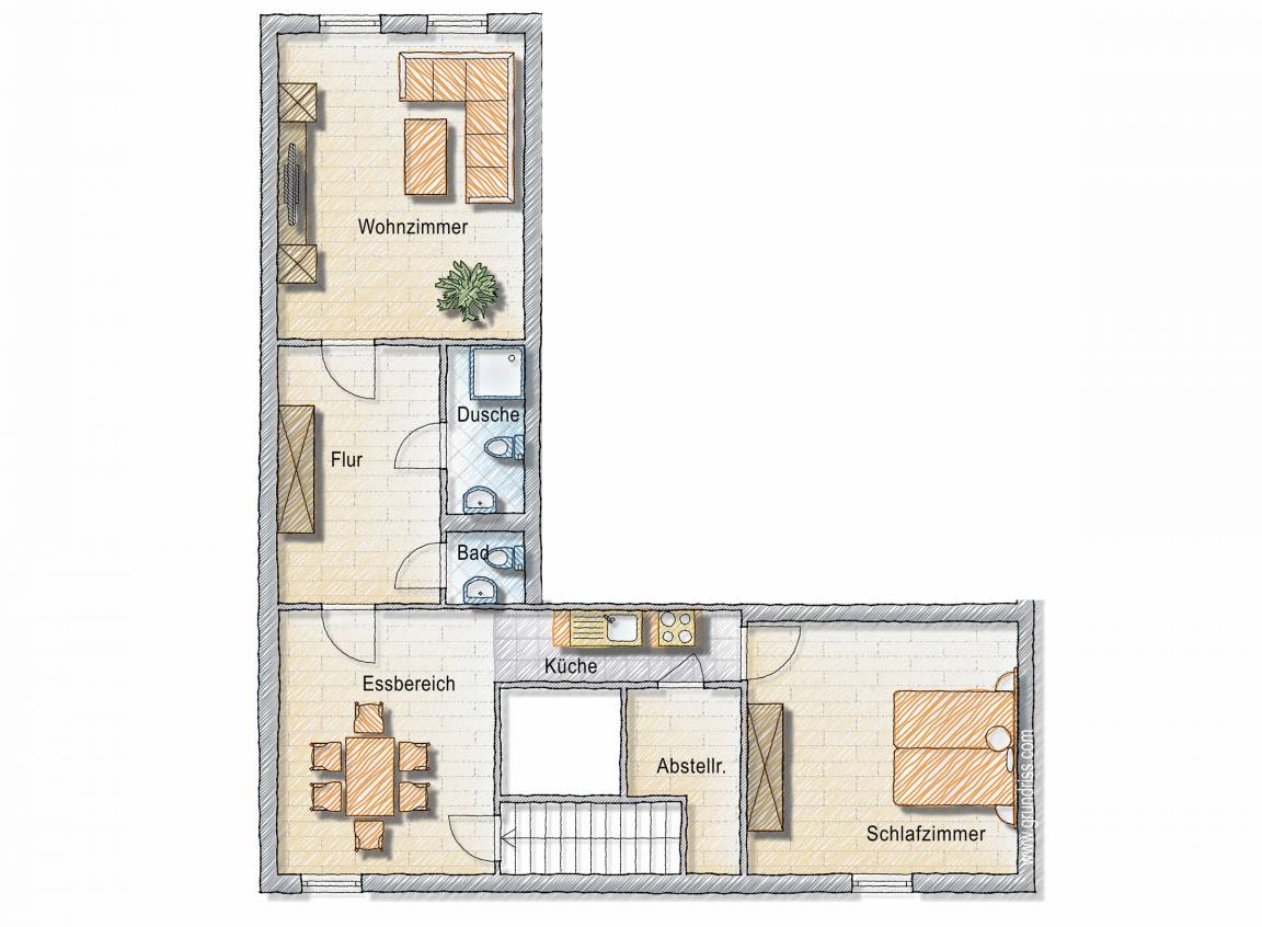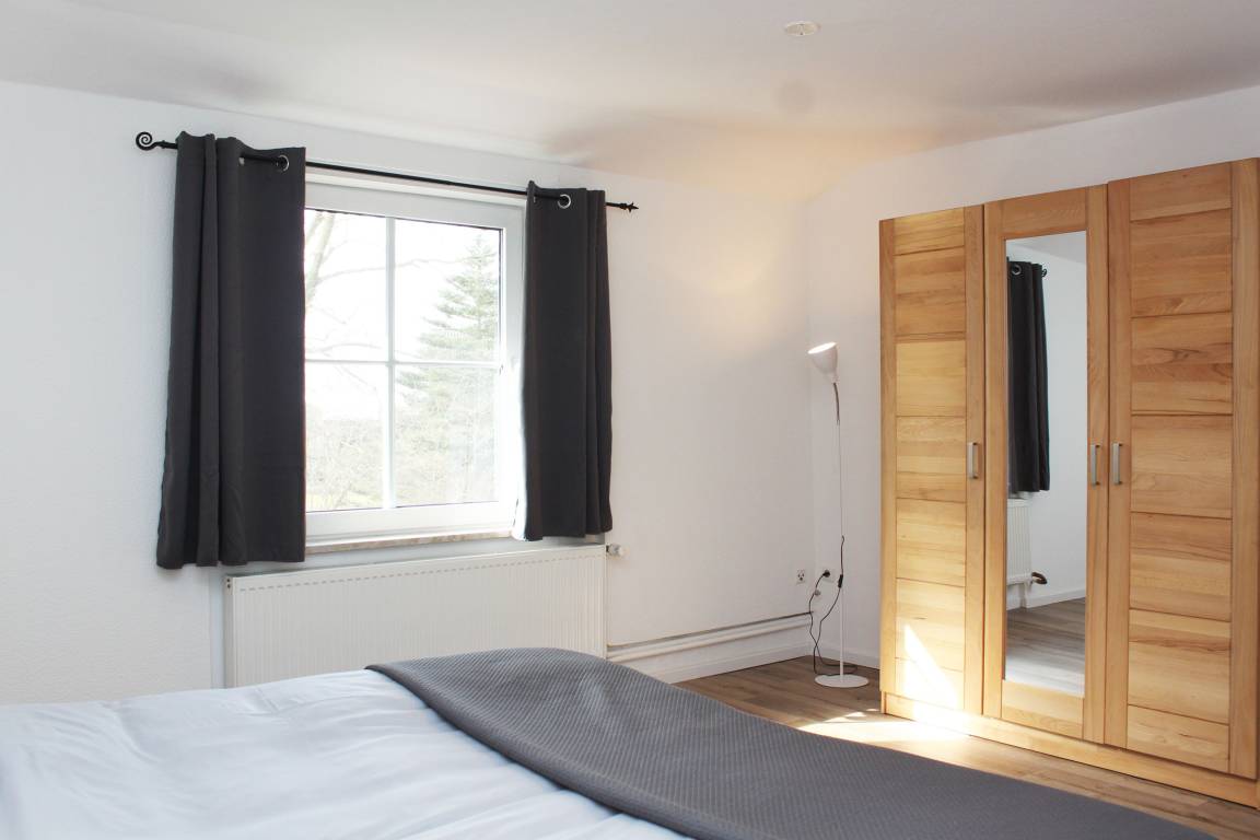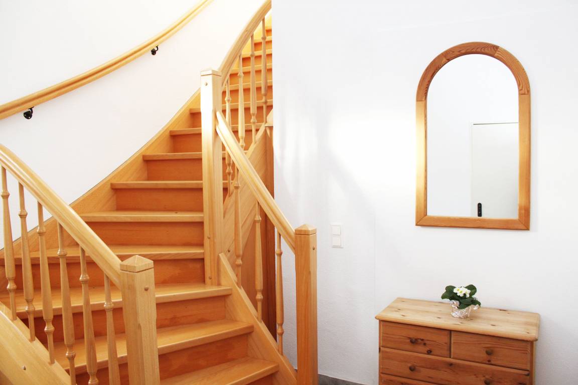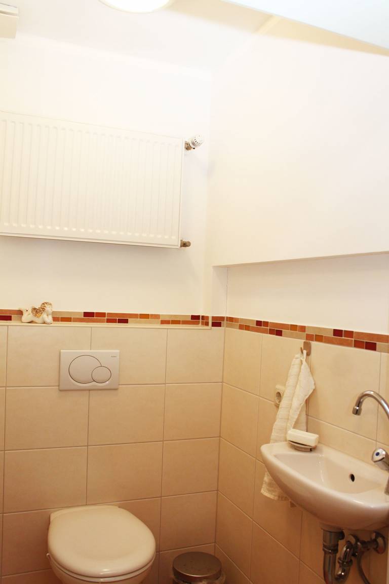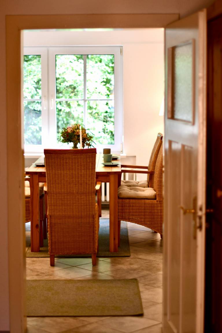 Sie erreichen die Wohnung im 1. Stock über ein geräumiges Treppenhaus. Die offene Küche mit großzügigem Essbereich lässt das Kochen zum Vergnügen werden. Im Schlafzimmer mit Doppelbett findet auch ein zusätzliches Reisebett Platz. Das helle Wohnzimmer mit gemütlichem Schlafsofa, Sessel und TV eröffnet den Blick auf den Hof. Das Bad ist mit einer bodengleichen Dusche ausgestattet, das separate WC befindet sich direkt nebenan. Der praktische Abstellraum direkt neben der Küche komplettiert das Platzangebot.