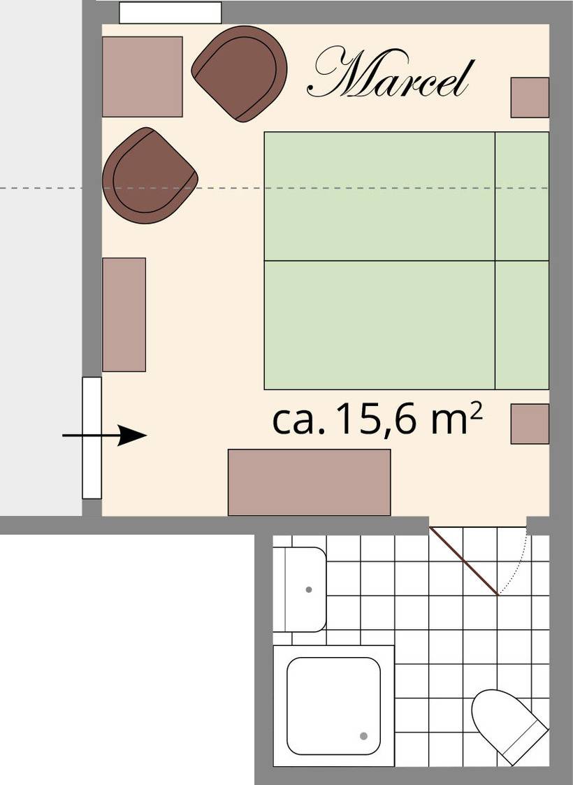 Es ist über eine Holzwendeltreppe mit 16 Stufen und anschließend über eine weitere, etwas steilere Holztreppe mit 13 Stufen erreichbar, die beide mit einem stabilen Holzhandlauf ausgestattet sind. Im 1. Obergeschoss erwartet Sie ein stilvoll eingerichteter Aufenthaltsraum mit Schreibtisch und Infomaterial sowie ein Tisch mit 4 Stühlen. Das Zimmer Marcel verfügt über ein separates Badezimmer mit Dusche/WC sowie ein Boxspringbett. Das liegende Dachfenster ist nach Süden ausgerichtet und blickt auf Bauernwirtschaft und Innenhof. Zur weiteren Ausstattung gehören ein Sat-TV, der an der Wand montiert ist, ein Kleiderschrank, eine Kommode sowie einen Couchtisch mit 2 Sesseln. Im Bad liegt ein Haartrockner bereit. WLAN steht im Zimmer als auch in der Gaststätte zur Verfügung.