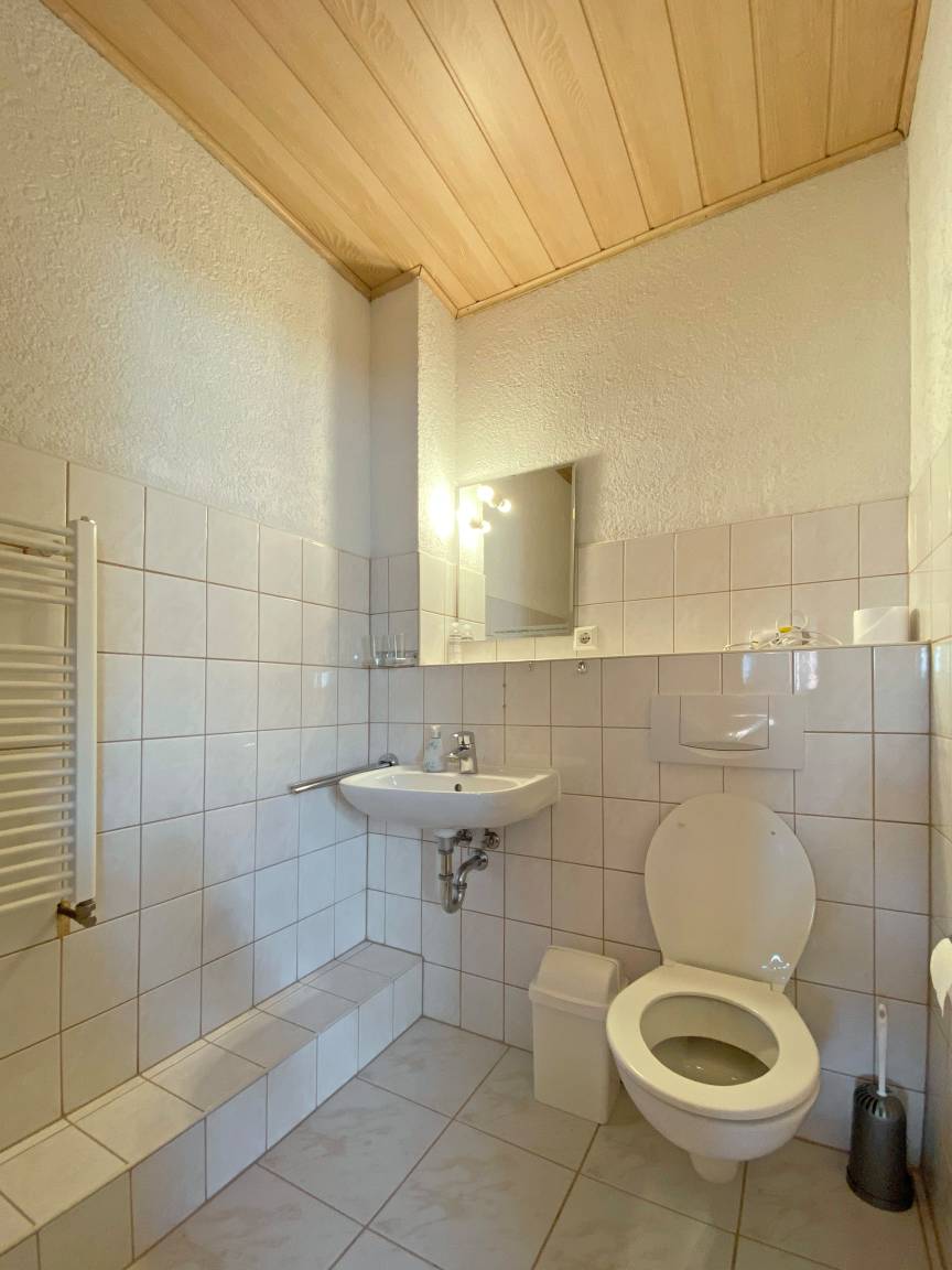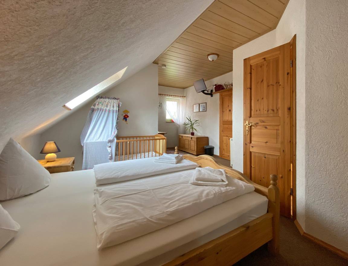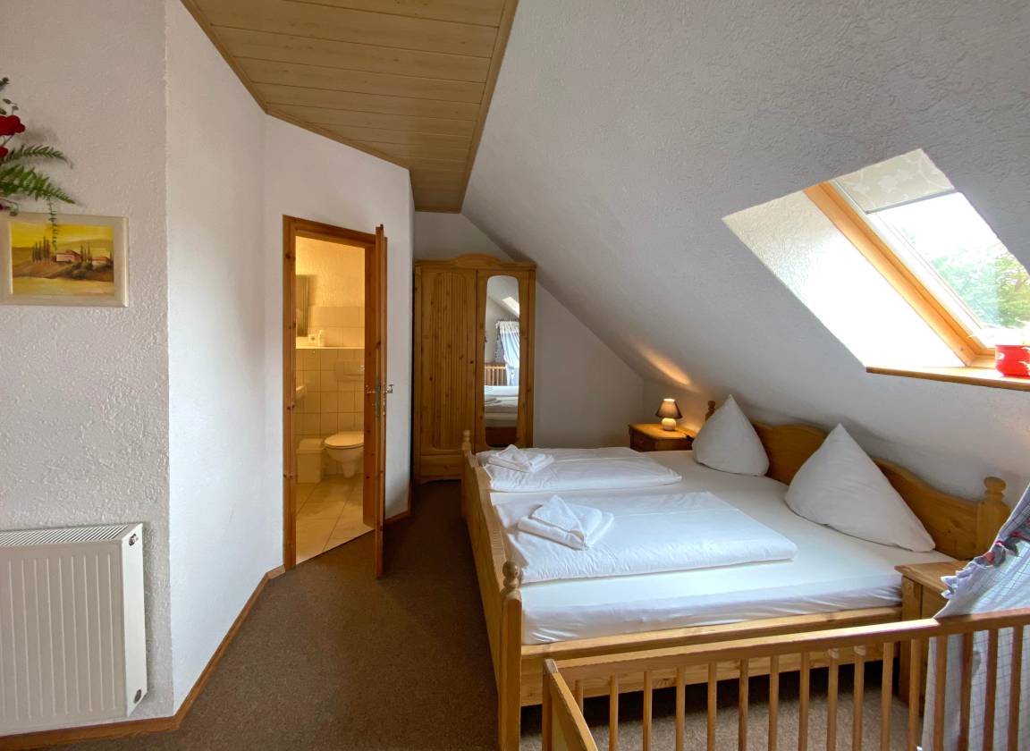 Es verfügt über 3 Fenster, von denen das liegende Dachfenster in westlicher Richtung zeigt und 2 Fenster auf der Giebelseite des Hauses, die nach Norden ausgerichtet ist. Das Dachfenster lässt sich mit einer textilen Jalousie verdunkeln. Das Zimmer ist über eine massive Treppe mit 36 Stufen erreichbar, die durchgehend mit einem stabilen Metallgeländer ausgestattet ist. Es ist im ländlichen Stil eingerichtet und verfügt über ein separates Bad mit Du/WC sowie über ein Kinderbett. Durch einen Raumteiler wird das Kinderbett von einer gemütlichen Sitzecke abgeschirmt. Zur weiteren Ausstattung gehören ein Sat-TV, der unter der Zimmerdecke angebracht ist, ein Tisch, 3 Stühle, ein Sofa, eine Truhe, ein Kleiderschrank und 2 Nachttischschränkchen. Im Bad liegt ein Haartrockner bereit. WLAN steht im Zimmer sowie in der Gaststätte zur Verfügung.