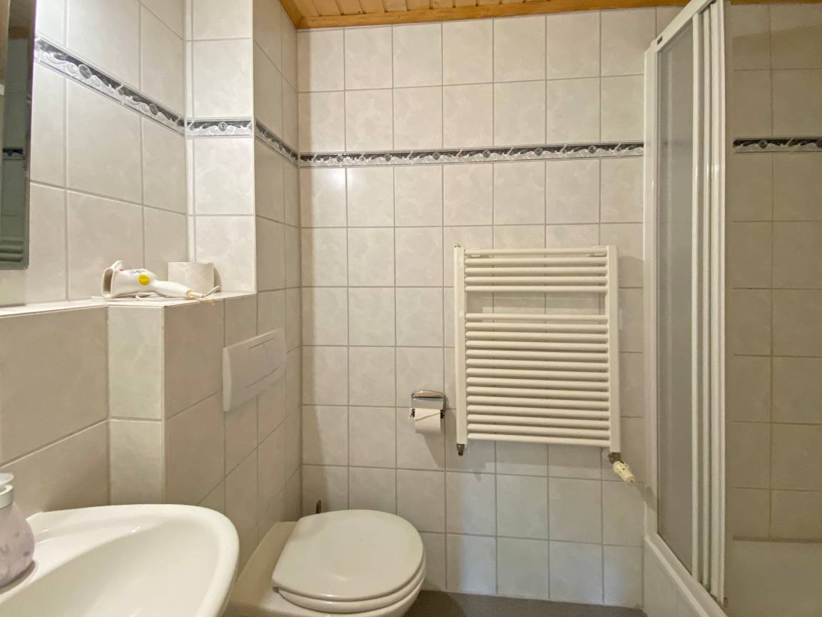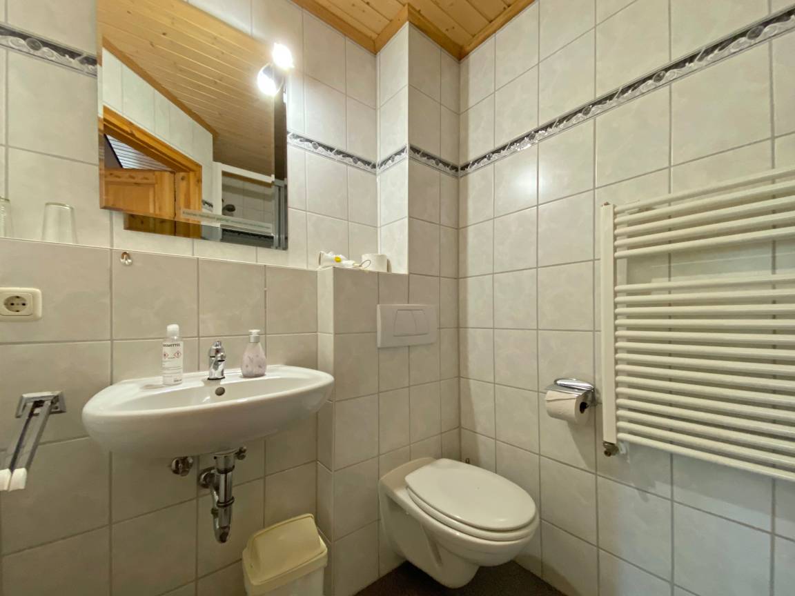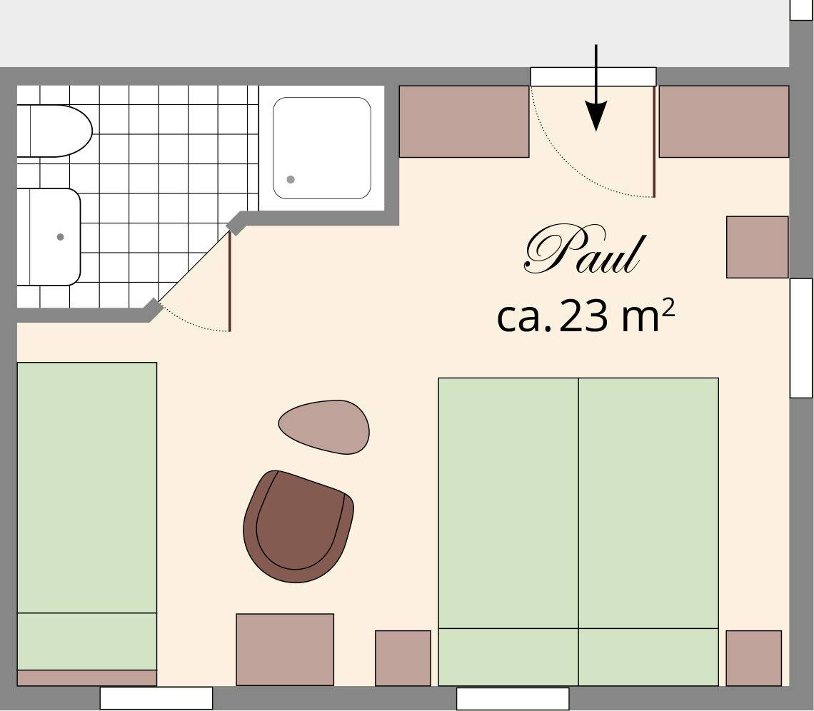 Der Weg zur Gaststätte „Bauernwirtschaft" beträgt ca. 100 m. Das Zimmer ist über eine massive Treppe mit 18 bequemen Stufen erreichbar, die durchgehend mit einem stabilen Holzhandlauf ausgestattet ist. Die Durchgangshöhe durch ein Gewölbe im Erdgeschoss beträgt 1,90 m. 2 nach Osten ausgerichtete Fenster blicken über den Innenhof. Das Zimmer verfügt über ein Doppel- und ein Einzelbett sowie ein separates Bad mit Du/WC. Zur weiteren Ausstattung des Zimmers gehören ein Sat-TV, der unter der Zimmerdecke montiert ist, eine Schrankwand mit einem Spiegel, ein Beistelltisch mit Sessel, 2 Nachttischschränkchen, ein Hocker, ein Standventilator und eine Vitrine-Regal-Kombi. Im Bad liegt ein Haartrockner bereit. WLAN steht im Zimmer als auch in der Gaststätte zur Verfügung.