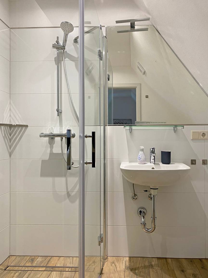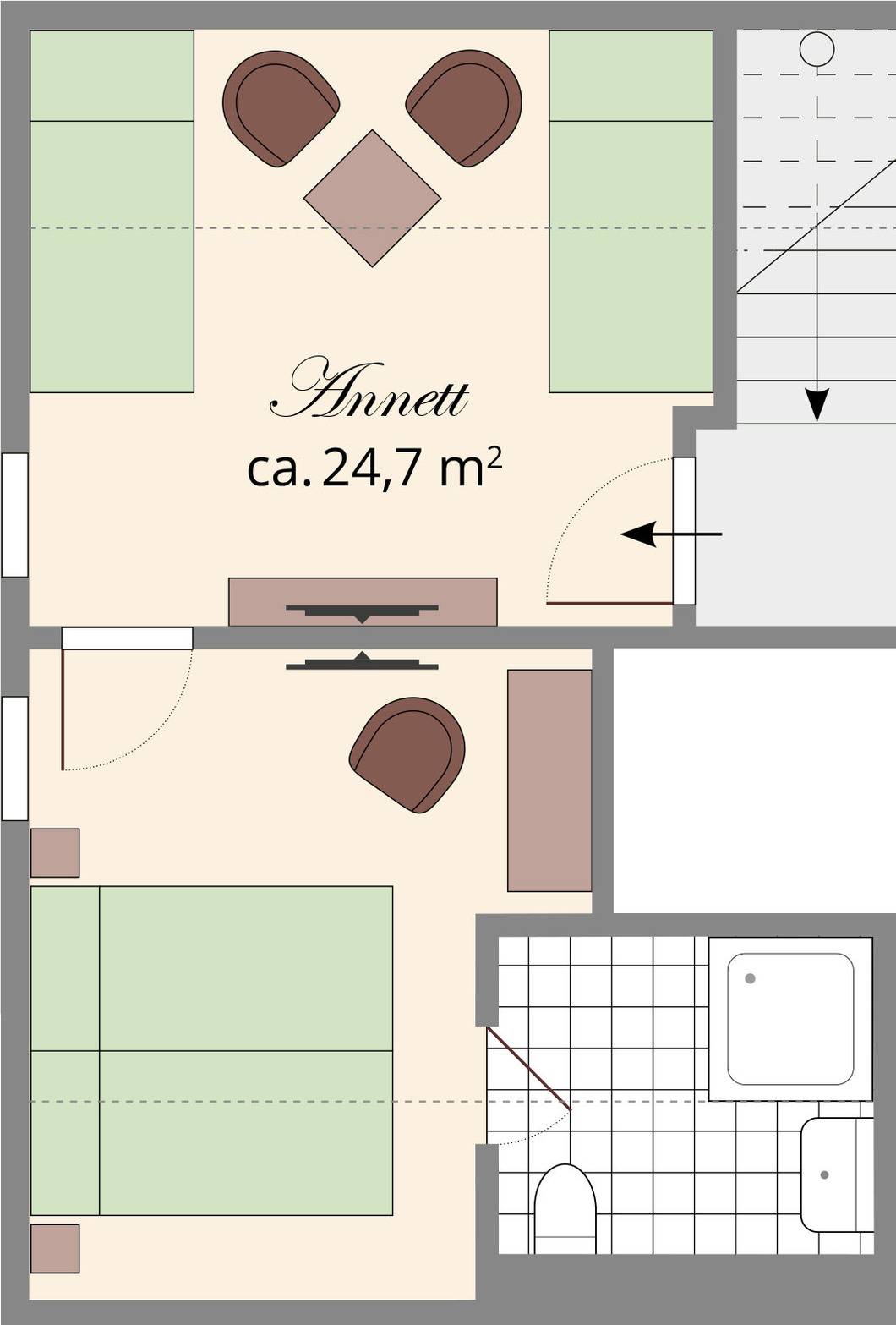 Es ist über eine Holzwendeltreppe mit 16 Stufen und anschließend über eine weitere, etwas steilere Holztreppe mit 13 Stufen erreichbar, die beide mit einem stabilen Holzhandlauf ausgestattet sind. Im 1. Obergeschoss erwartet Sie ein stilvoll eingerichteter Aufenthaltsraum mit Schreibtisch und Infomaterial. Das Zimmer Annett verfügt über 2 Aufenthalts- und Schlafräume, deren Fenster nach Osten ausgerichtet sind sowie ein separates Badezimmer mit Dusche/WC. Eine leicht gewinkelte Dachschräge verleiht den Räumen eine behagliche Atmosphäre. Beide Zimmer sind durch eine Tür getrennt. Der erste Raum ist mit 2 Einzelbetten, einem Couchtisch mit 2 bequemen Sesseln, einem Sat-TV und einer Kommode ausgestattet. Zur Ausstattung des zweiten Zimmers gehören ein Doppelbett, ein Sat-TV, ein Kleiderschrank mit integriertem Spiegel und ein Sessel. Durch diesen Raum gelangt man in das moderne Bad mit Vollglas-Duschkabine. Dort liegt auch ein Haartrockner bereit. WLAN steht im Zimmer als auch in der Gaststätte zur Verfügung.