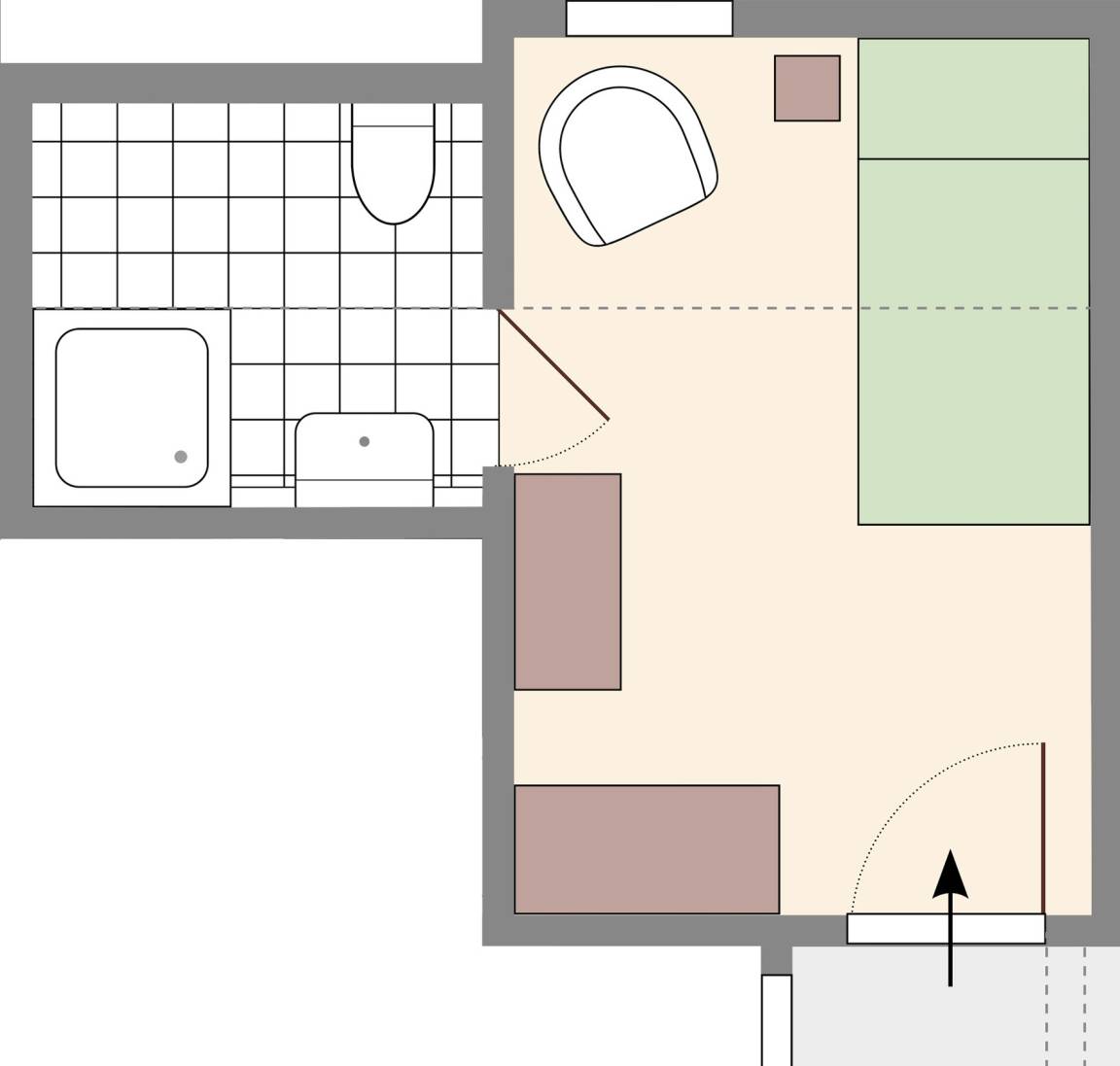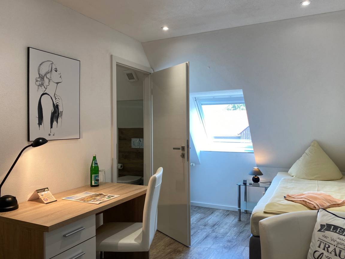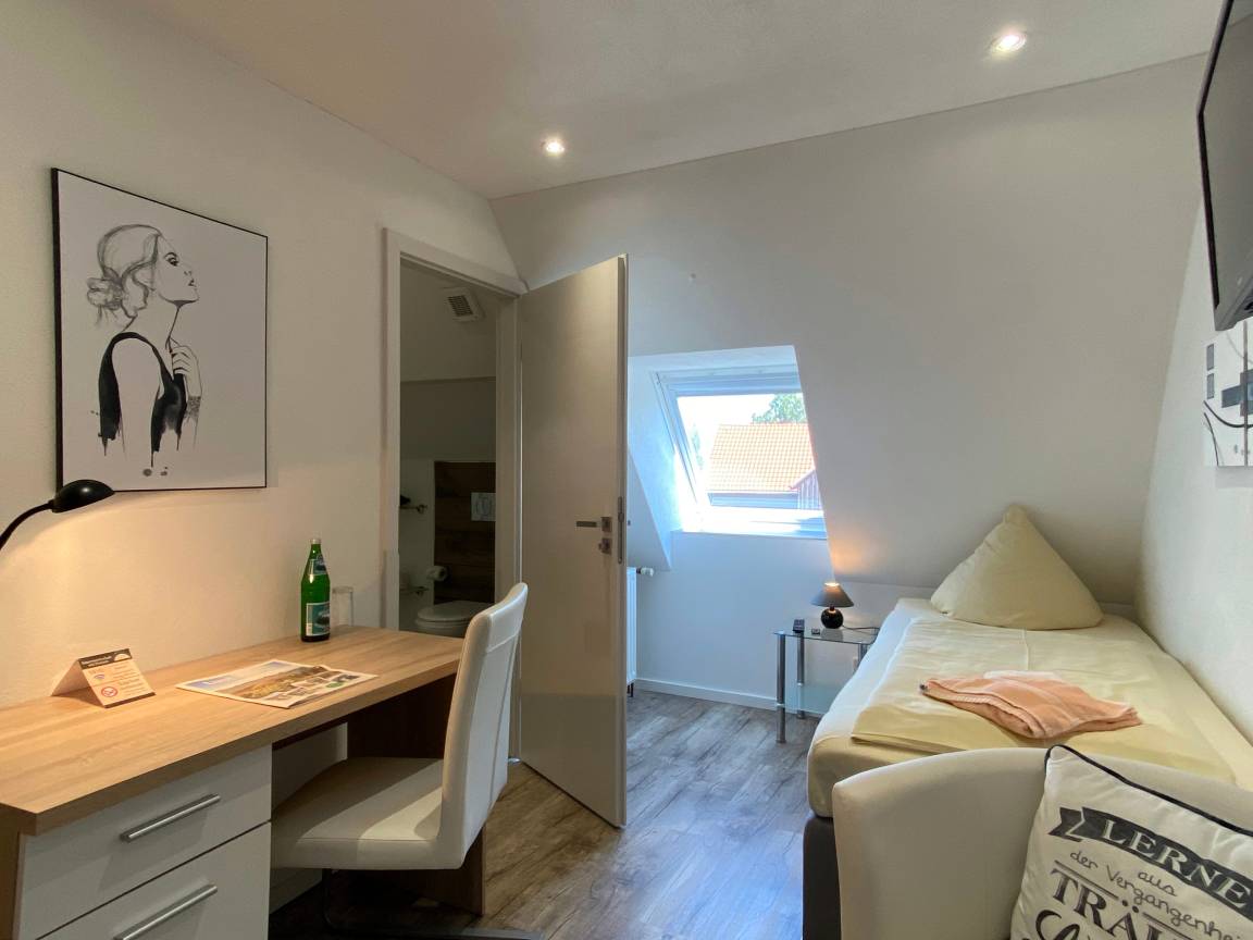 Das im Jahr 2021 renovierte, modern eingerichtete Einzelzimmer mit Wandschräge befindet sich im 2. Obergeschoss des Weihnachtshauses in unmittelbarer Nachbarschaft zu unserer Bauernwirtschaft.