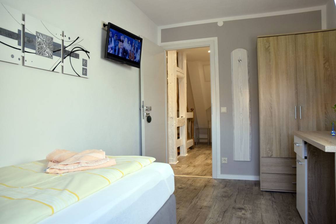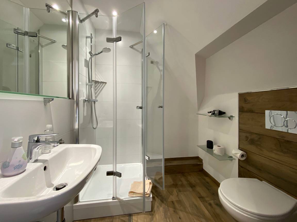 Es ist über eine Holzwendeltreppe mit 16 Stufen und anschließend über eine weitere, etwas steilere Holztreppe mit 13 Stufen erreichbar, die beide mit einem stabilen Holzhandlauf ausgestattet sind. Im 1. Obergeschoss erwartet Sie ein stilvoll eingerichteter Aufenthaltsraum mit Schreibtisch und Infomaterial sowie ein Tisch mit 4 Stühlen. Das Zimmer Louise verfügt über ein separates Badezimmer mit Dusche/WC sowie ein Boxspringbett. Das liegende Dachfenster ist nach Norden ausgerichtet und blickt auf den ruhigen Wirtschaftshof. Zur weiteren Ausstattung gehören ein Sat-TV, der an der Wand montiert ist, ein Kleiderschrank, ein Schreibtisch mit Stuhl sowie ein Sessel. Das moderne Bad verfügt über eine Vollglas-Duschkabine, ein Haartrockner liegt bereit. WLAN steht im Zimmer als auch in der Gaststätte zur Verfügung.