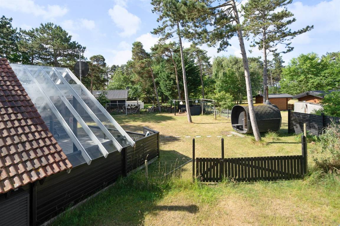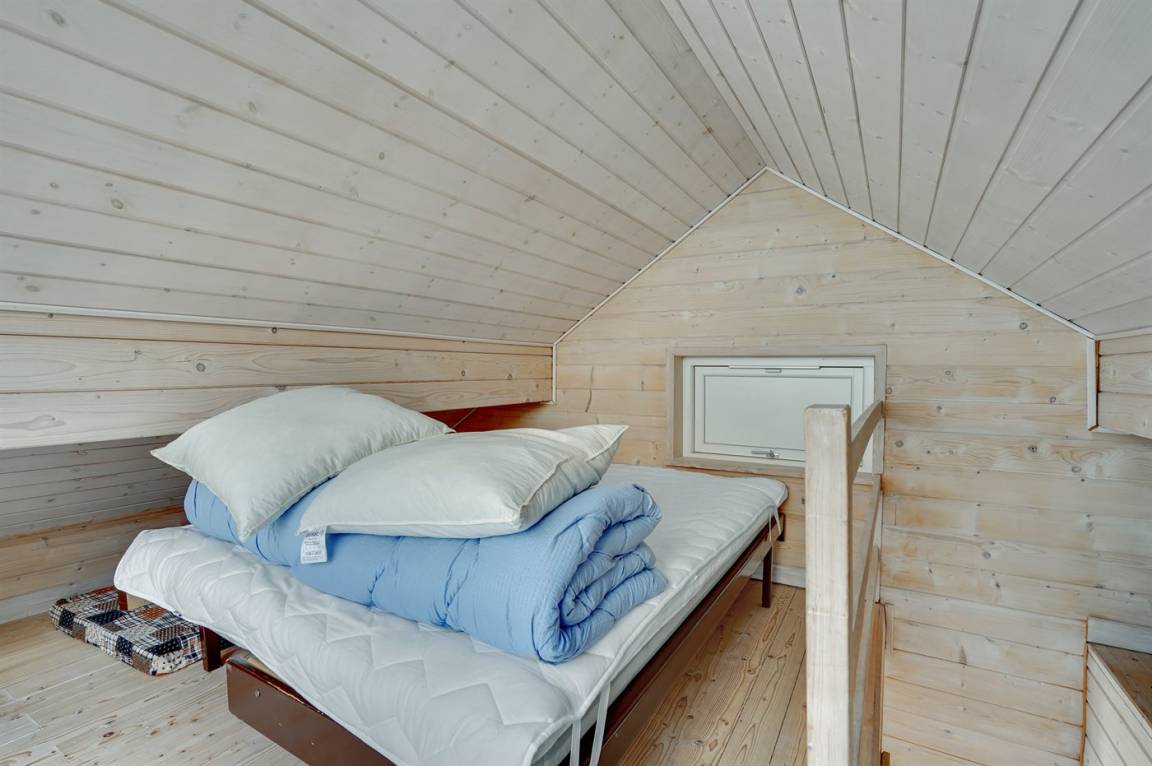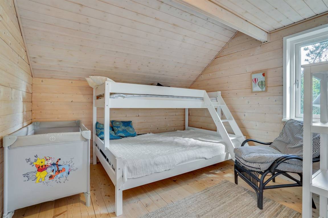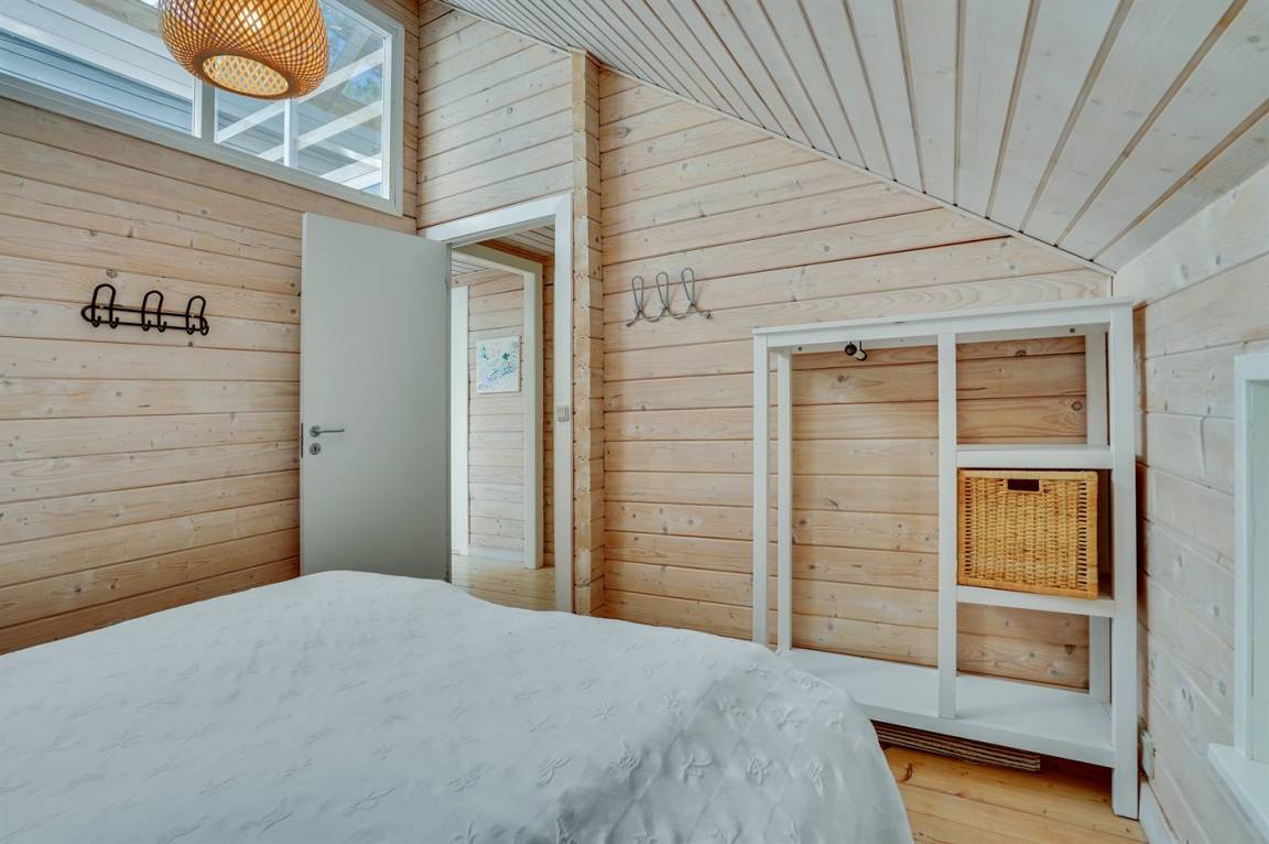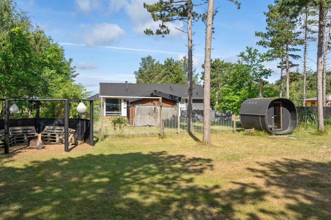 Dicht an einem kinderfreundlichen Badestrand, in einer ruhigen Ferienhaussiedlung, finden Sie dieses Ferienhaus auf einem Grundstück mit hohen Bäumen. Das Haus ist mit einem offenen Obergeschoss mit 2 Matratzen eingerichtet.