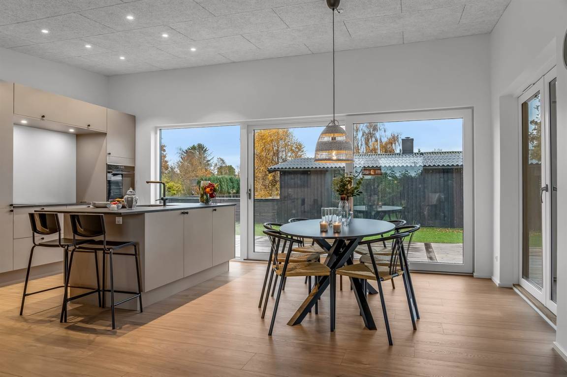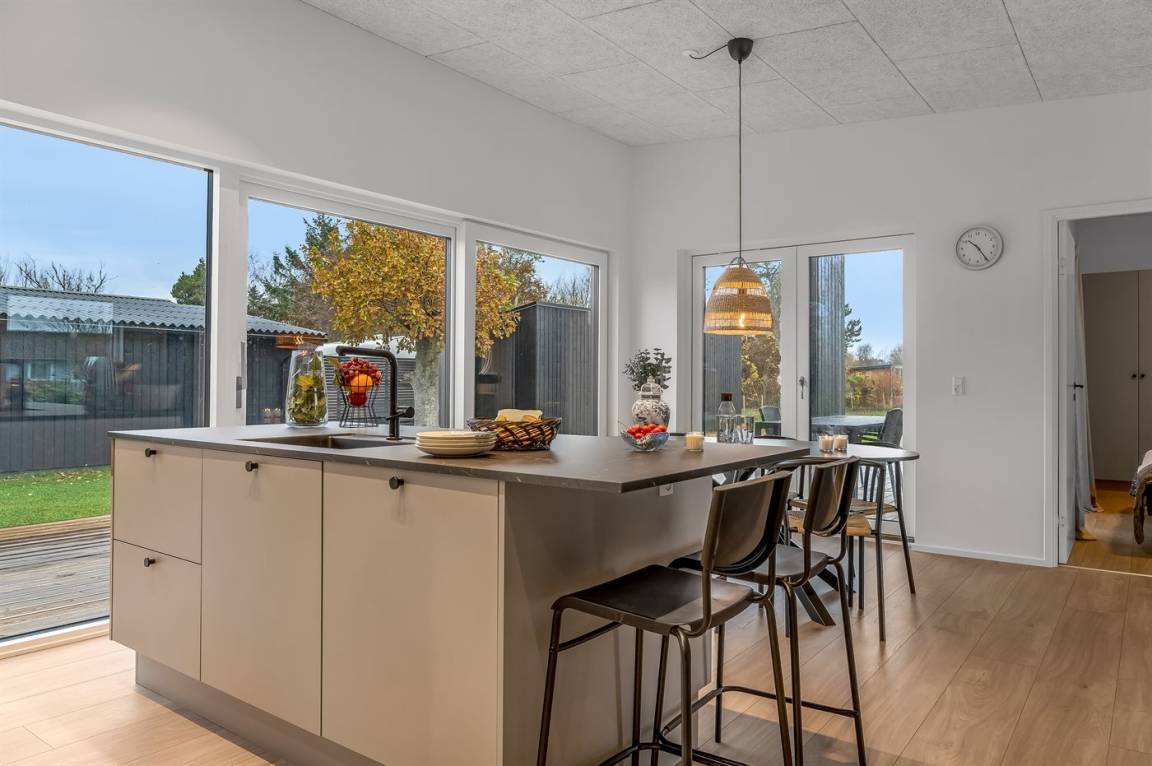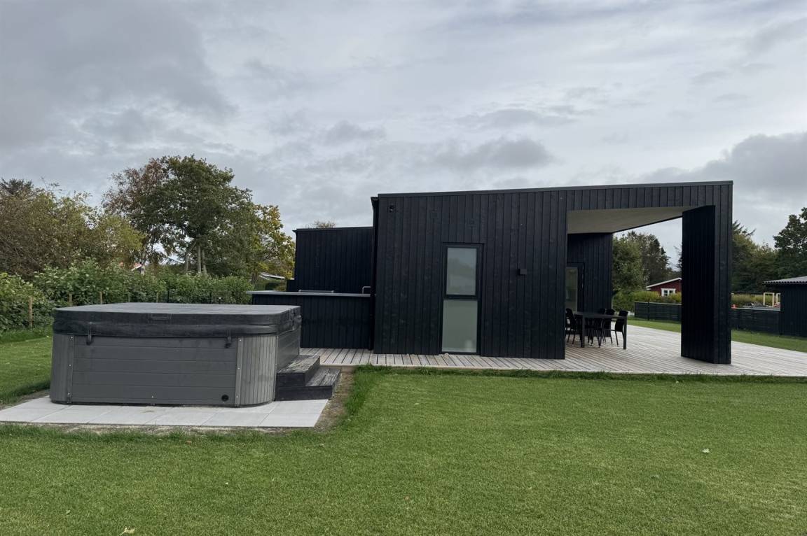 DraußenDie Ferienunterkunft liegt auf einem 1205 m² großen Naturgrundstück. Das Grundstück ist eingezäunt. Die Entfernung zum Meer beträgt 1000 m. Die Entfernung zum Fjord beträgt 180 m. Die nächste Einkaufsmöglichkeit liegt 1900 m entfernt. In einem Abstand von 2890 m gibt es einen Golfplatz. Es steht ein offenes Terrassenareal zur Verfügung. Außerdem gibt es überdachte Terrasse.Es beteht die Möglichkeit das Essen in der Außenküche zuzubereiten. Es steht ein Grill zur Verfügung. Parkplatz auf dem Grundstück.
