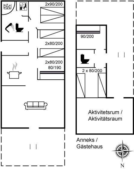 MultimedienIn der Ferienunterkunft gibt es einen Fernseher. DVD-Player. Radio. Stereoanlage. CD-Player.Playstation 3. Mindestens 4 dänische Fernsehsender. Mindestens 4 deutsche Fernsehsender. Es steht kabellose Internetverbindung zur Verfügung.